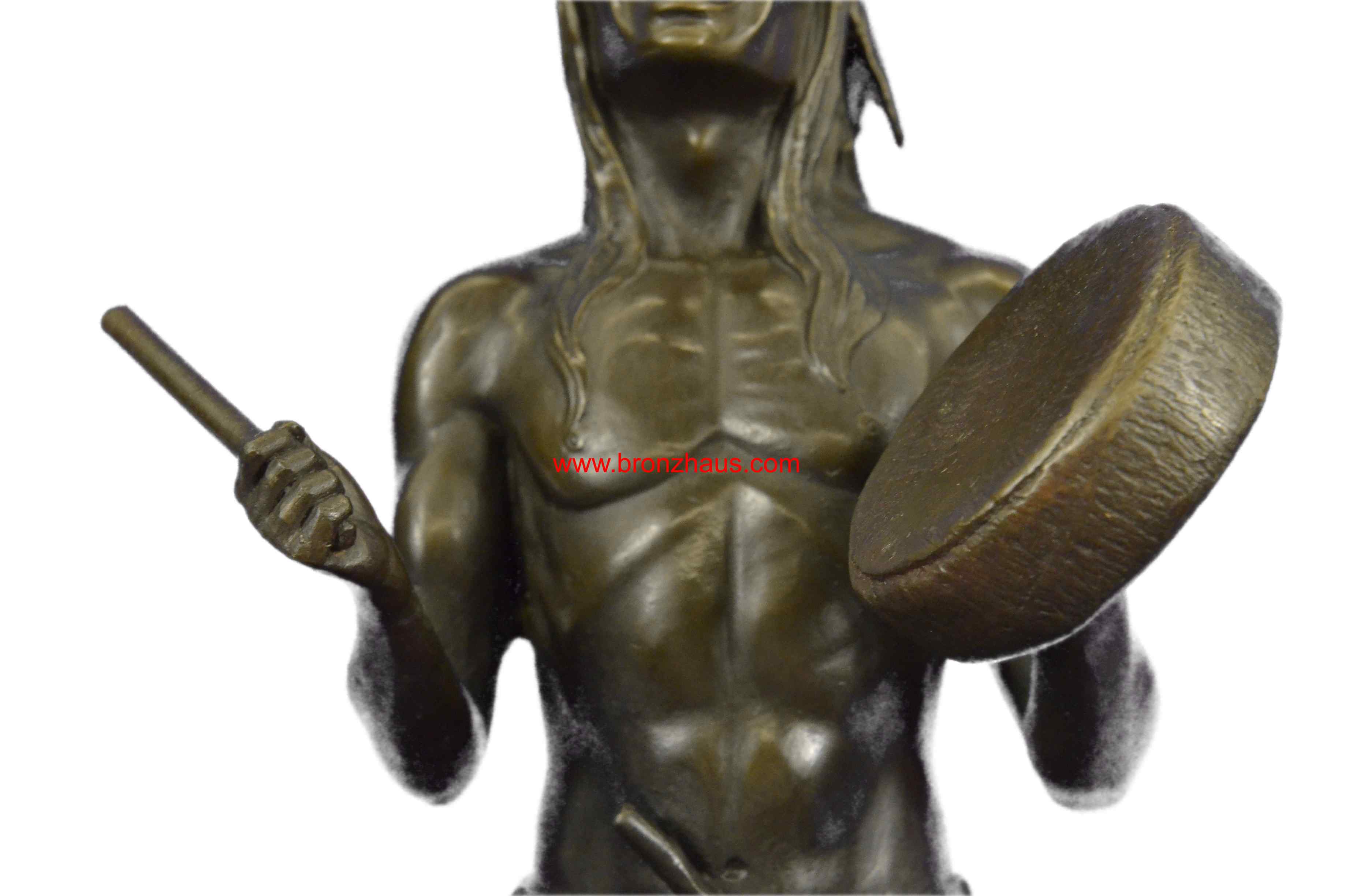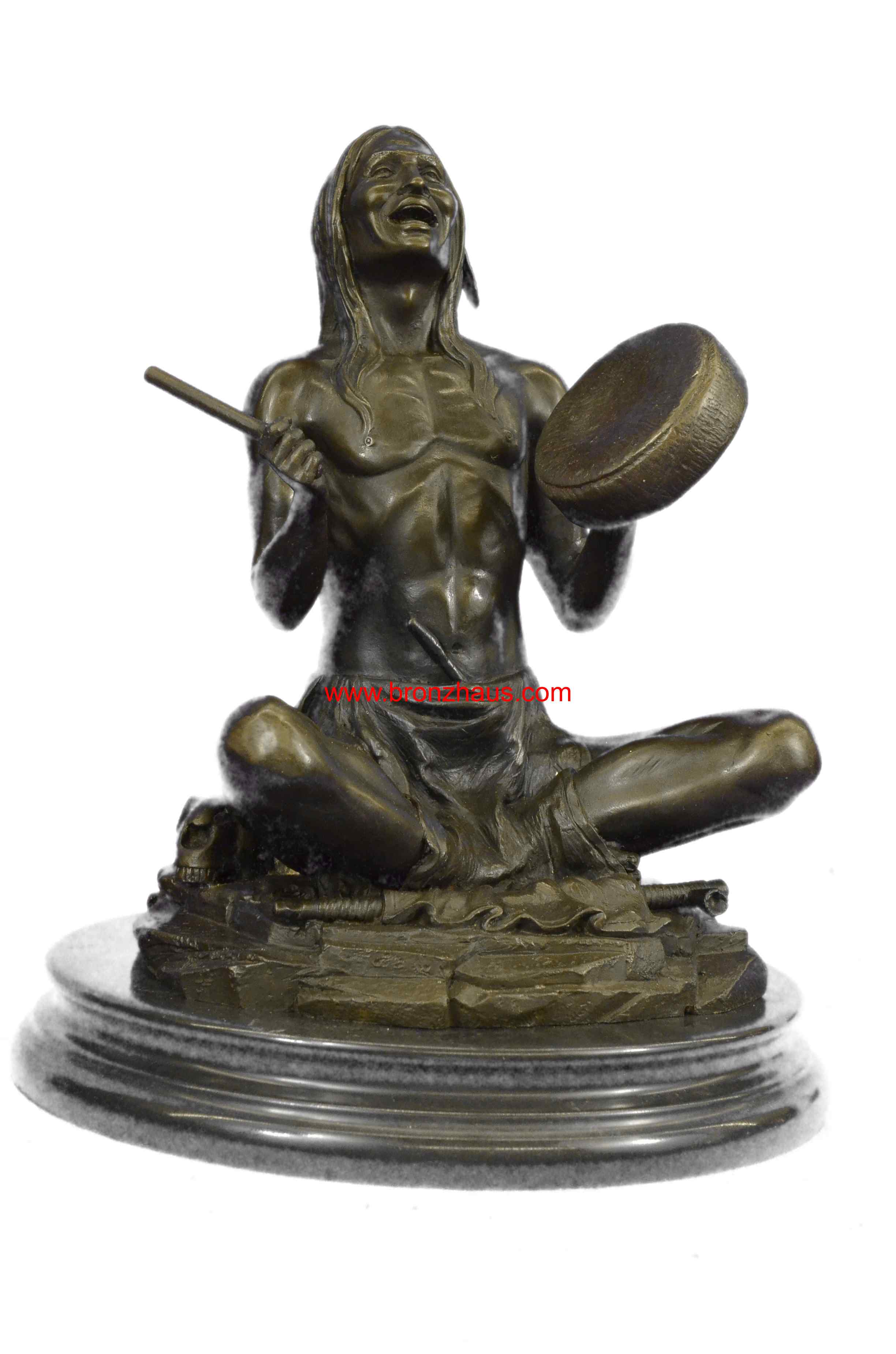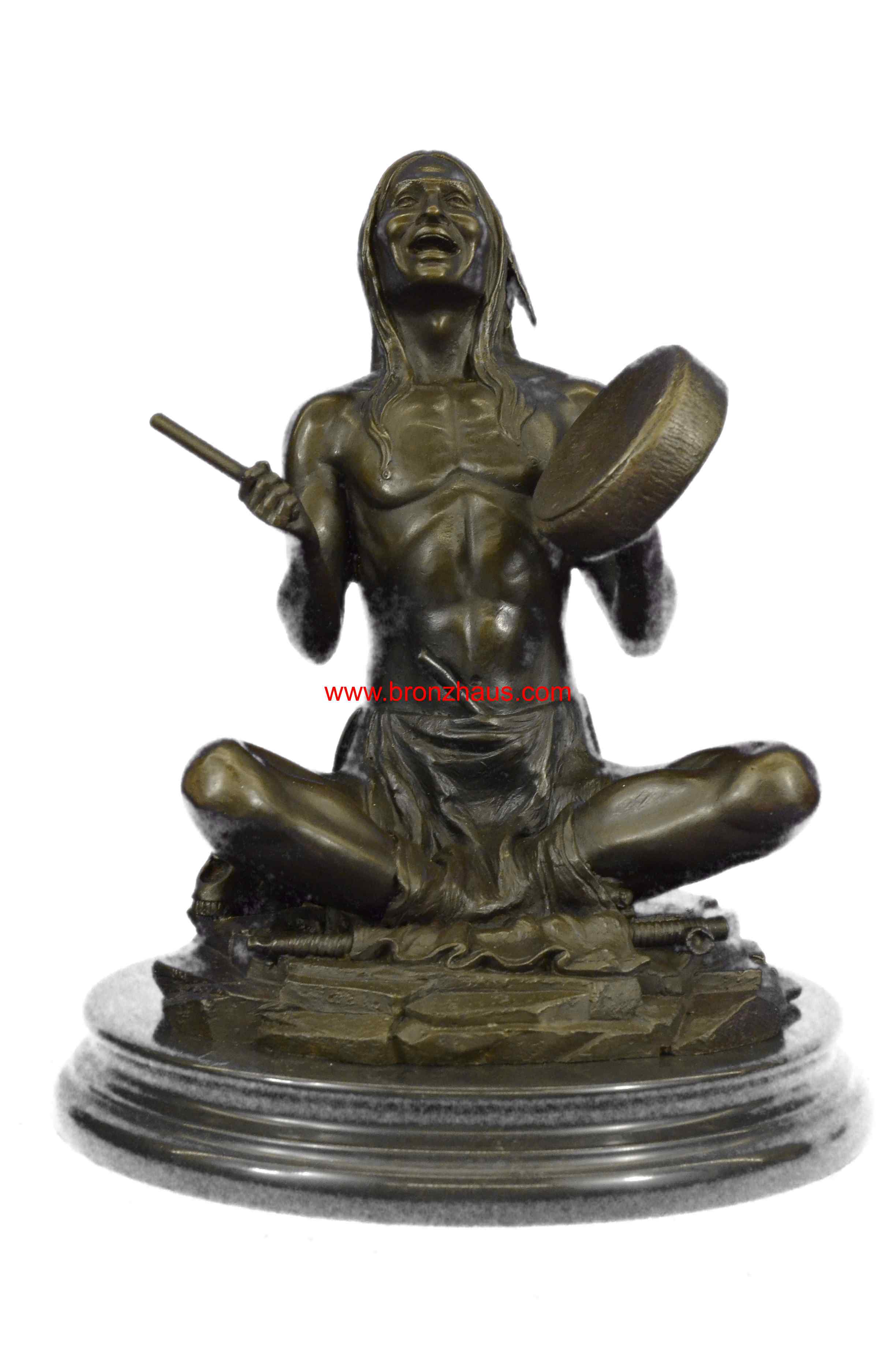 The shaman Native American Indian sits indian-style, chanting prayers, banging on a small hand drum, in hopes of communicating with the spirit world. Shamanism encompasses the belief that shamans are intermediaries or messengers between the human world and the spirit worlds. Shamans are said to treat ailments and illness by mending the soul. Alleviating traumas affecting the spirit restores the physical body of the individual to balance and wholeness.The texture of the sculpture seems to capture the medicine man in an interval dimension between the earth and that of the spirit world; as though a certain mysterious vibration has taken hold of him, blurring the distinction of the lines of his body. The handmade bronze sculpture was molded using the archaic method of lost-wax casting and stained with a brown patina finish for preservation. It is mounted upon a black marble base with the artist J.Debut`s signatureOriginal or Reproduction: Reproduction