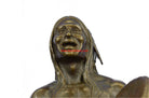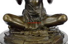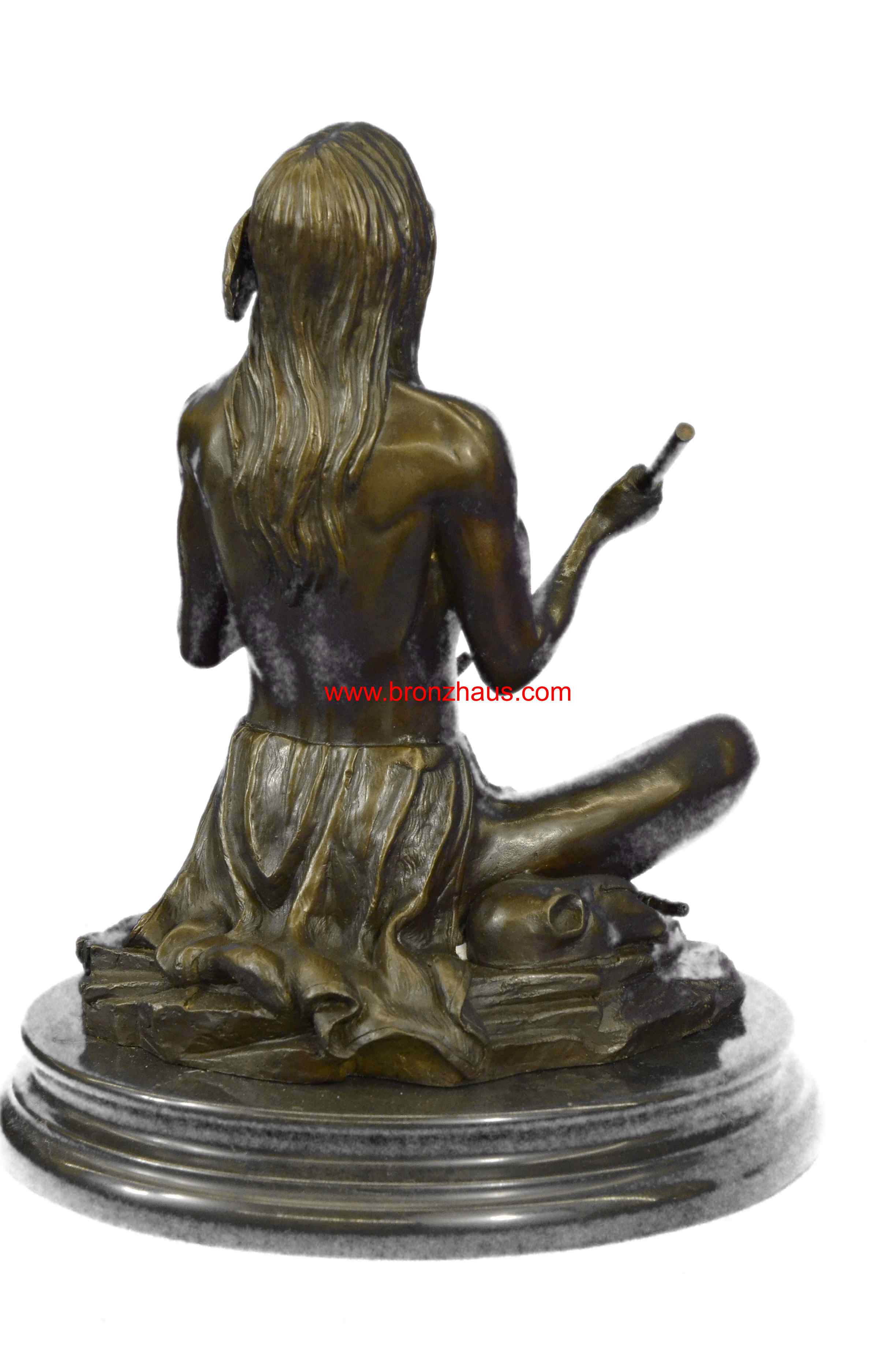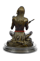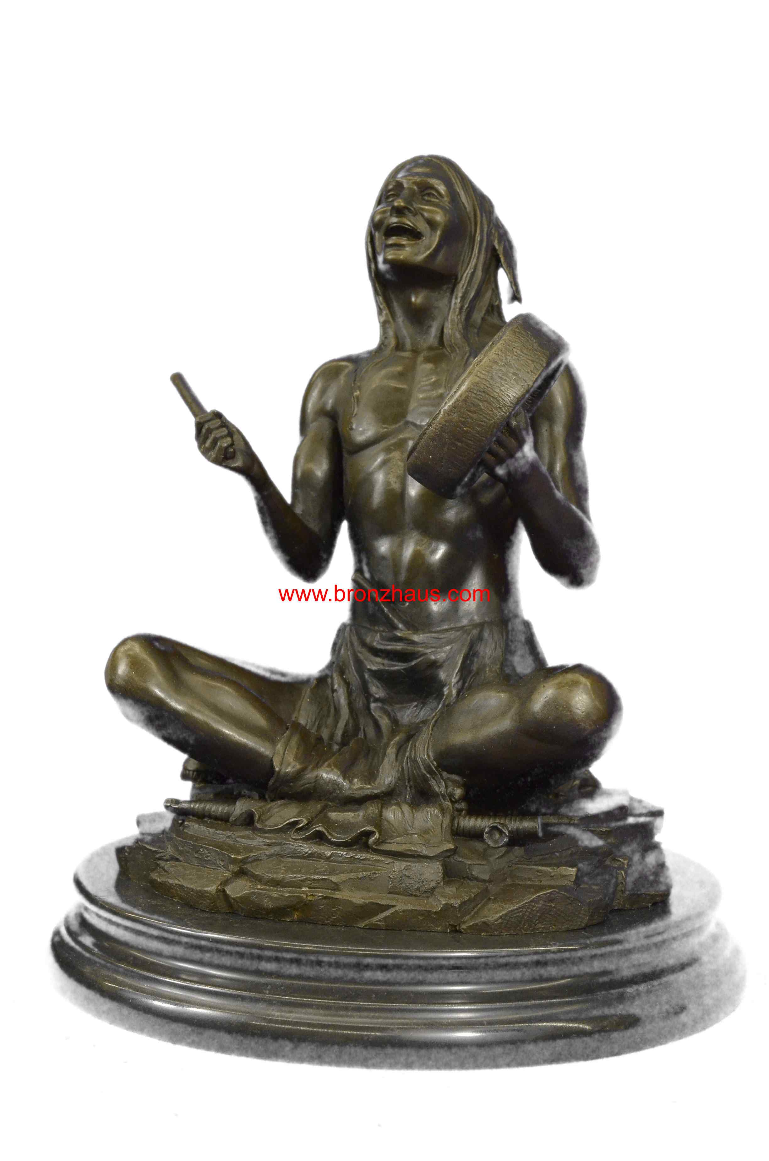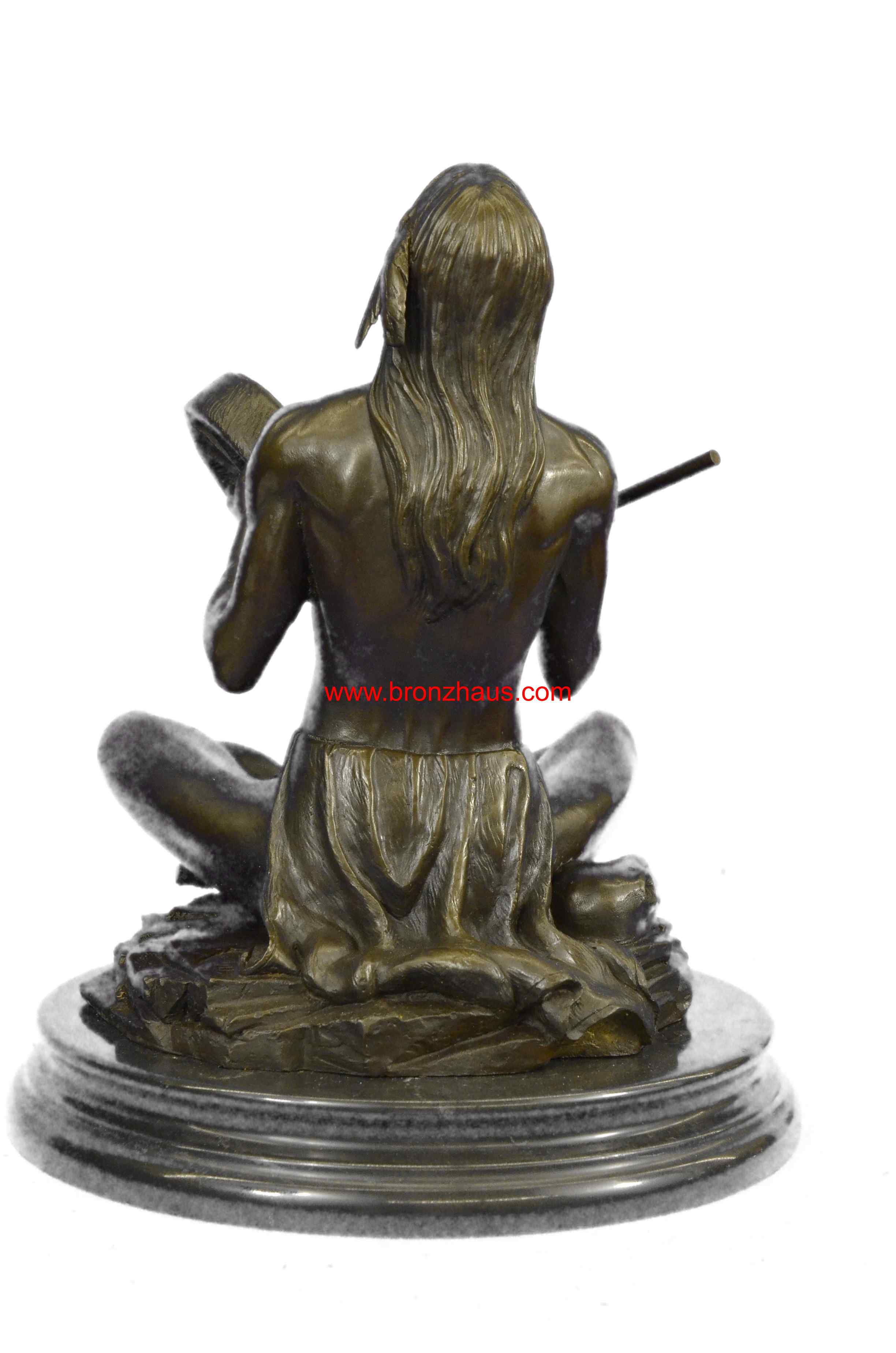 The shaman Native American Indian sits indian-style, chanting prayers, banging on a small hand drum, in hopes of communicating with the spirit world. Shamanism encompasses the belief that shamans are intermediaries or messengers between the human world and the spirit worlds. Shamans are said to treat ailments and illness by mending the soul. Alleviating traumas affecting the spirit restores the physical body of the individual to balance and wholeness.The texture of the sculpture seems to capture the medicine man in an interval dimension between the earth and that of the spirit world; as though a certain mysterious vibration has taken hold of him, blurring the distinction of the lines of his body. The handmade bronze sculpture was molded using the archaic method of lost-wax casting and stained with a brown patina finish for preservation. It is mounted upon a black marble base with the artist J.Debut`s signatureOriginal or Reproduction: Reproduction
