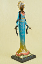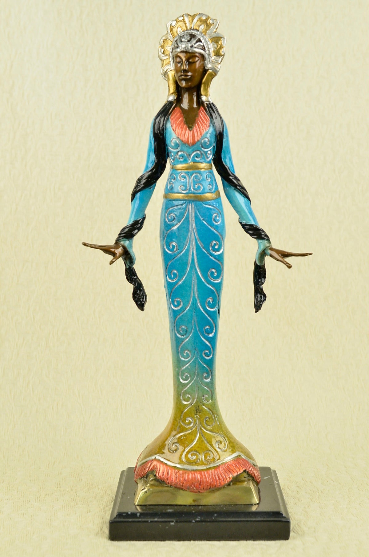 A fierce Native American women prepares to Dance. She stands tall with bravery, silent confidence and stunning beauty on a grassy hill top. Her full eagle-feather and beaded war bonnet covers her head. The feathers round her head, fully extended upright. 100% bronze and handmade, this sculpture was cast using the “Lost Wax Method” and is mounted on a round black marble base.Original or Reproduction: Reproduction