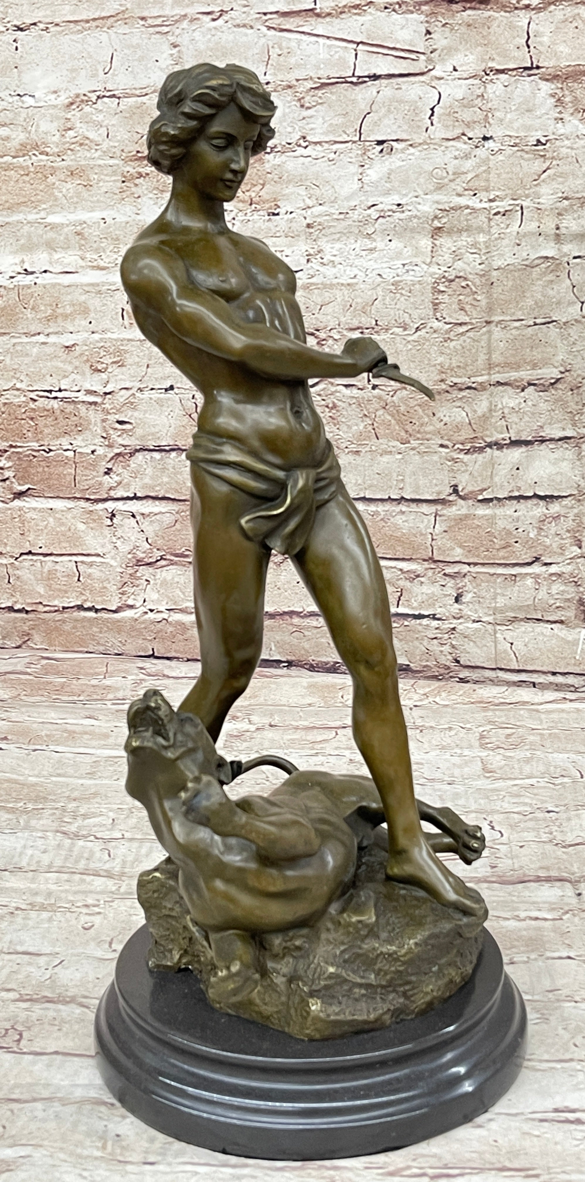 Crafted with utmost precision and skill, the Lion Slayer sculpture was cast using the ancient and revered lost wax method. This technique ensures the finest quality and exquisite craftsmanship, resulting in a lifelike representation of the scene. The rich brown patina finish enhances the sculpture's depth and adds a touch of elegance to the piece.