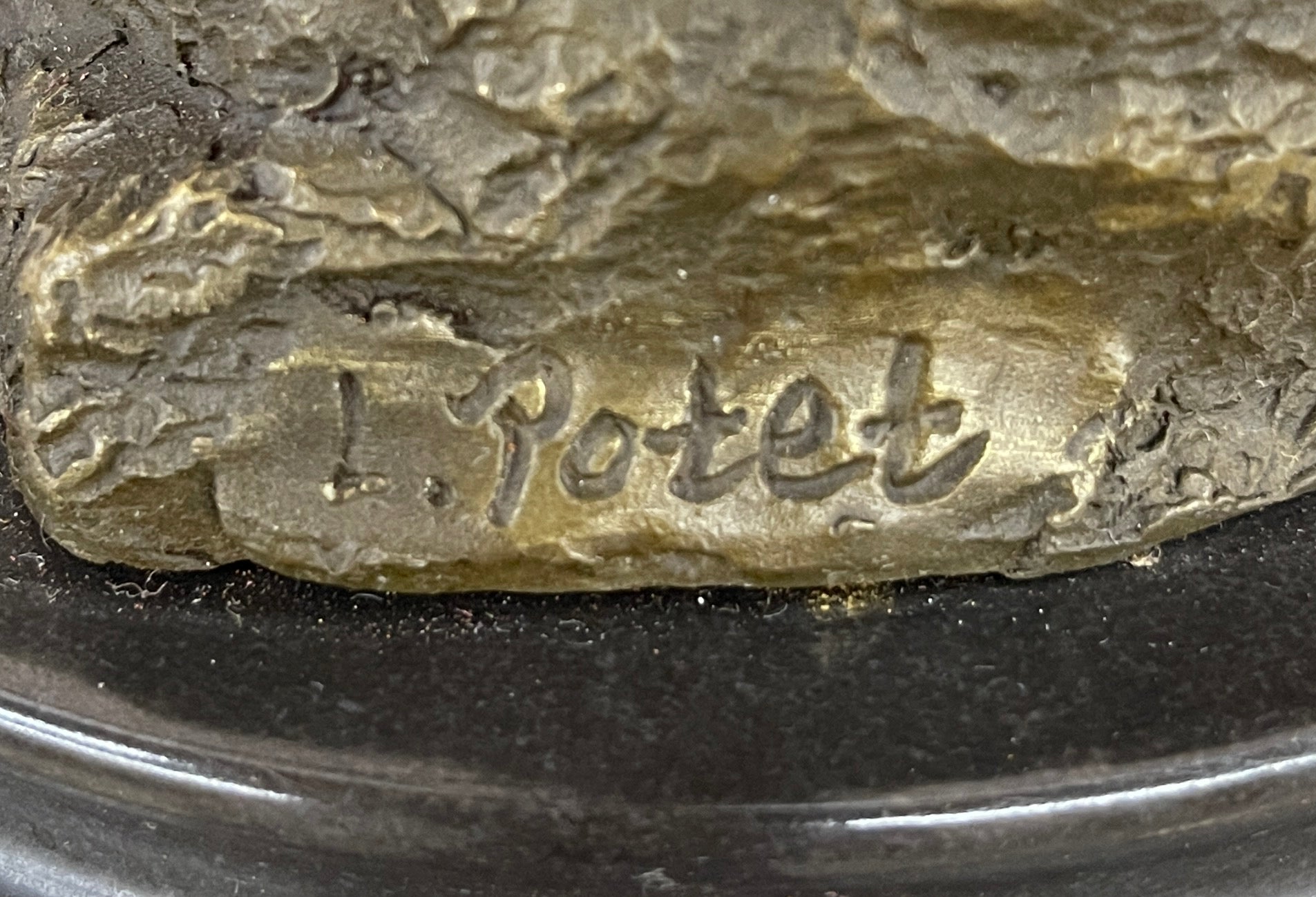 Mounted on a sleek black marble base, this bronze masterpiece stands as a testament to the artist's talent and creativity. The contrast between the smooth marble and the textured bronze creates a visually striking display. The sculpture bears the signature of the esteemed artist L. Potet, guaranteeing its authenticity and artistic value.