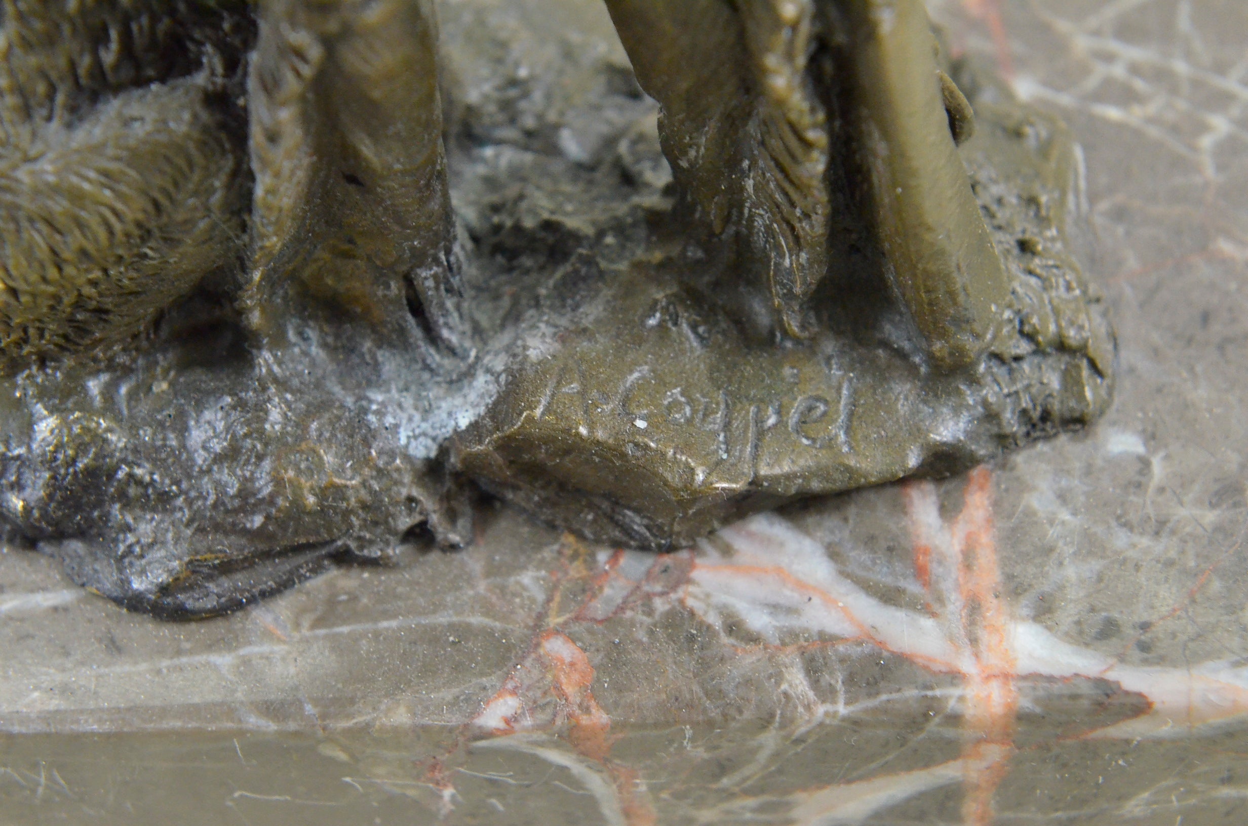 Entitled Wolf Robe, the Guardian, 1991. Fine bronze of an Indian warrior with a long gun and wearing a wolf pelt. Wonderfully executed with fine details and colored highlights. Stamped by the artist on the base. Sits on a brown marble base. Coypel work focuses on outdoor and western themes, such as hunting, fishing, mountain men, and, of course, Americans IndiansBronze Dimensions with Marble Base:Height 9" x Width 5"
