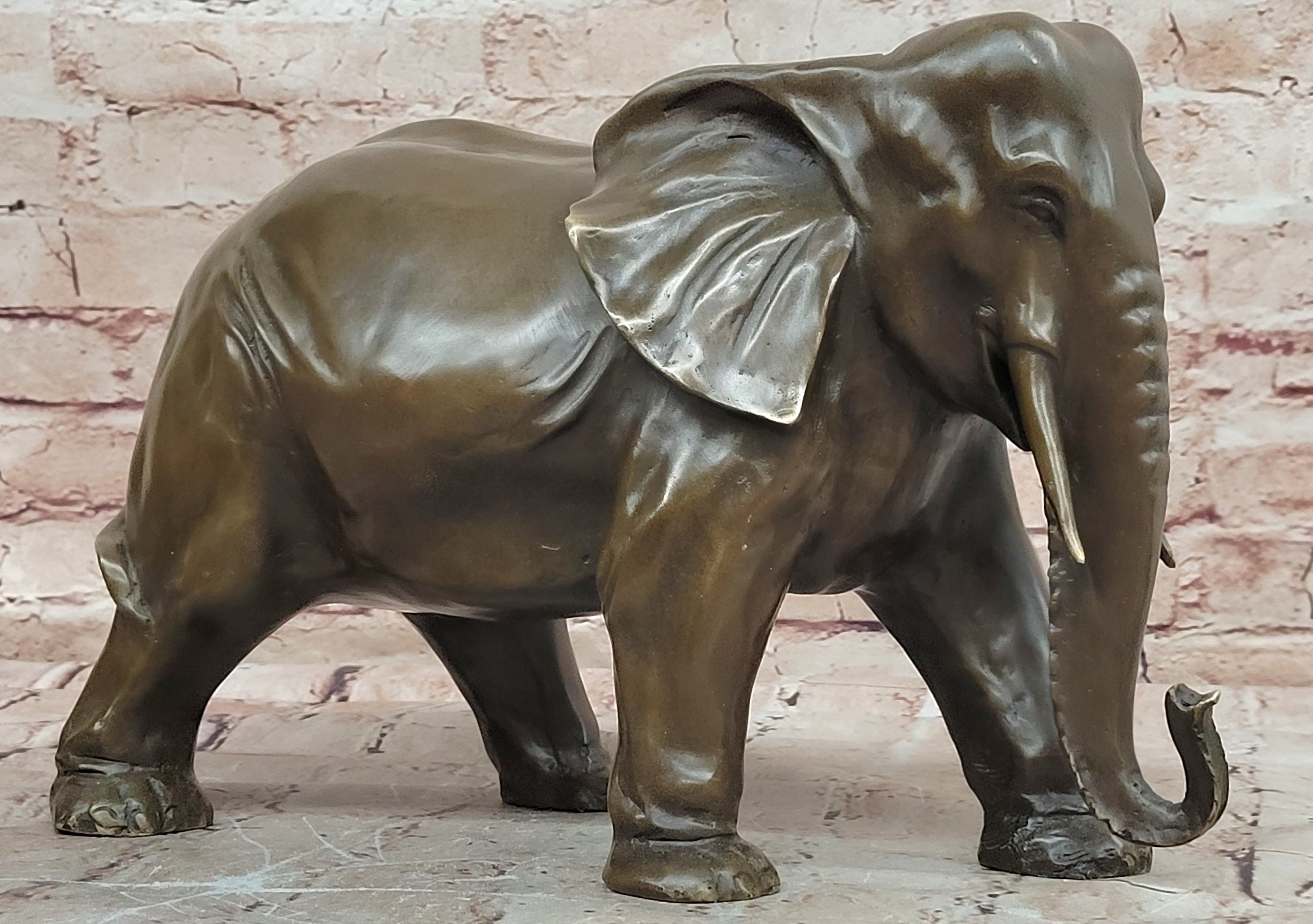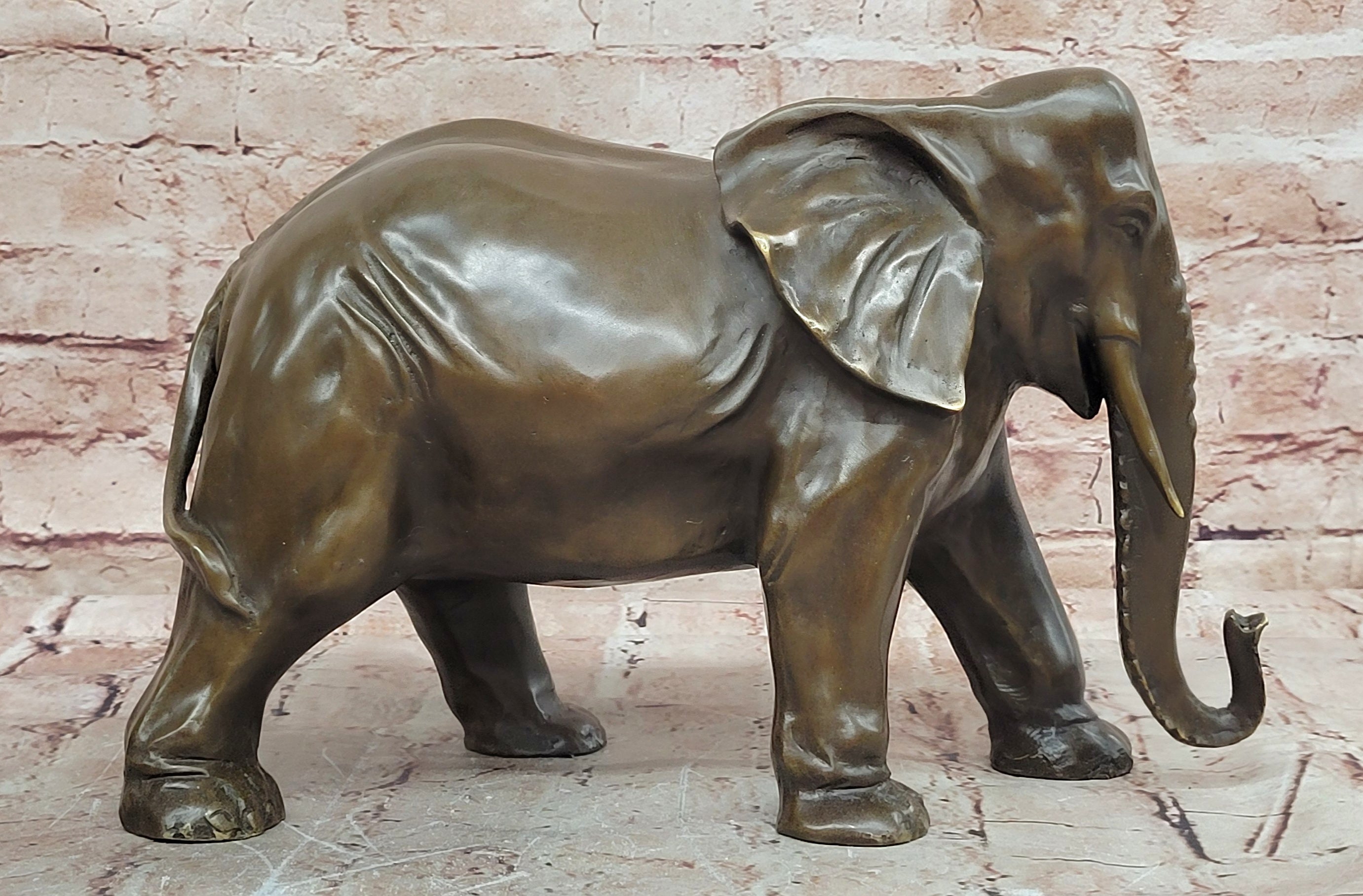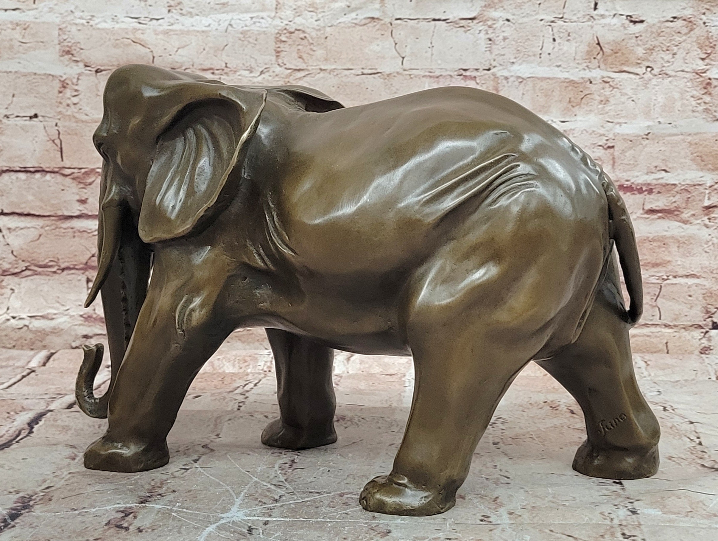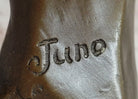 Signed by the artist Juno, this bronze elephant figurine is not only a decorative object but also a collectible work of art. Its durable metal construction ensures lasting beauty, while its symbolic meaning makes it a thoughtful gift for animal lovers, collectors, or anyone who appreciates fine bronze sculpture. Whether displayed on a desk, shelf, or mantel, this piece brings character, elegance, and a sense of tradition to any space.Bronze Dimensions: Height 9" X Width 13"