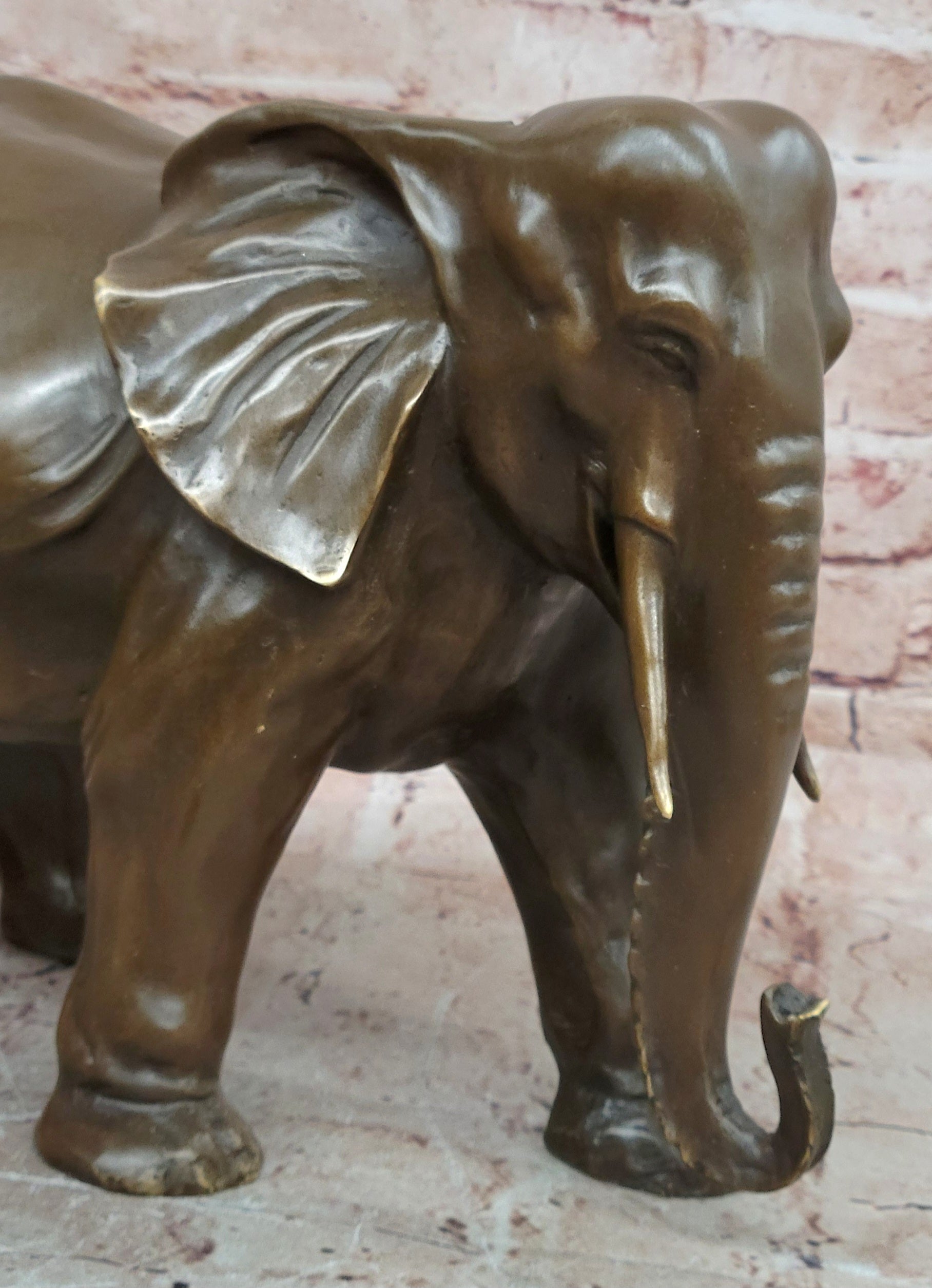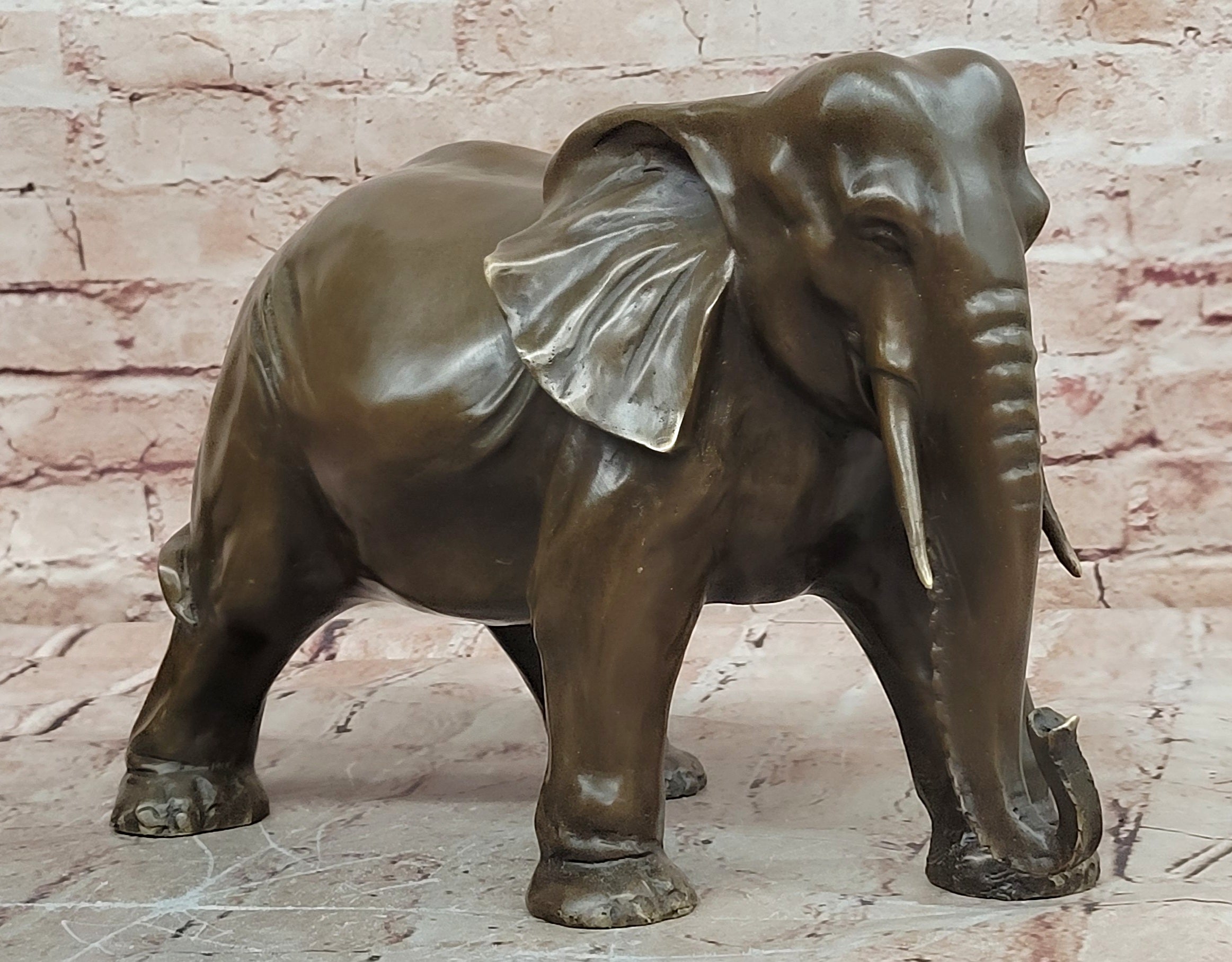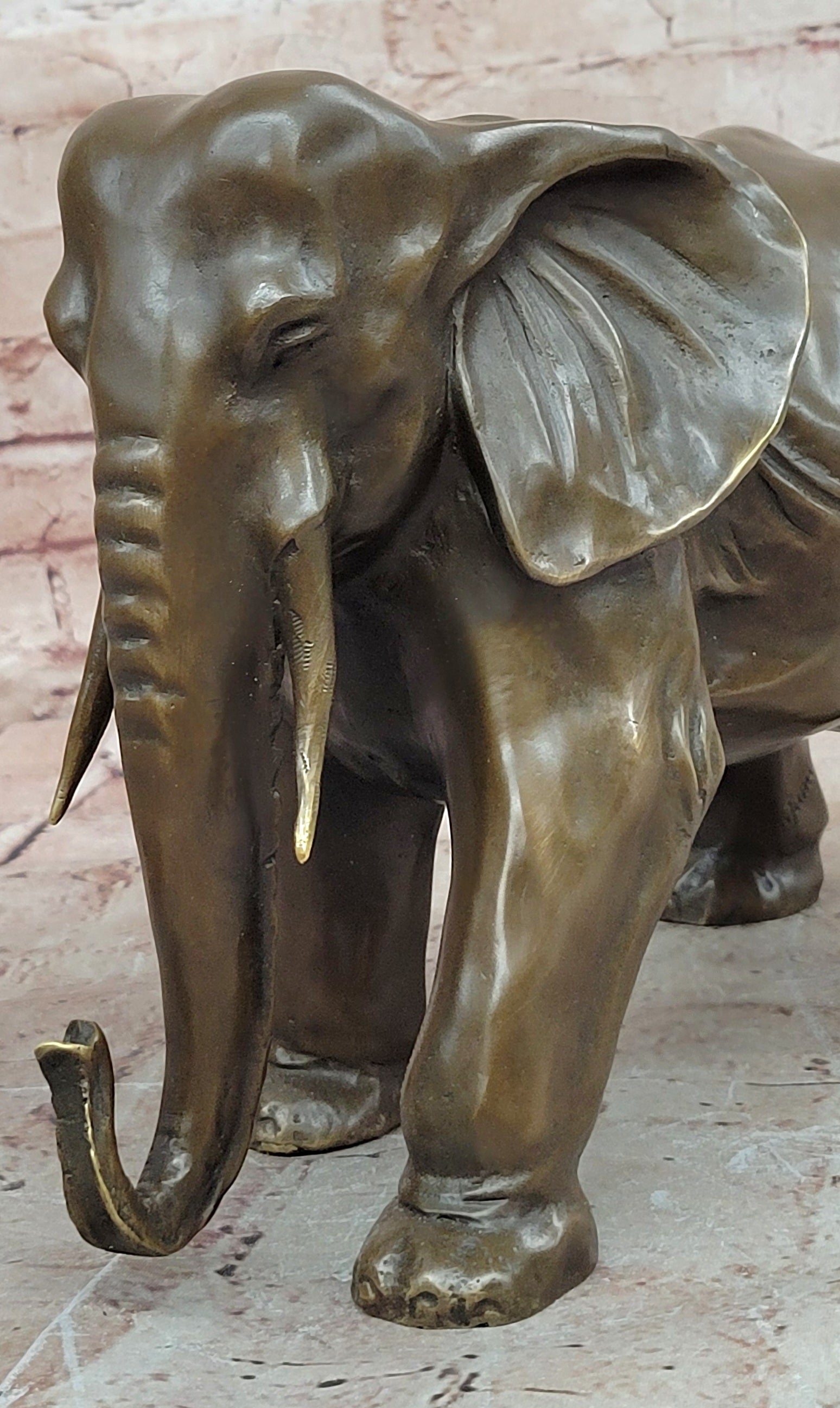 Signed by the artist Juno, this bronze elephant figurine is not only a decorative object but also a collectible work of art. Its durable metal construction ensures lasting beauty, while its symbolic meaning makes it a thoughtful gift for animal lovers, collectors, or anyone who appreciates fine bronze sculpture. Whether displayed on a desk, shelf, or mantel, this piece brings character, elegance, and a sense of tradition to any space.Bronze Dimensions: Height 9" X Width 13"