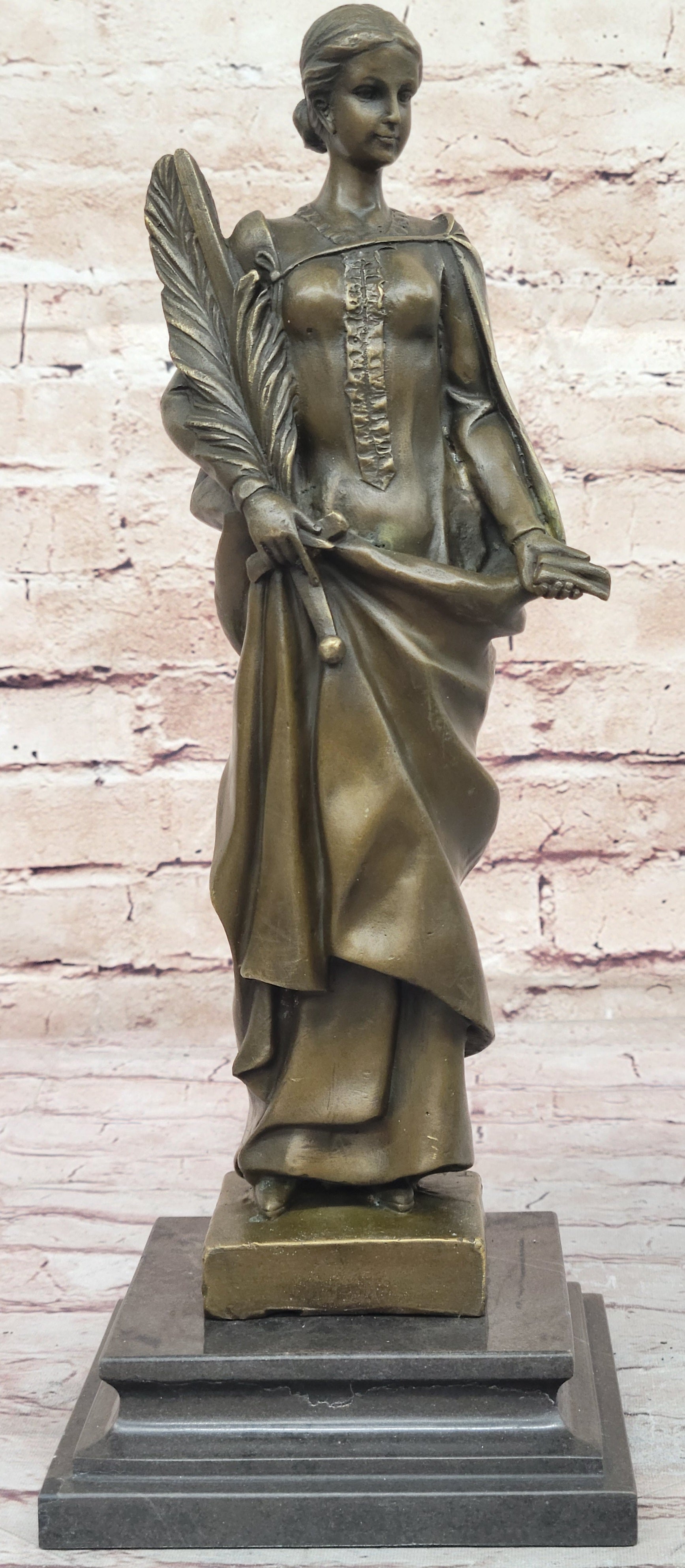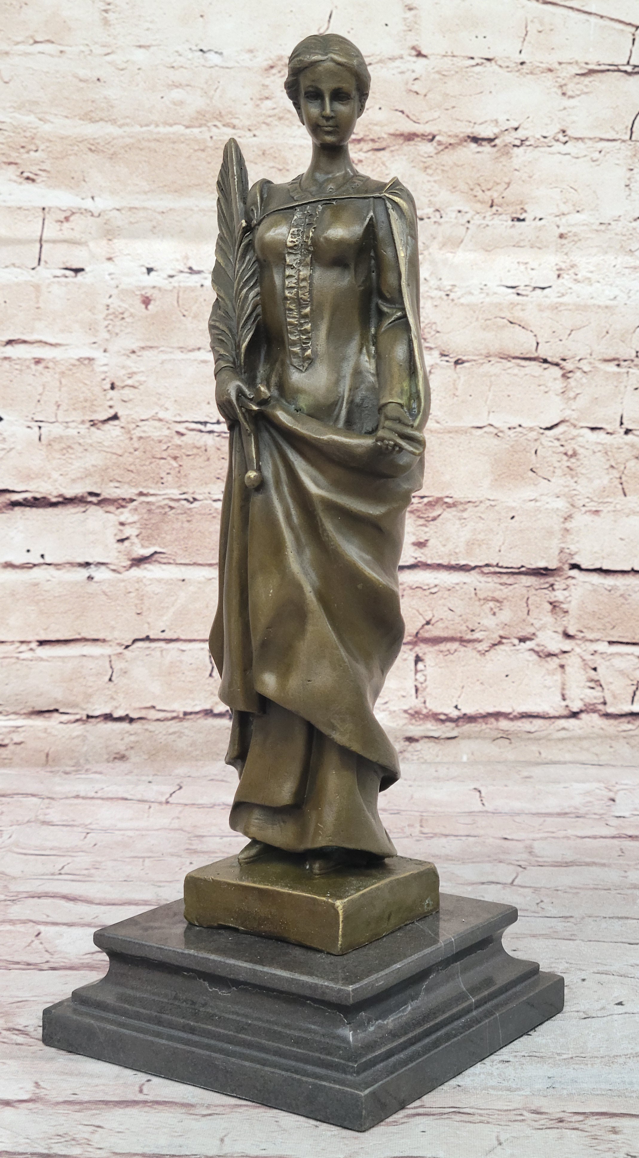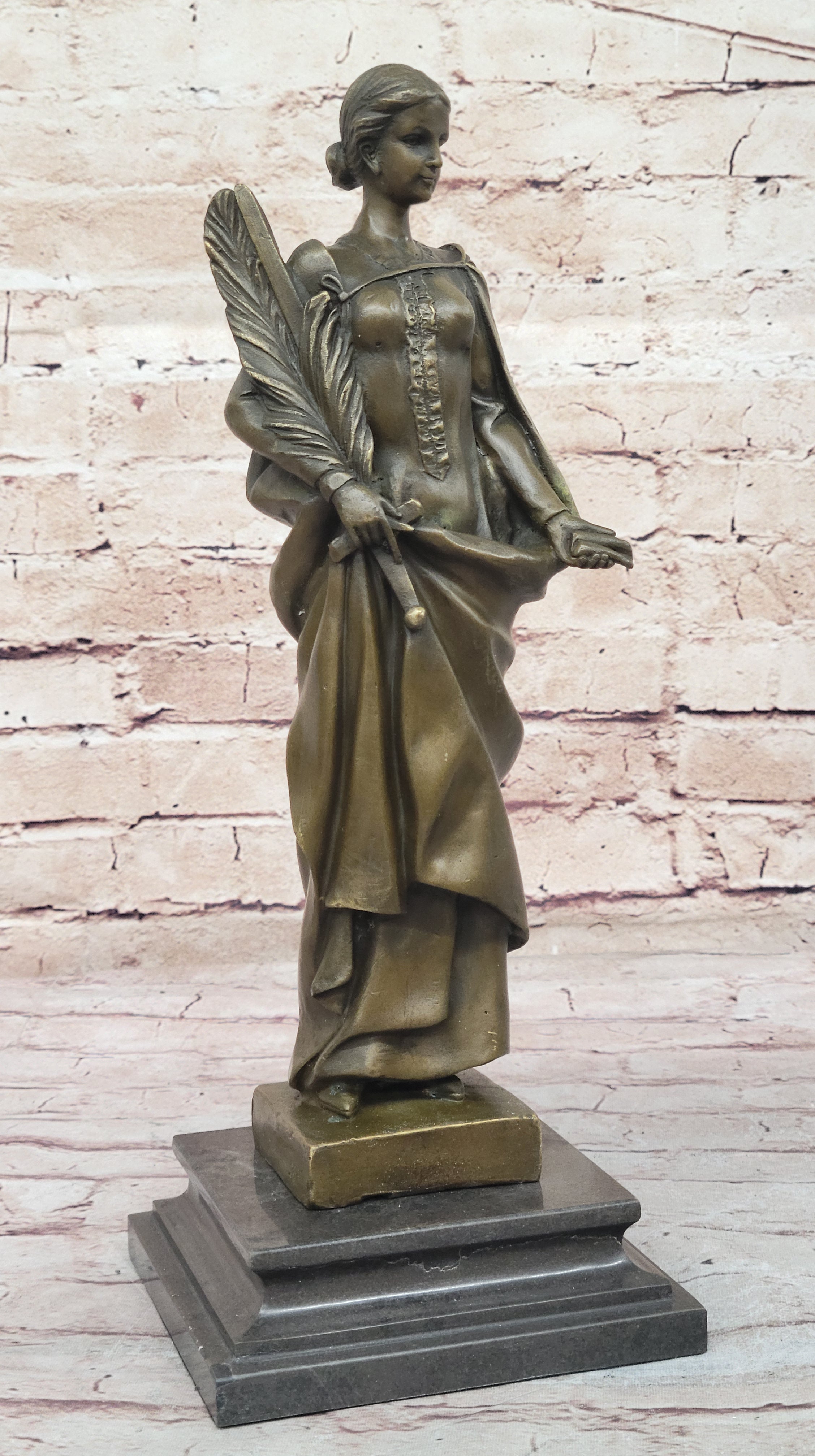 A smaller recast of the original "Peace" statue, which gained popularity during World War I, this piece captures the fine details that reflect the era's yearning for peace amidst the turmoil. The intricate design of the palm branch, the delicate curve of the sword, and the gentle grip on the lantern are all meticulously crafted, showcasing the artist’s exceptional skill. The sculpture’s brown patina finish not only enhances its antique appeal but also preserves its beauty for years to come.