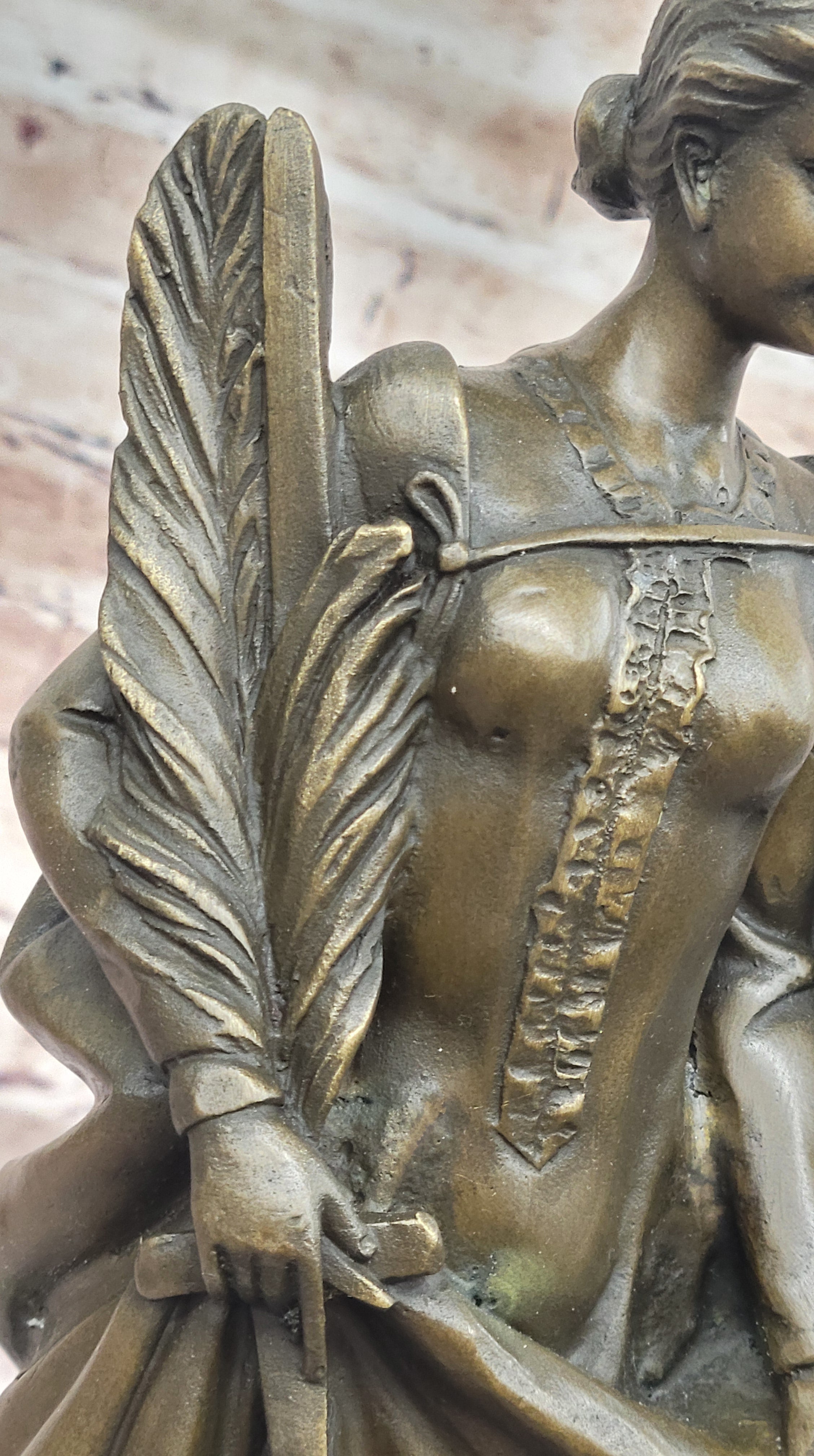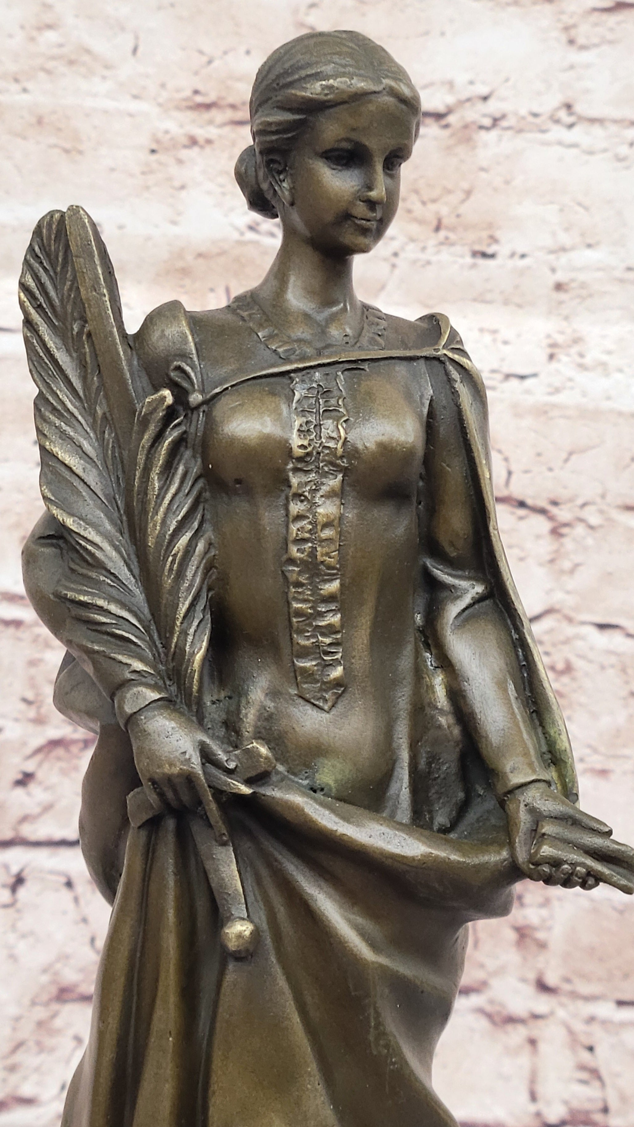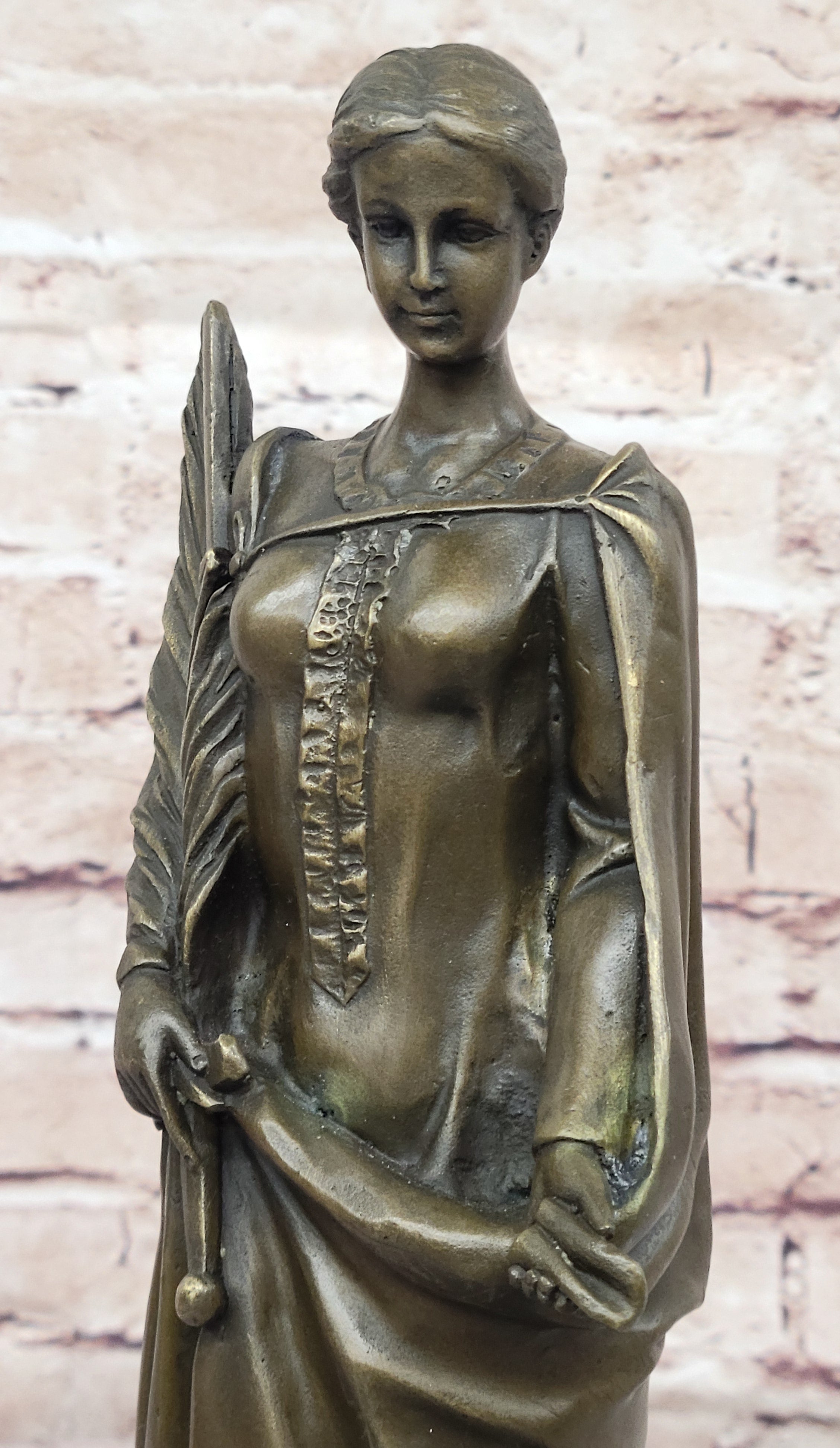 A smaller recast of the original "Peace" statue, which gained popularity during World War I, this piece captures the fine details that reflect the era's yearning for peace amidst the turmoil. The intricate design of the palm branch, the delicate curve of the sword, and the gentle grip on the lantern are all meticulously crafted, showcasing the artist’s exceptional skill. The sculpture’s brown patina finish not only enhances its antique appeal but also preserves its beauty for years to come.