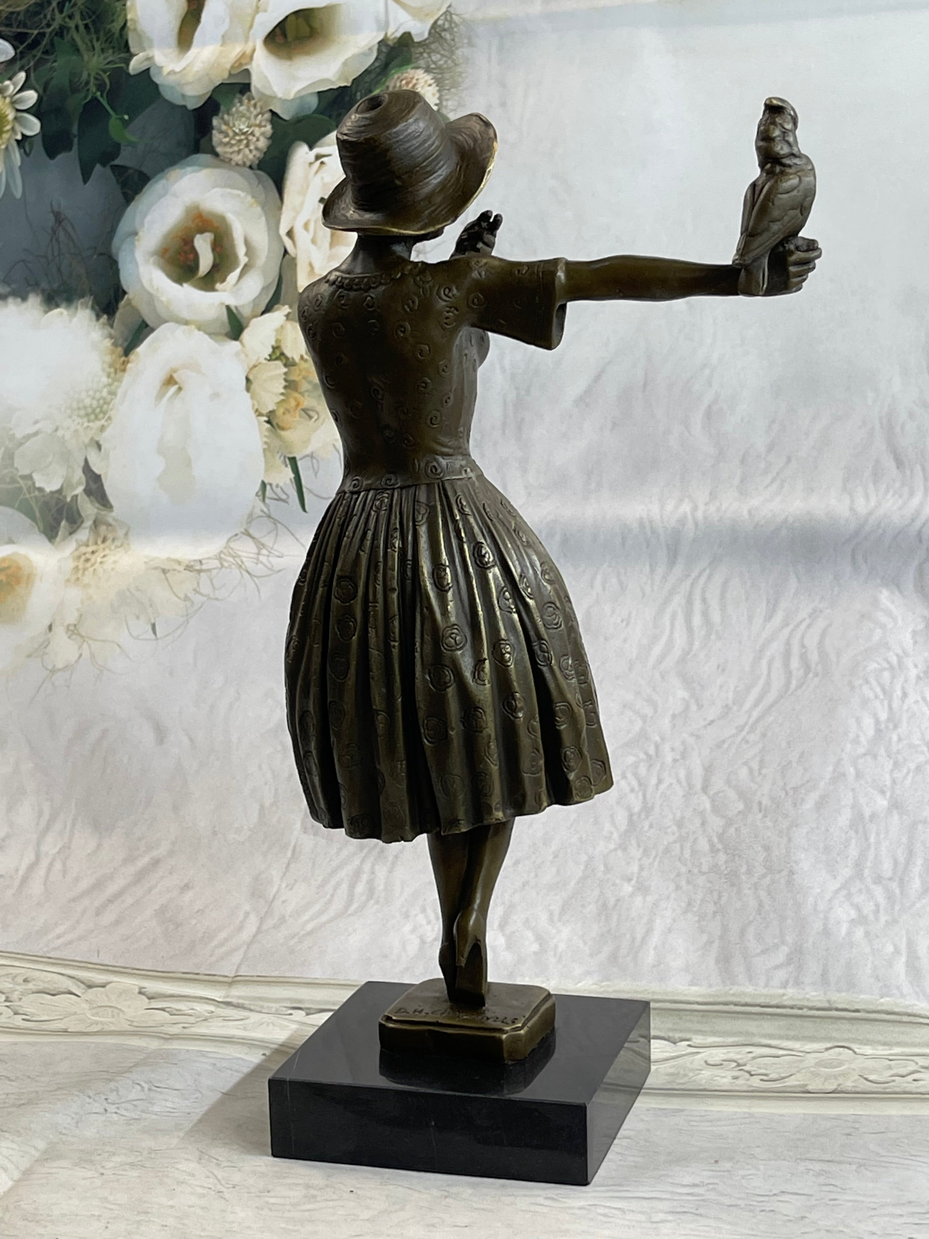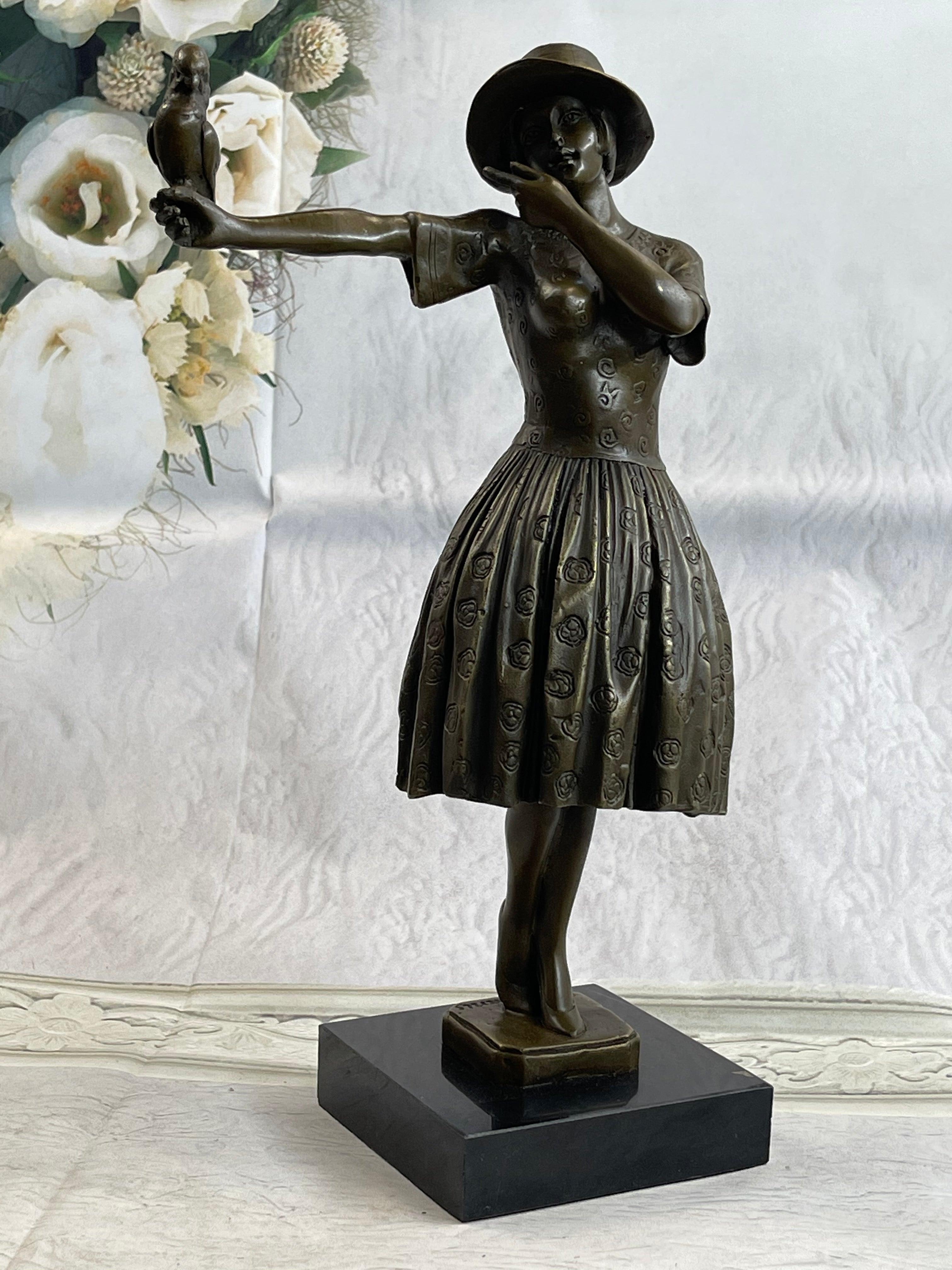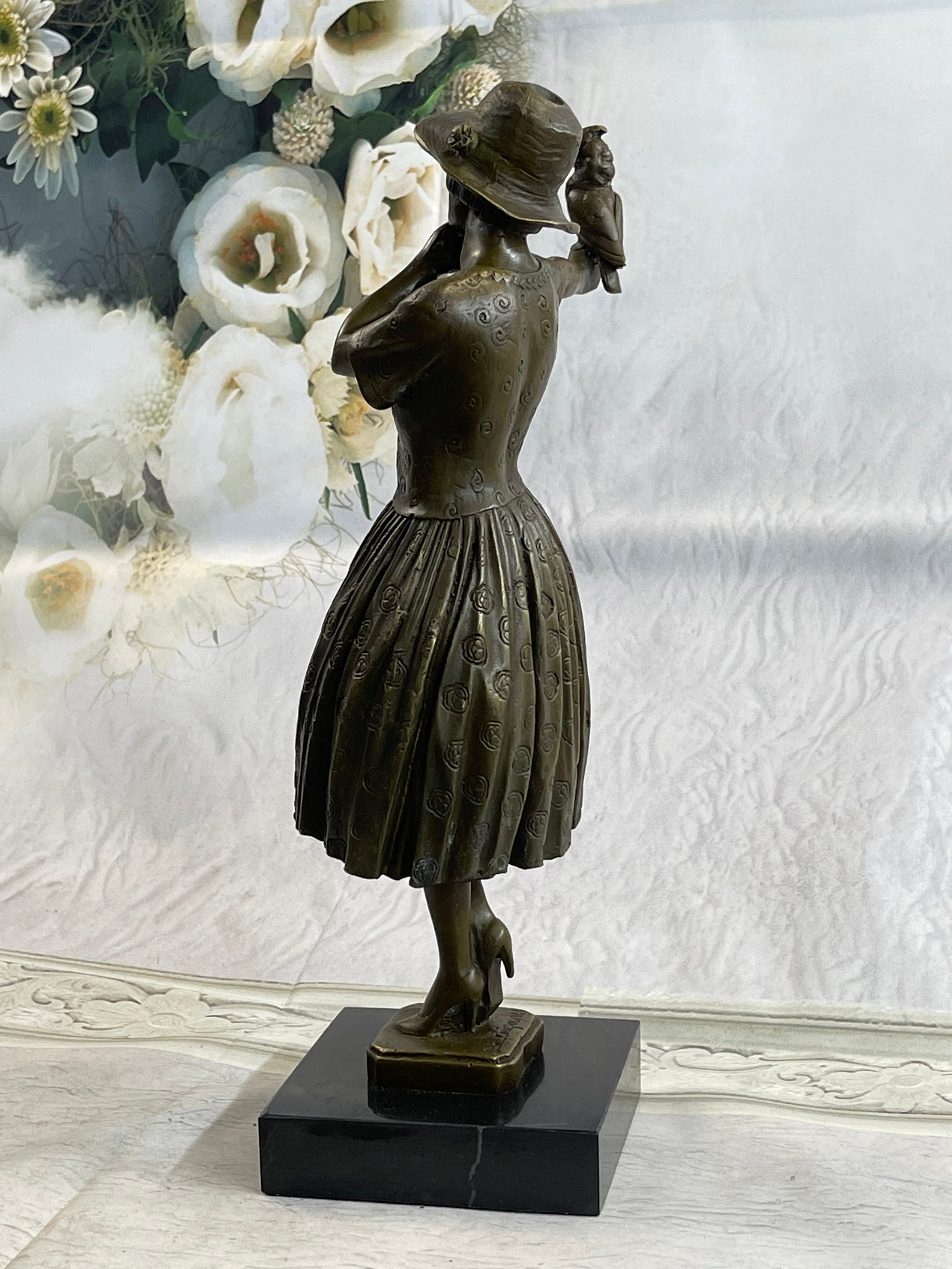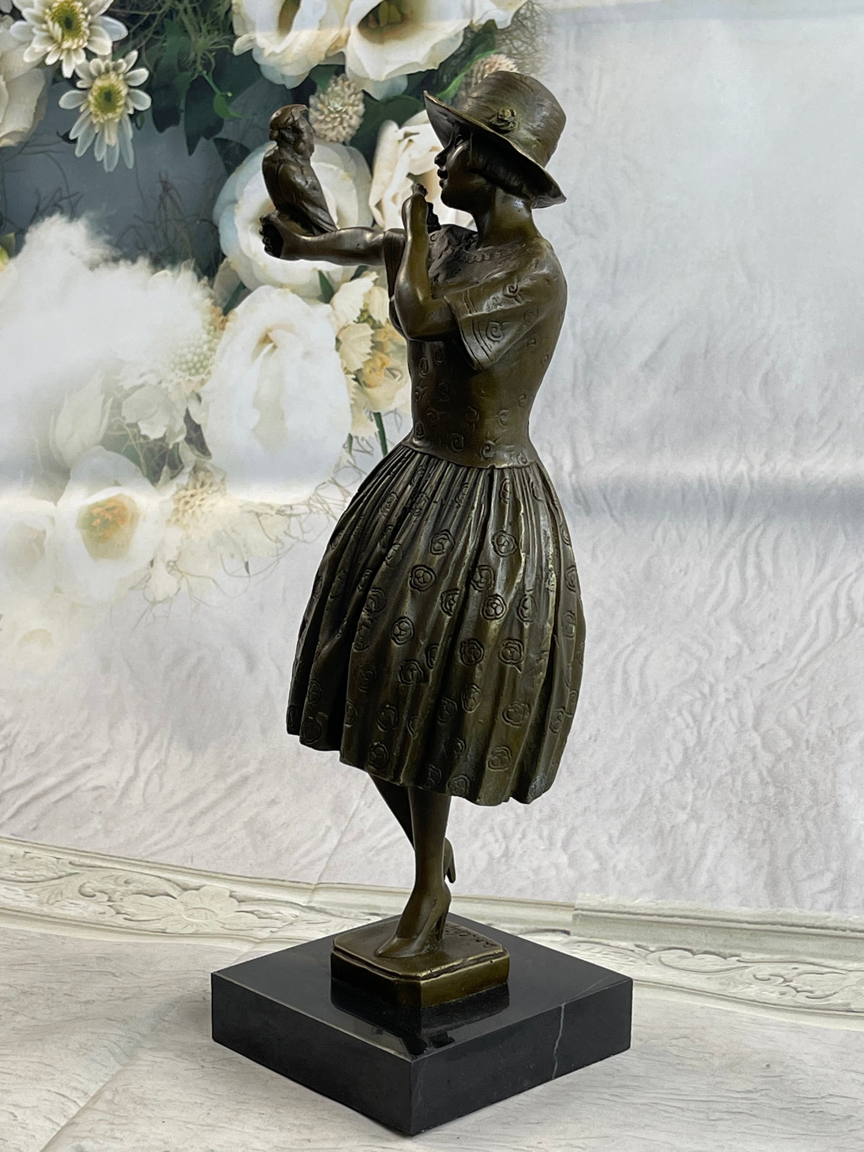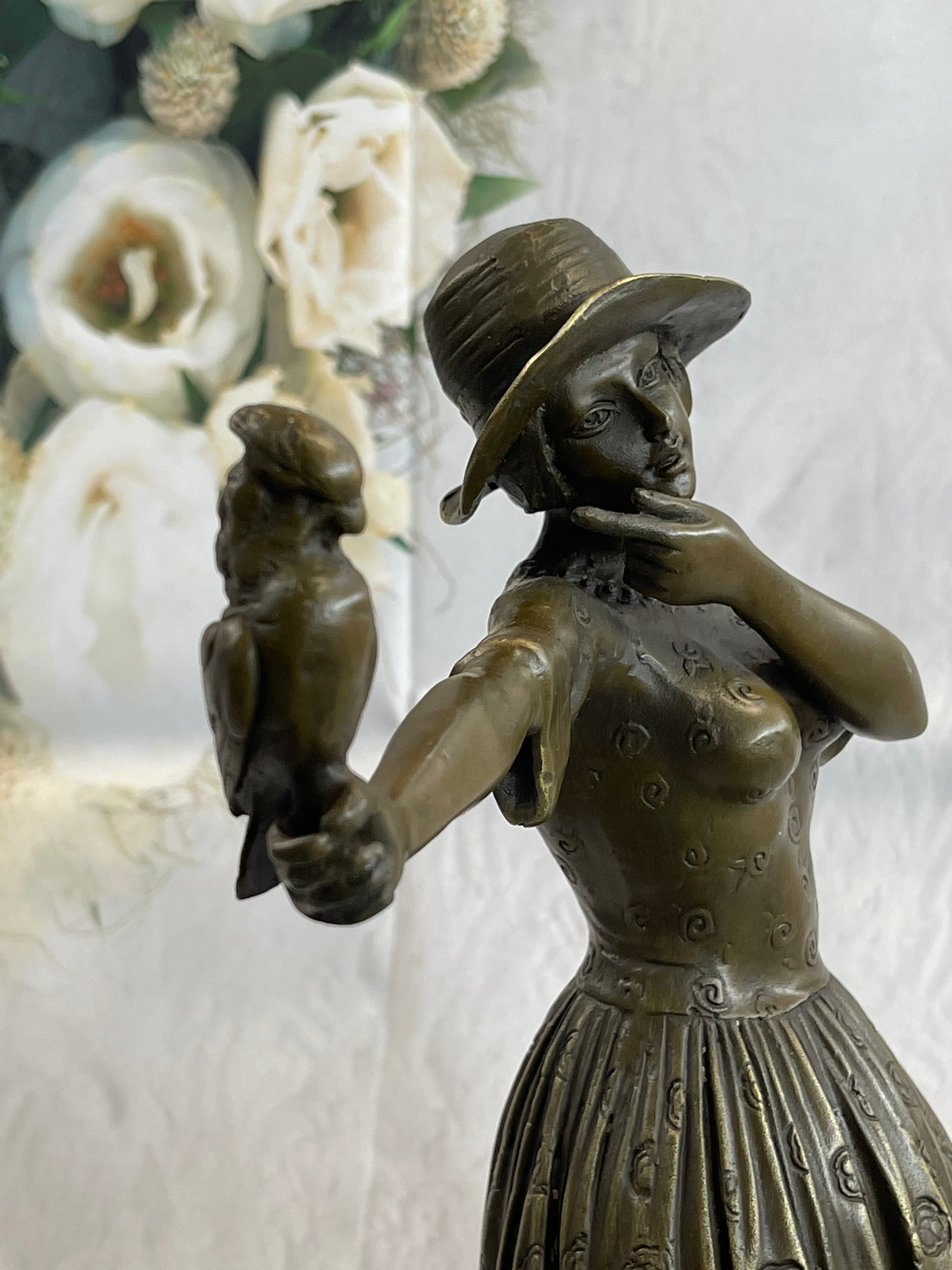Enhancing the sculpture’s beauty, a delicate bird perches peacefully on the woman’s arm, creating a tender moment between human and nature. The fine detailing in the folds of the dress, the texture of the hat, and the bird’s feathers all speak to the artist’s masterful craftsmanship. This piece radiates a soft charm that makes it an eye-catching addition to any collection.