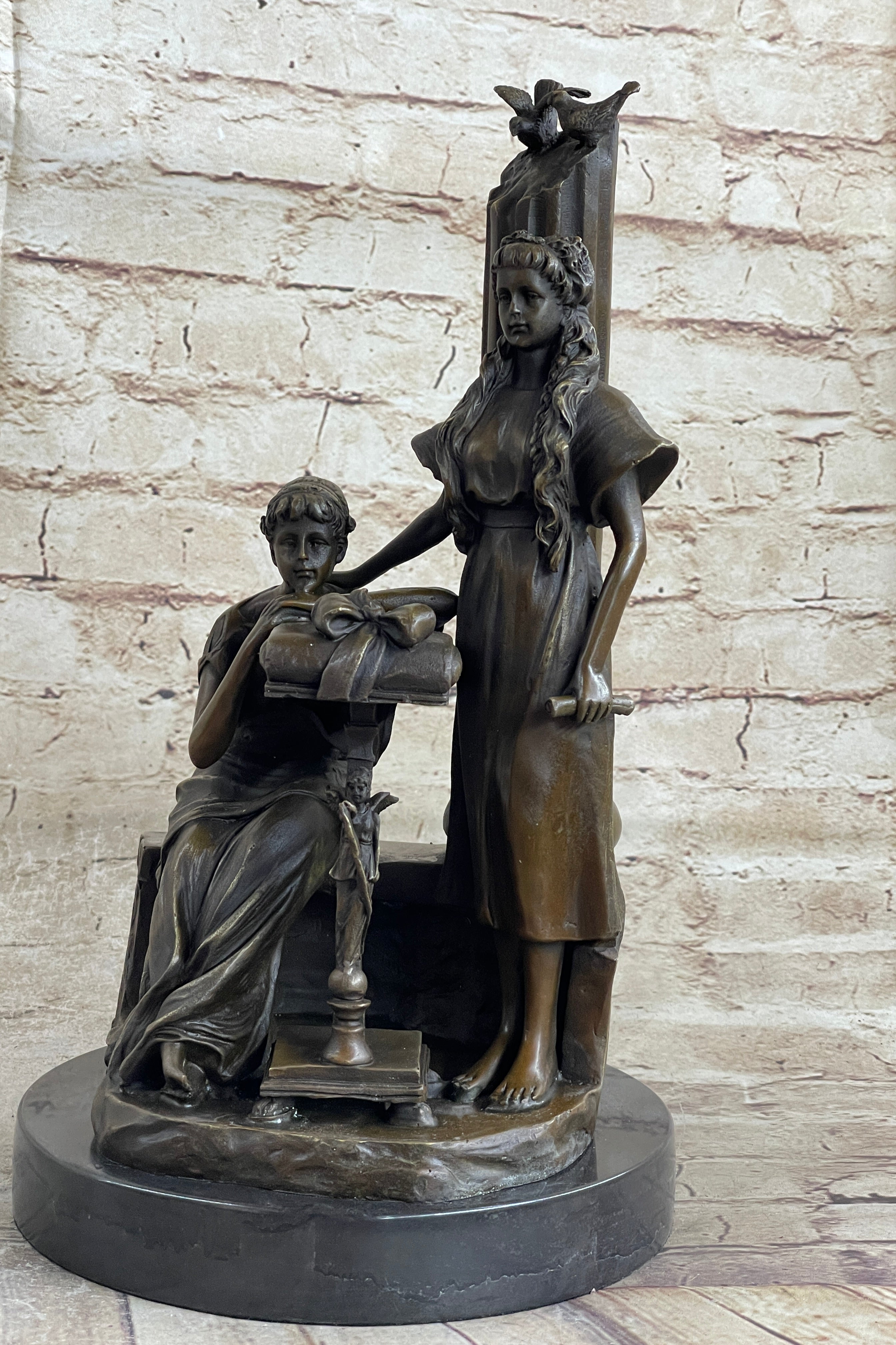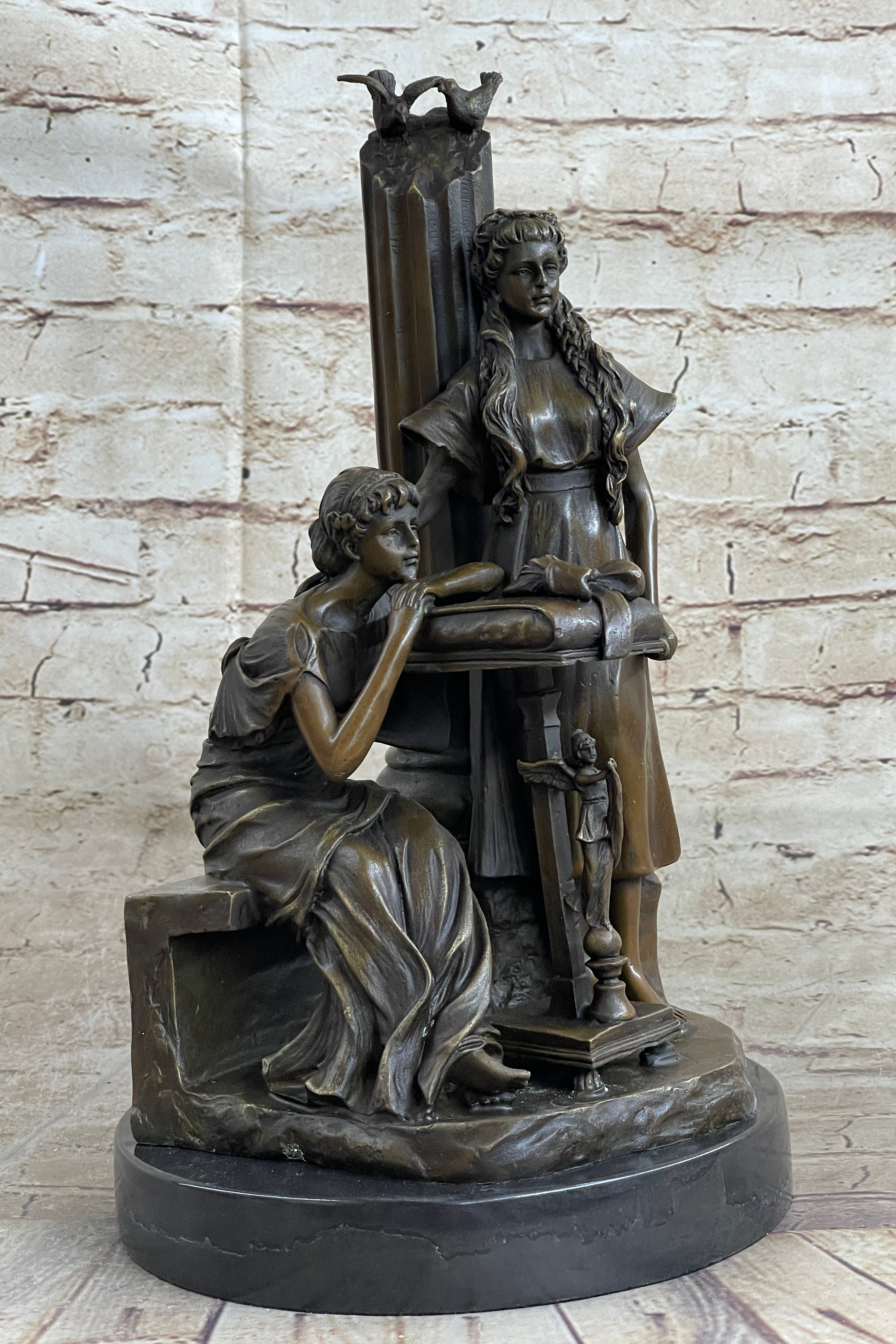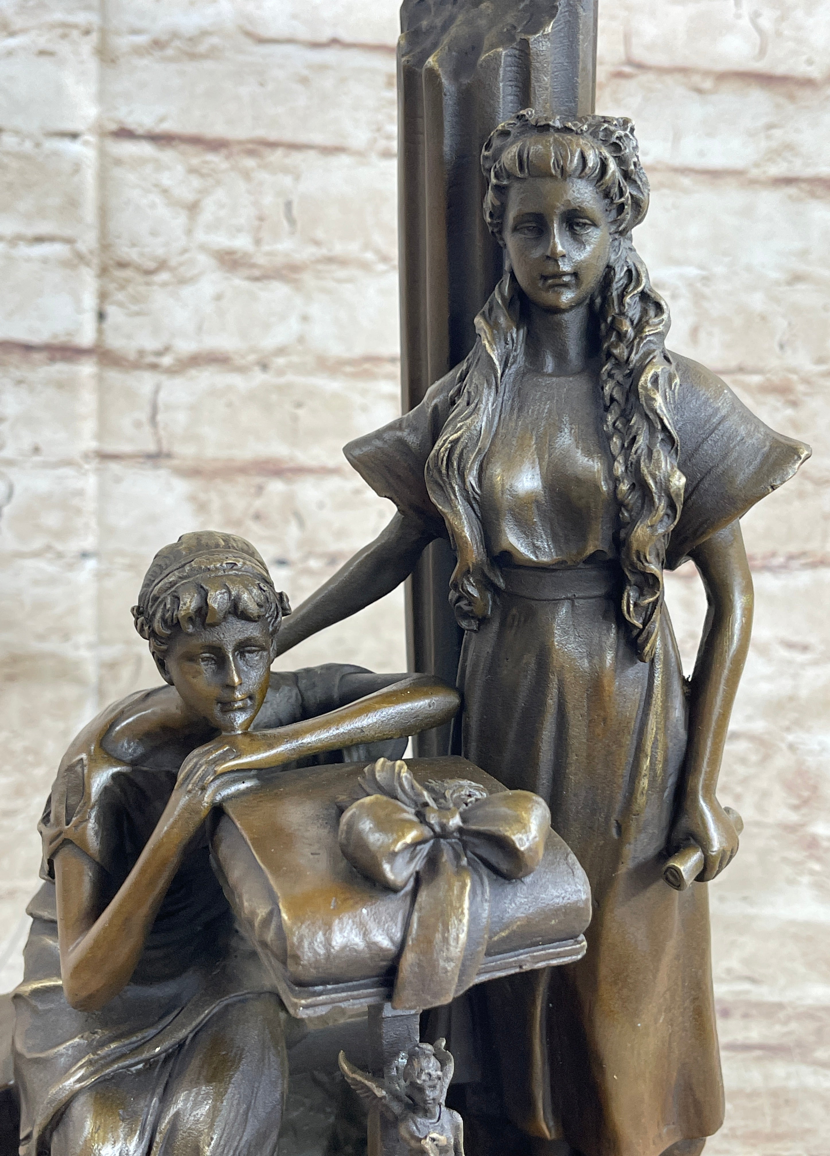 Two Young Girls w/ Book & Column Bronze Statue Sculpture Moreau Decor 14" x 8"