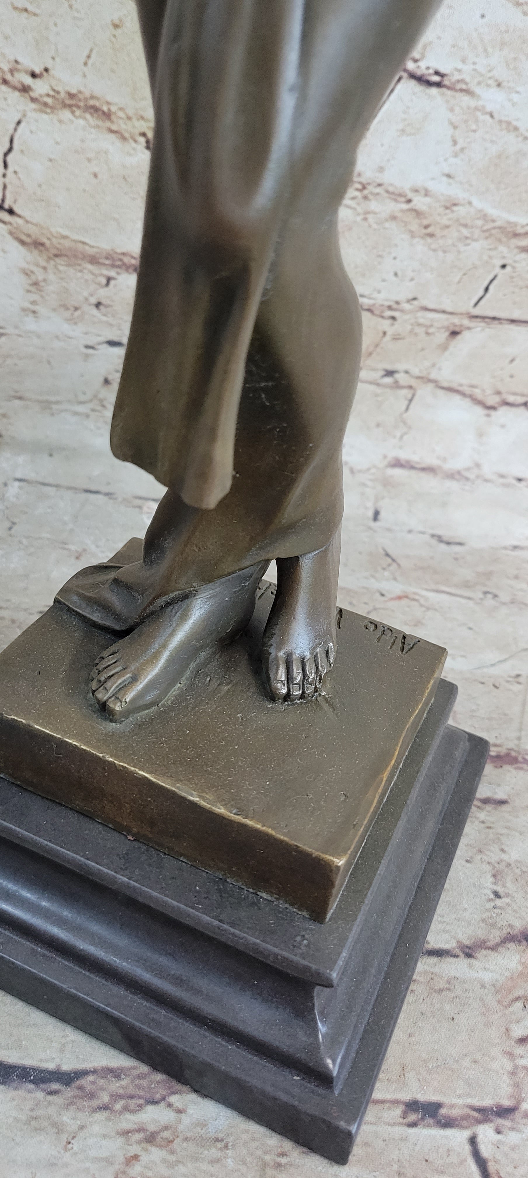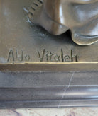 Mounted on a polished marble base for a sophisticated presentation, the sculpture is signed by the renowned artist Aldo Vitaleh. Perfect for collectors or those seeking an elegant decorative piece, this artwork embodies grace and artistry, making it a standout addition to any space.Bronze Dimensions with Marble Base: Height 17" X Width 5"