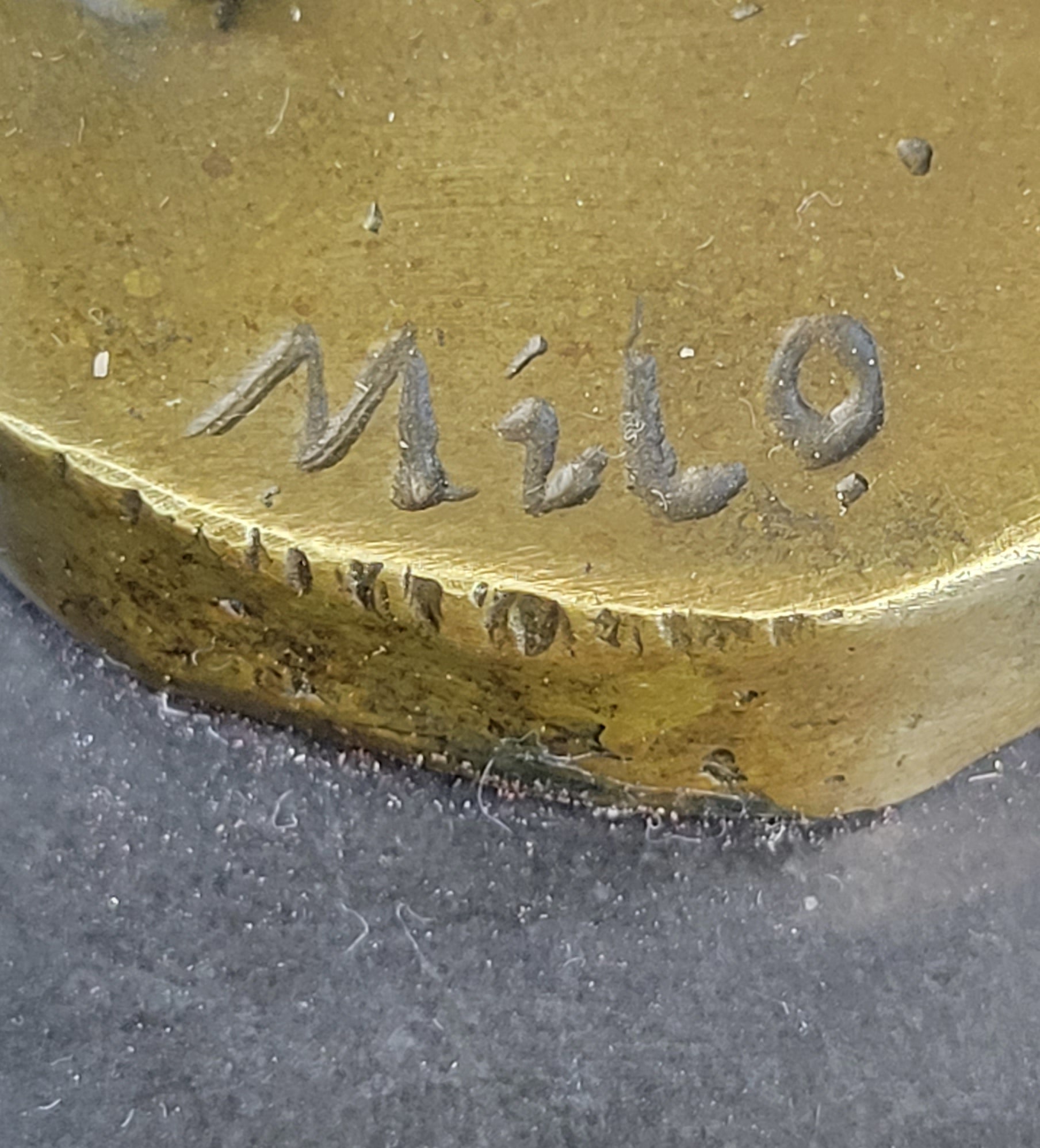 This sculpture is a perfect gift for anyone who loves ballet, whether they are a professional ballerina or simply an enthusiast. Crafted using the time-honored lost-wax casting method, the sculpture has been stained with a brown patina for preservation. It sits atop a black marble base, signed by the artist Milo, and is sure to enchant anyone who sees it.