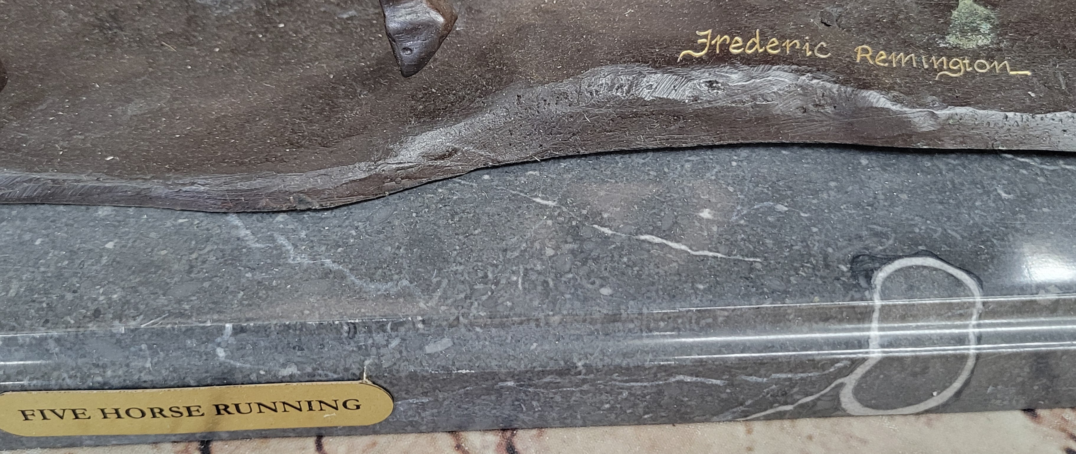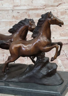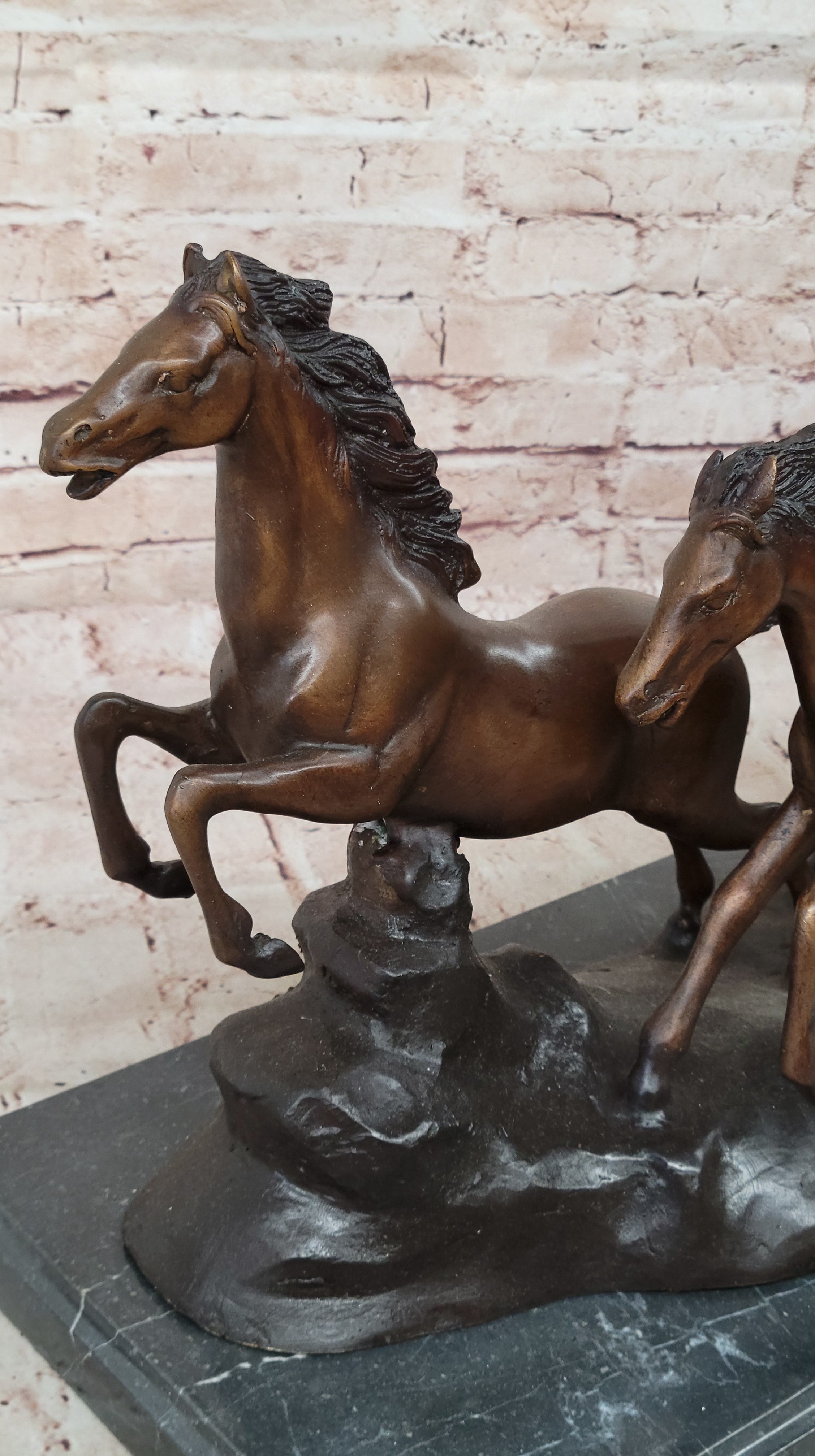 Reflecting the raw beauty and unbridled freedom of the North American wild mustangs, this stunning bronze sculpture brings to life the spirit of adventure and exploration that defined the era of the Conquistadors. With an emphasis on exquisite detail and lifelike representations, the sculpture captures the essence of these feral horses, showcasing their vitality and unrestrained movement. Crafted using the ancient "Lost Wax Method" and finished with a two-tone brown patina, the sculpture exudes a timeless appeal that resonates with the natural beauty of the American West. Signed by the esteemed artist Fredrick Remington, this masterpiece stands as a testament to the enduring legacy of these iconic wild horses and their enduring significance in American history and culture.Bronze Dimensions with Marble Base: Height 14" X Width 35"