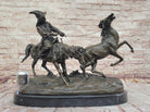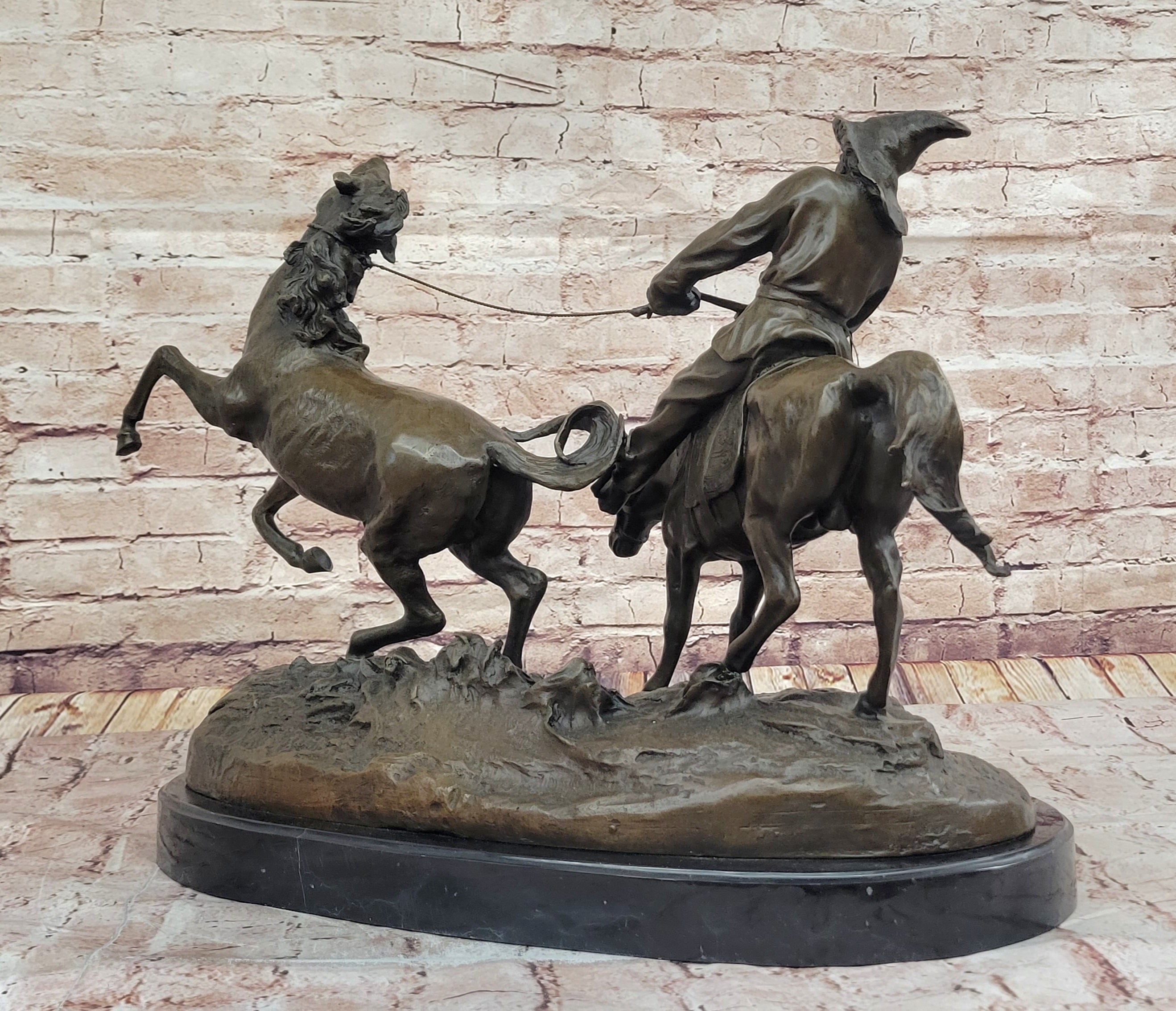 This striking bronze sculpture, titled "Breaking in a Wild Horse," captures the raw energy and dynamic struggle between man and beast. The sculpture masterfully depicts a determined horseman as he tames a rearing wild stallion, showcasing the power, movement, and intensity of this exhilarating moment. The muscular tension in both the rider and the horse is meticulously rendered, emphasizing the untamed spirit of the horse and the unwavering determination of the rider.