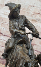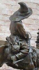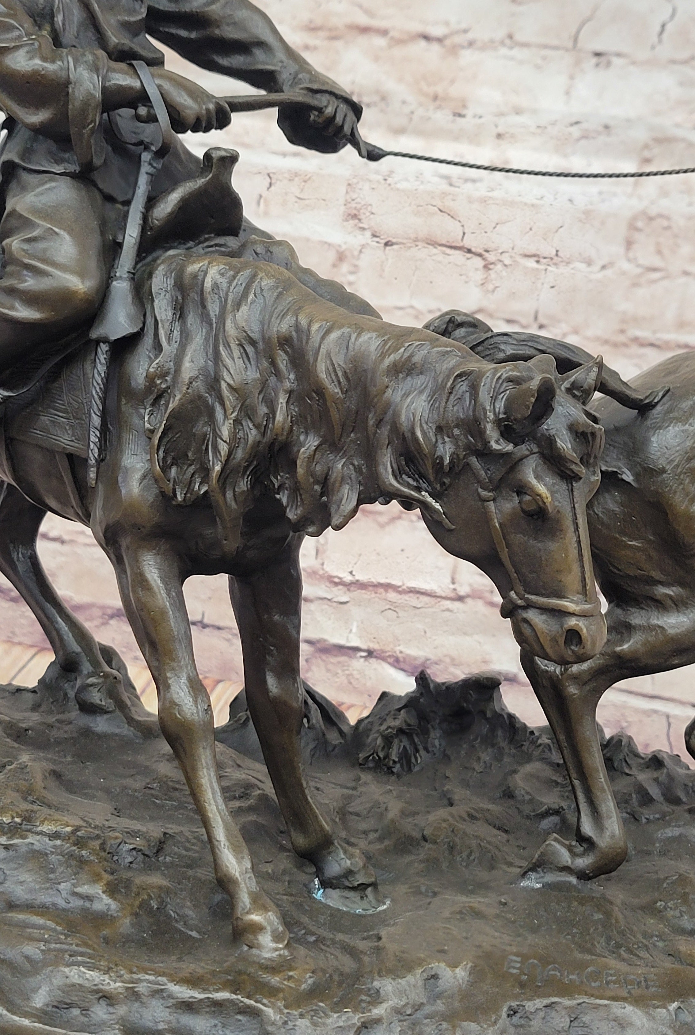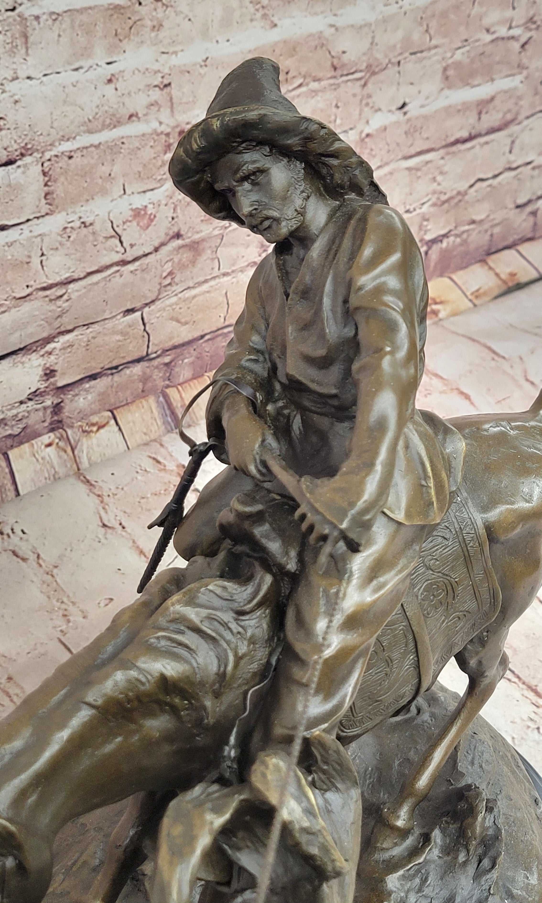 Handcrafted using the lost wax method, this bronze masterpiece features a rich brown patina that enhances its lifelike details and adds depth to its form. The interplay of light and shadow over the intricate textures of the horse's mane, the rider’s attire, and the rugged terrain gives the piece a sense of realism and movement, making it a stunning representation of the bond between humans and nature.