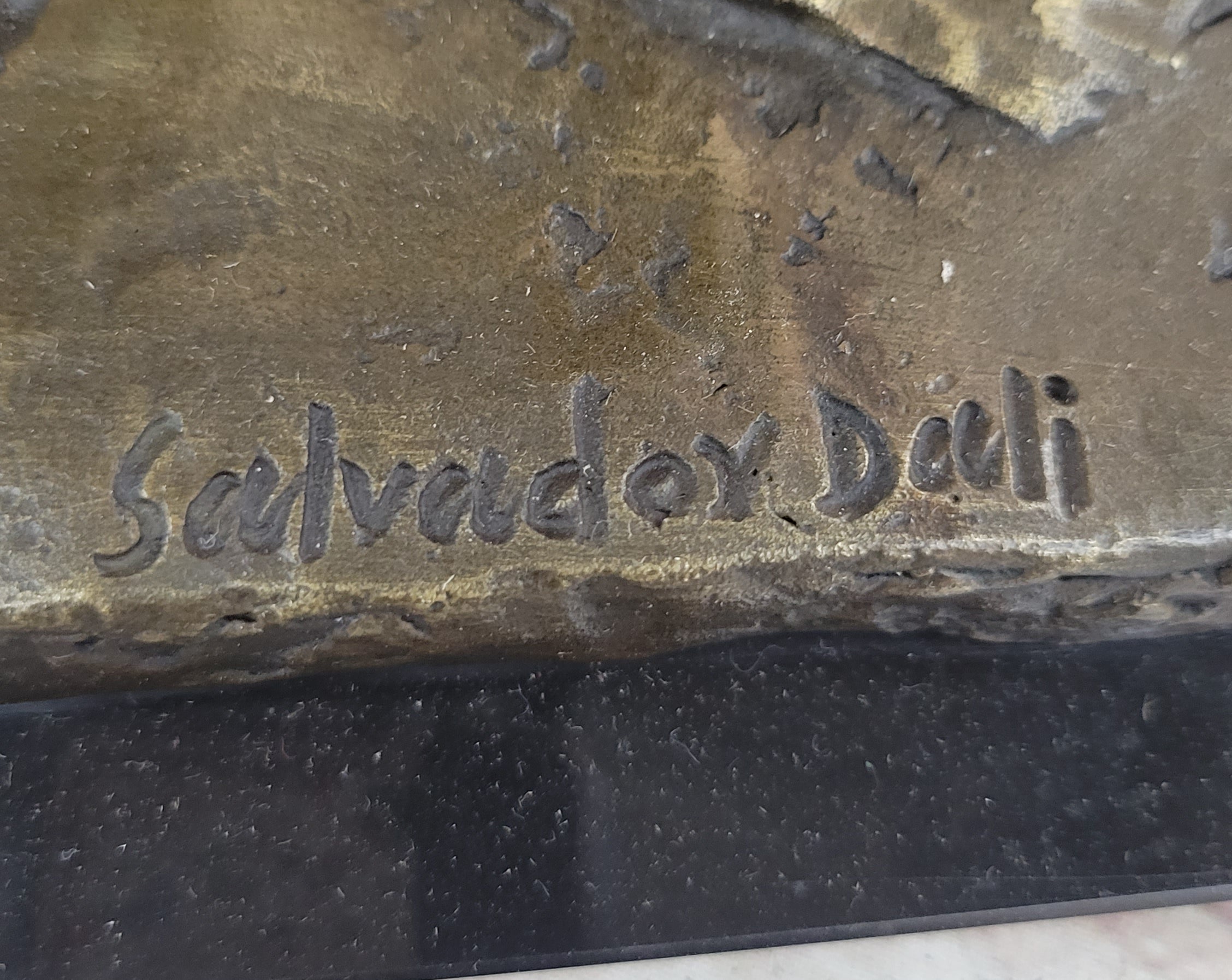 This bronze masterpiece bears the distinctive signature of Salvador Dali, a renowned artist known for pushing artistic boundaries. By owning this sculpture, you not only acquire a captivating artwork but also a conversation starter that invites discourse on the essence of art and its intricate connections to human interpretation and experience.Bronze Dimensions with Marble Base: Height 16" X Width 6"