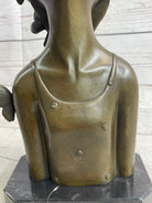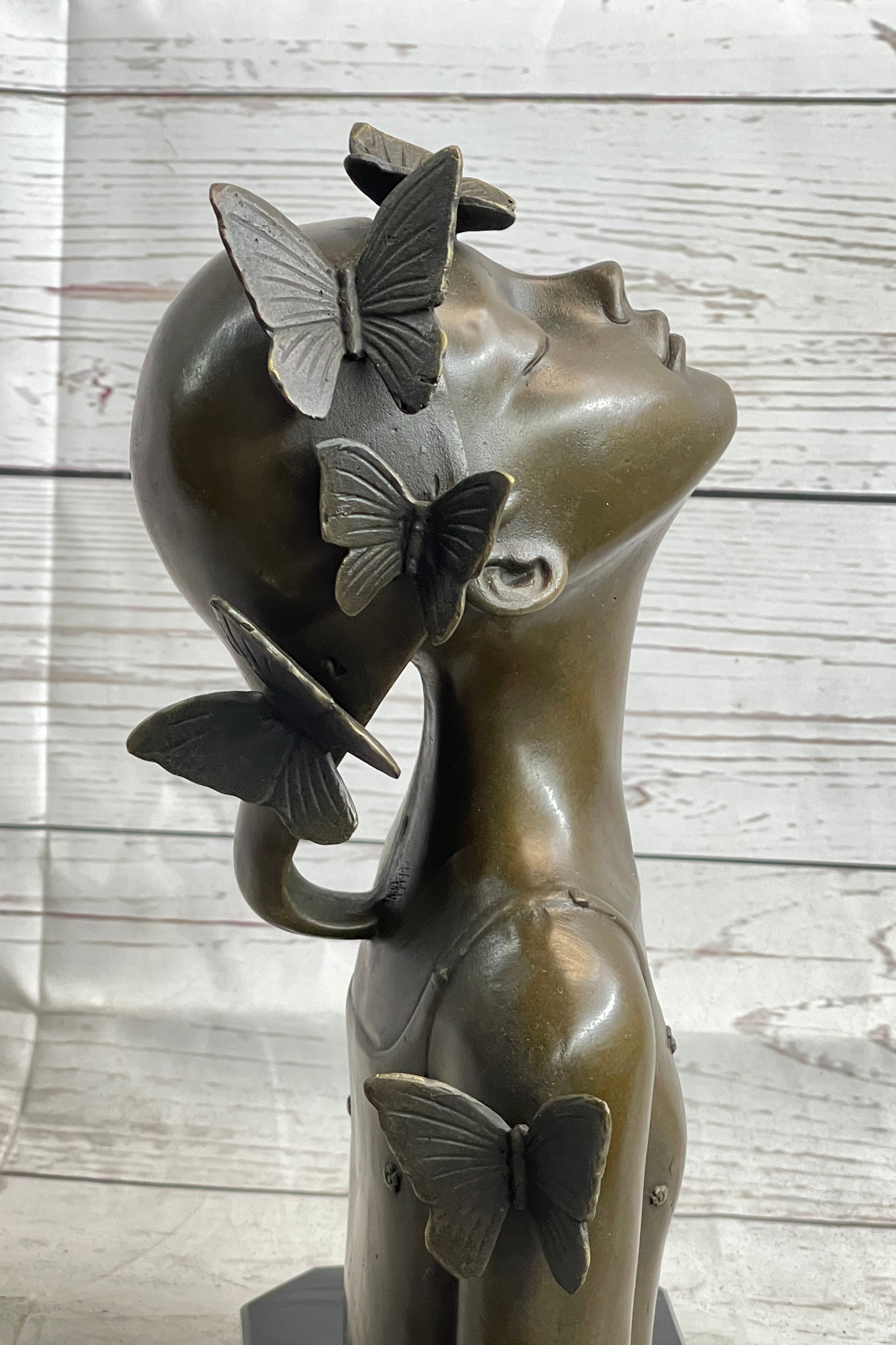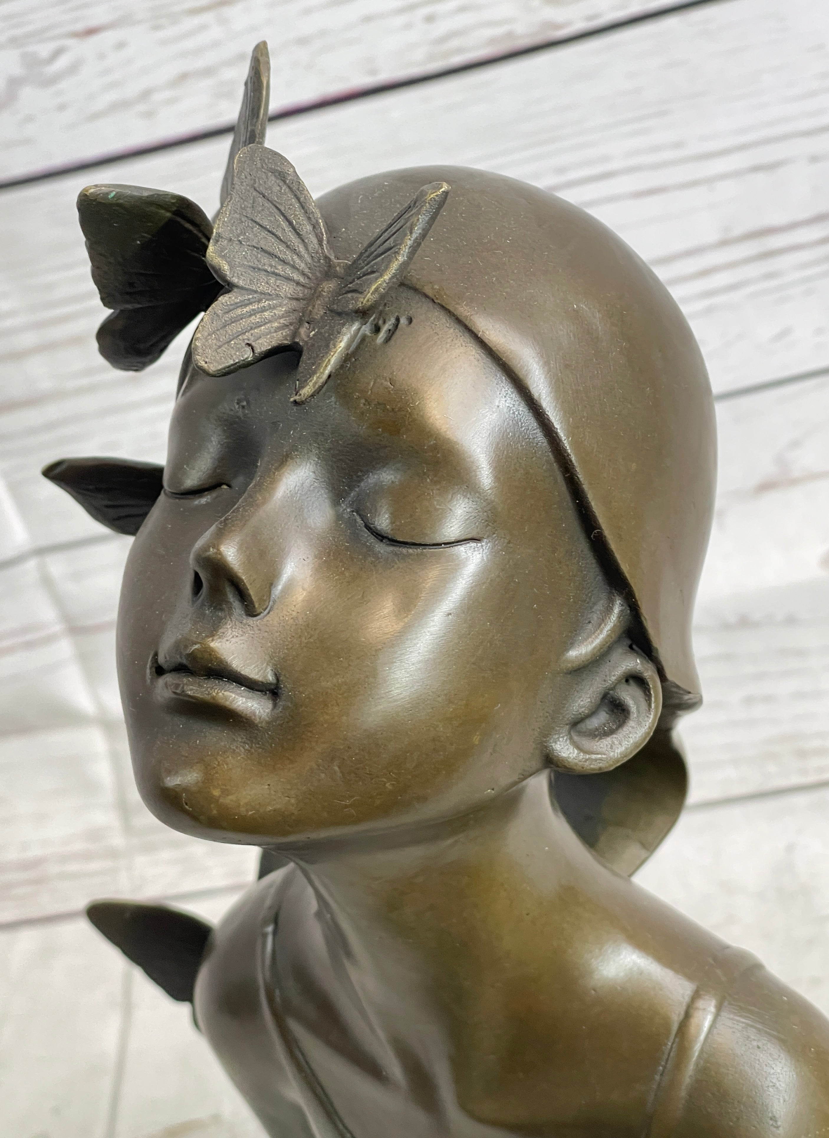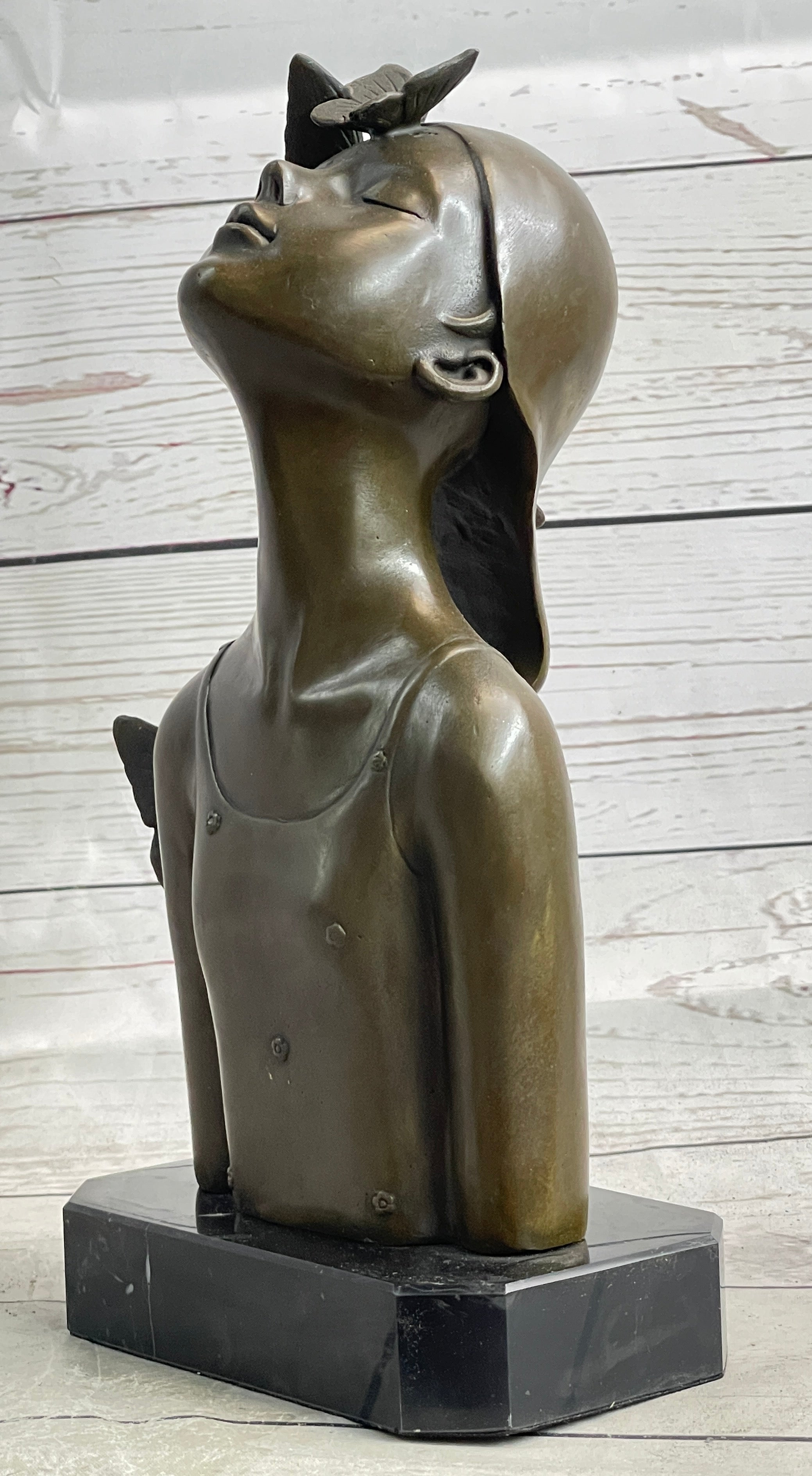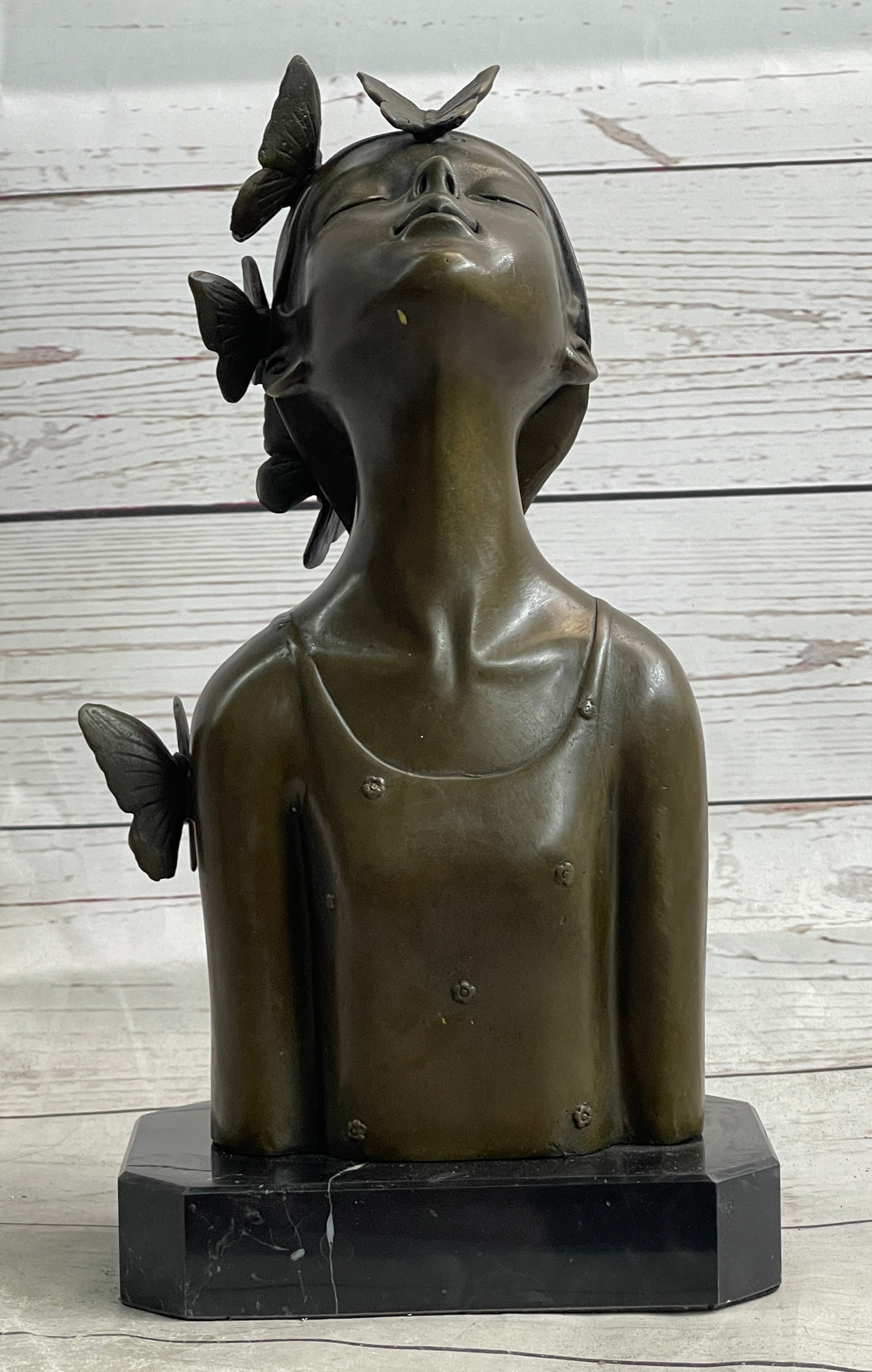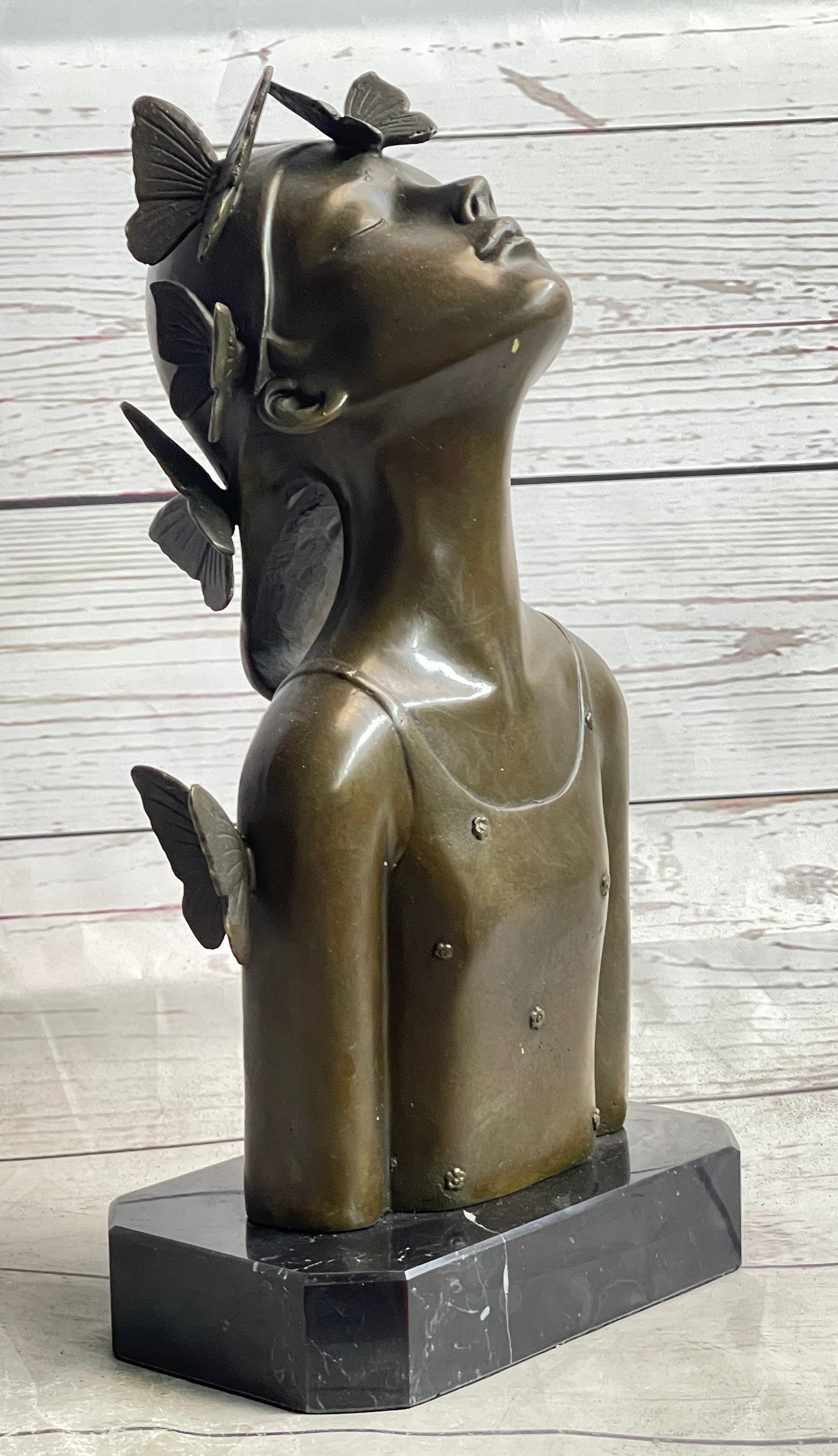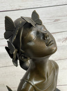 Crafted using the time-honored lost wax method, this handmade bronze sculpture showcases the artist's mastery in capturing the delicate balance between human form and natural elements. The rich brown patina finish adds depth and warmth to the sculpture, enhancing its visual appeal and creating a striking contrast against the black marble base. Every curve and contour of the butterfly girl's bust is expertly sculpted, inviting viewers to explore the layers of symbolism and meaning embedded in the artwork.