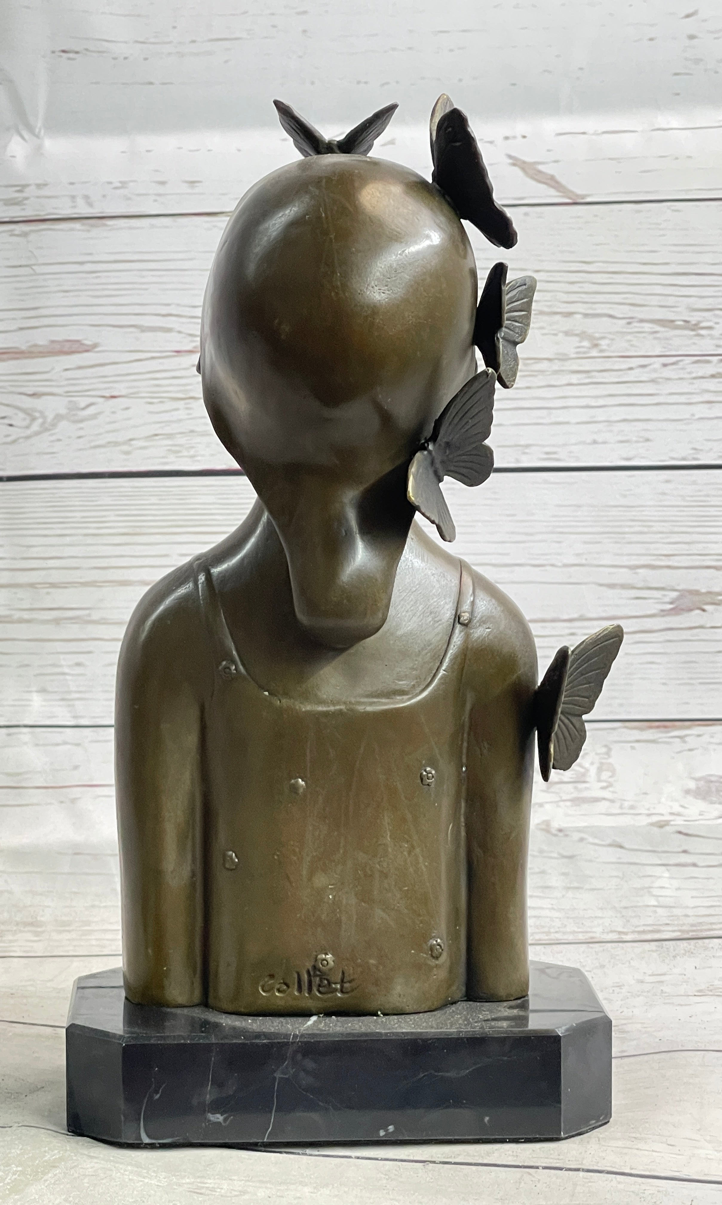 Immerse yourself in the captivating world of abstract modern art with this exquisite bronze sculpture titled "Butterfly Girl Bust" by the talented artist Collet. The sculpture depicts a mesmerizing fusion of a girl and a butterfly, symbolizing transformation, freedom, and beauty. Collet's unique vision is brought to life through intricate details and a dynamic composition that captures the essence of movement and fluidity.