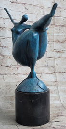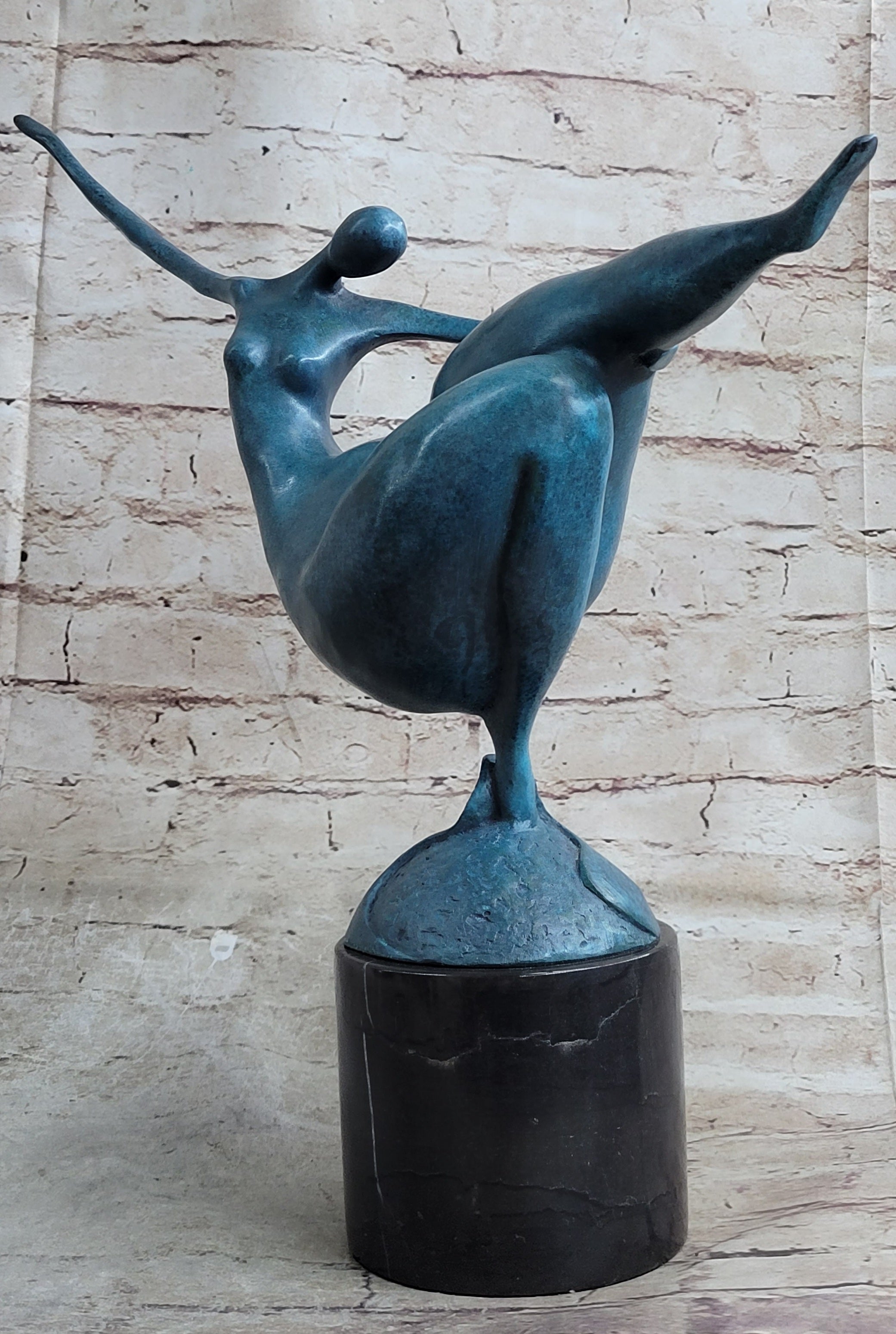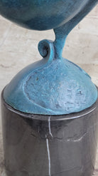 Crafted entirely from 100% bronze and adorned with a greenish patina, this sculpture embodies the artist's vision of femininity. The portrayal of the female figure with its generous hips, slender arms, petite head, and delicate breasts creates a captivating juxtaposition of elements that challenge traditional norms of beauty. Mounted on a sleek rectangular marble base, this piece is not only a visual delight but also a remarkable feat of craftsmanship.