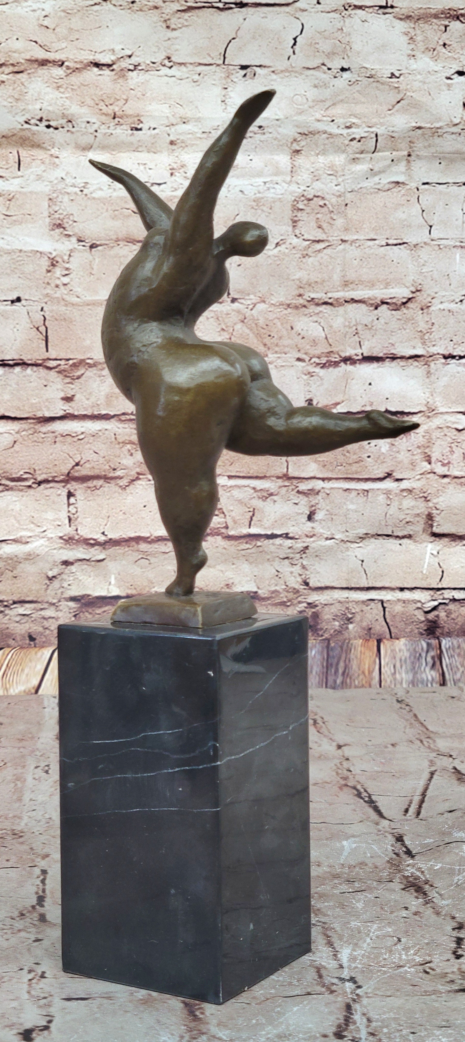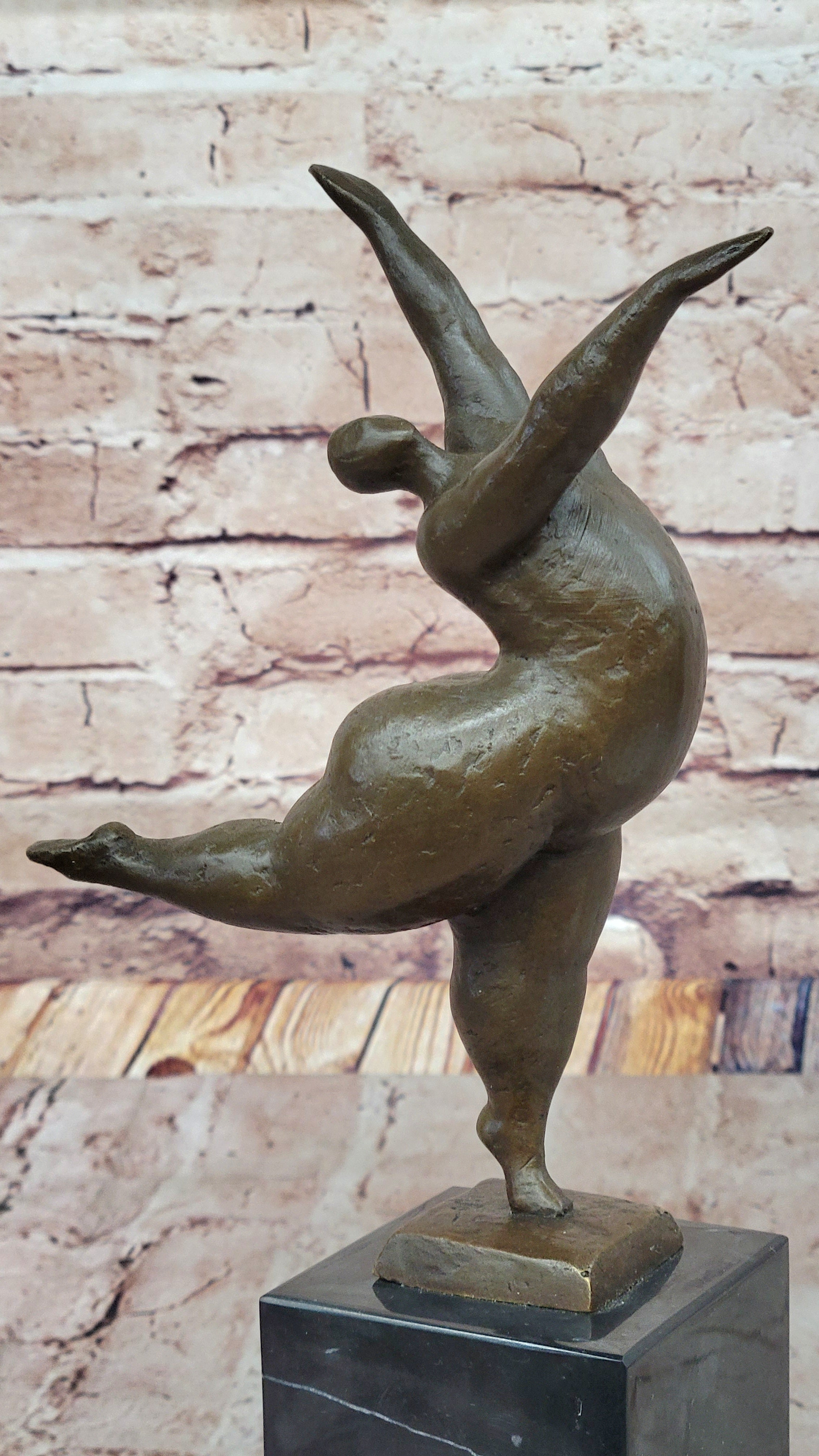 Celebrate the beauty of confidence, grace, and diversity with this abstract bronze sculpture of a pleasantly plump ballerina. The sculpture captures the essence of movement and showcases the dancer's flexibility and grace through her extended limbs and elegant pose. The arabesque, executed with height and poise, reflects the dancer's confidence and the timeless beauty that transcends body size.