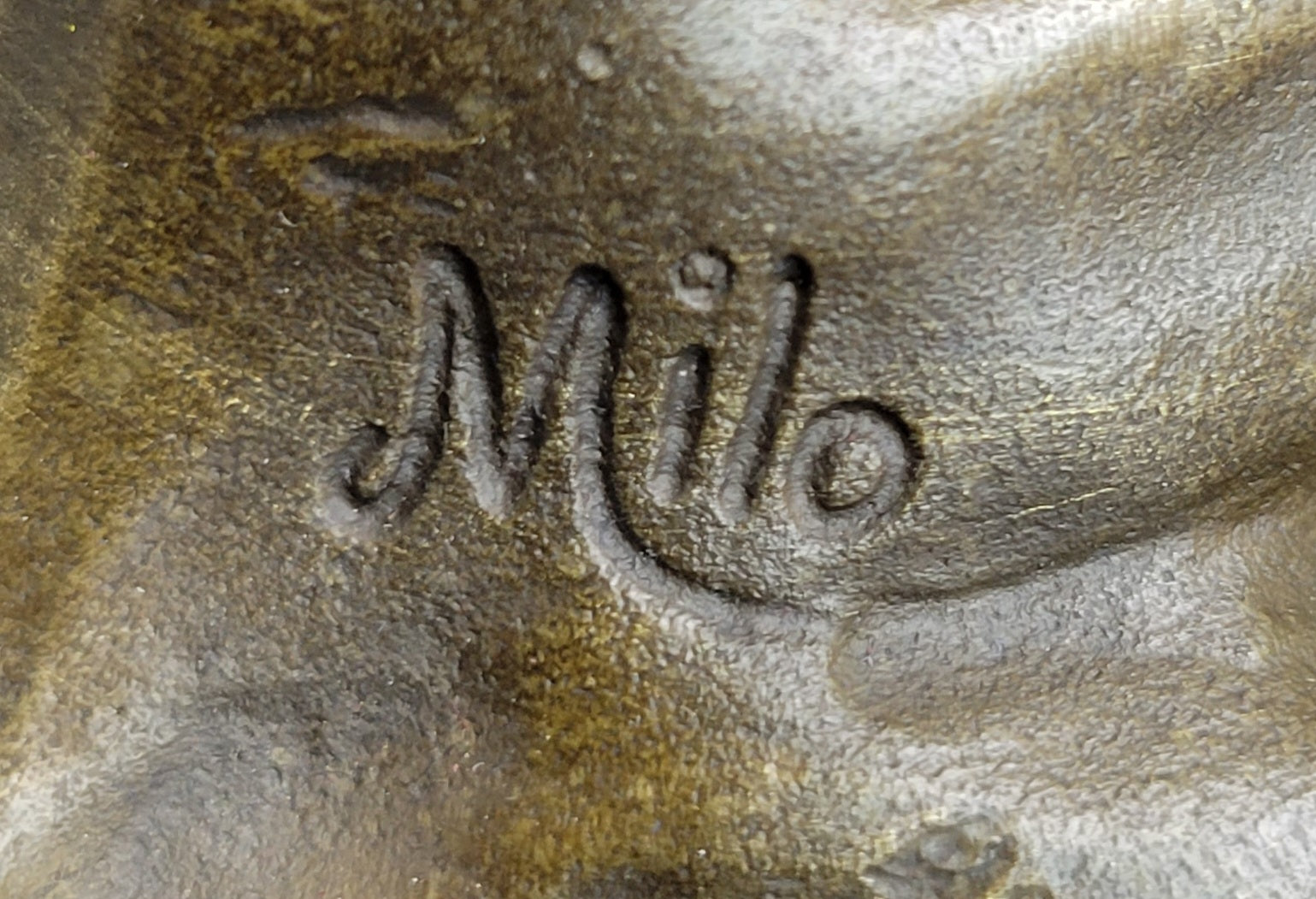 This exquisite bronze bust of a horse captures a moment of raw and vibrant energy. The horse's intense expression and dynamic pose convey a sense of excitement or surprise. With its head bending down towards its body, the flowing mane appears to defy gravity, adding to the impression of the horse in motion. The open mouth, releasing a powerful neigh, further enhances the dramatic scene depicted in this sculpture. Every detail of the horse's anatomy and features is meticulously crafted, showcasing the artist's skill and attention to realism. This bronze sculpture is a testament to the timeless beauty and elegance of these majestic creatures. It is a versatile piece that will make a captivating addition to any mantle, shelf, or table, creating a focal point in any space. Handmade with precision, this sculpture is crafted using the traditional "Lost Wax Method," ensuring the finest quality and authenticity. Mounted on a sturdy marble base, it provides a stable foundation for this remarkable artwork. The sculpture is signed by the esteemed artist Milo, adding to its collectible value and confirming its originality and artistic merit.