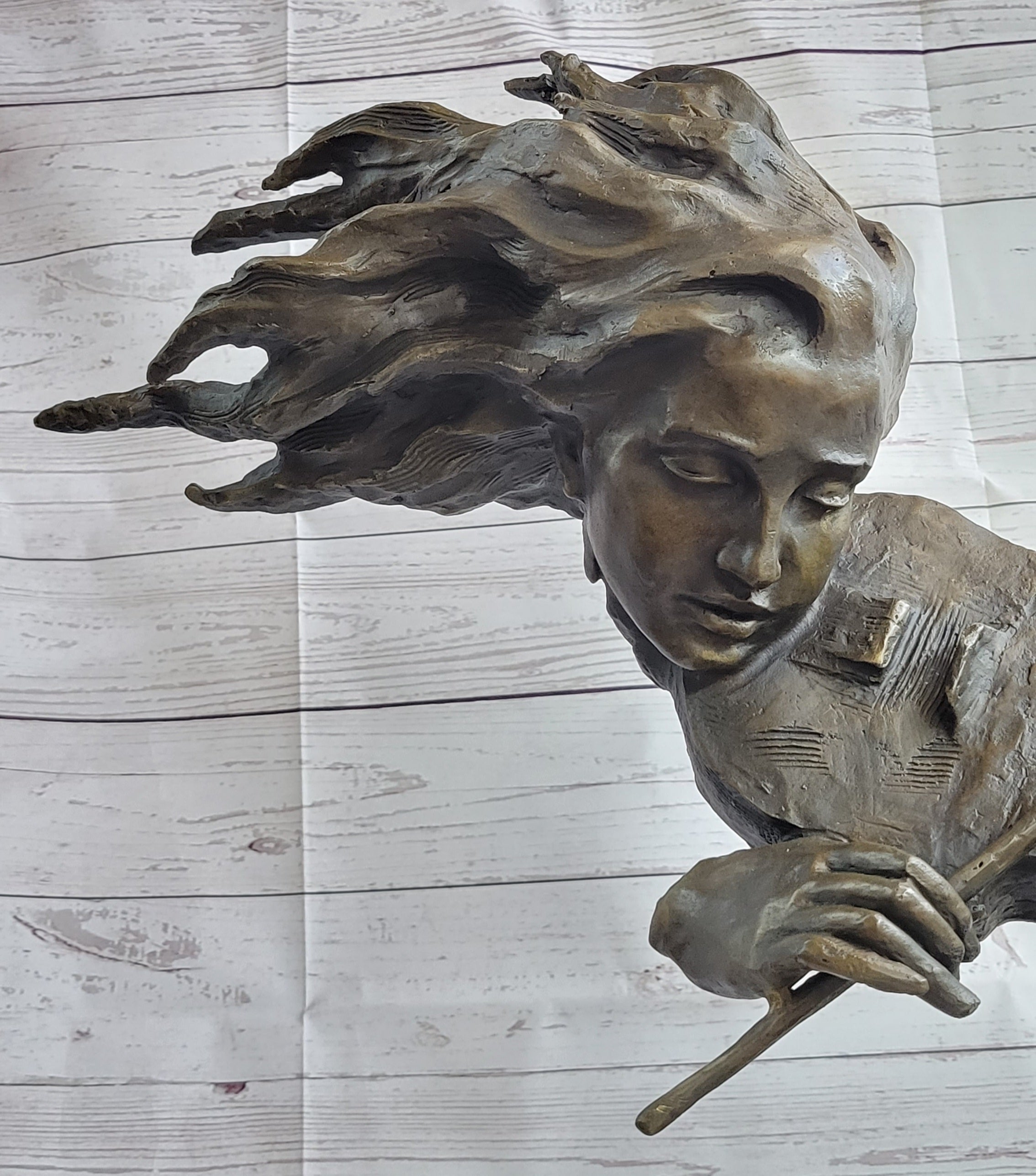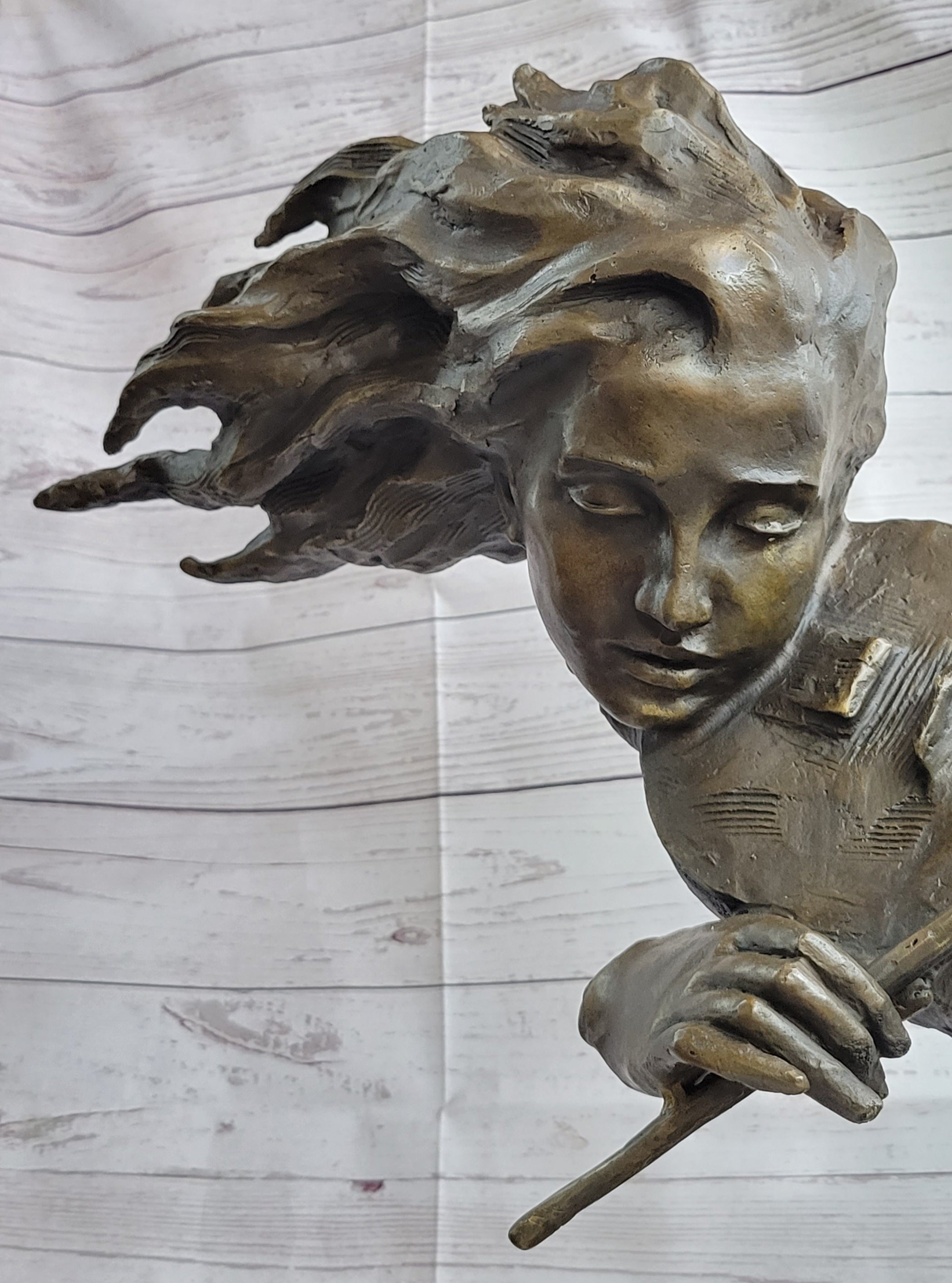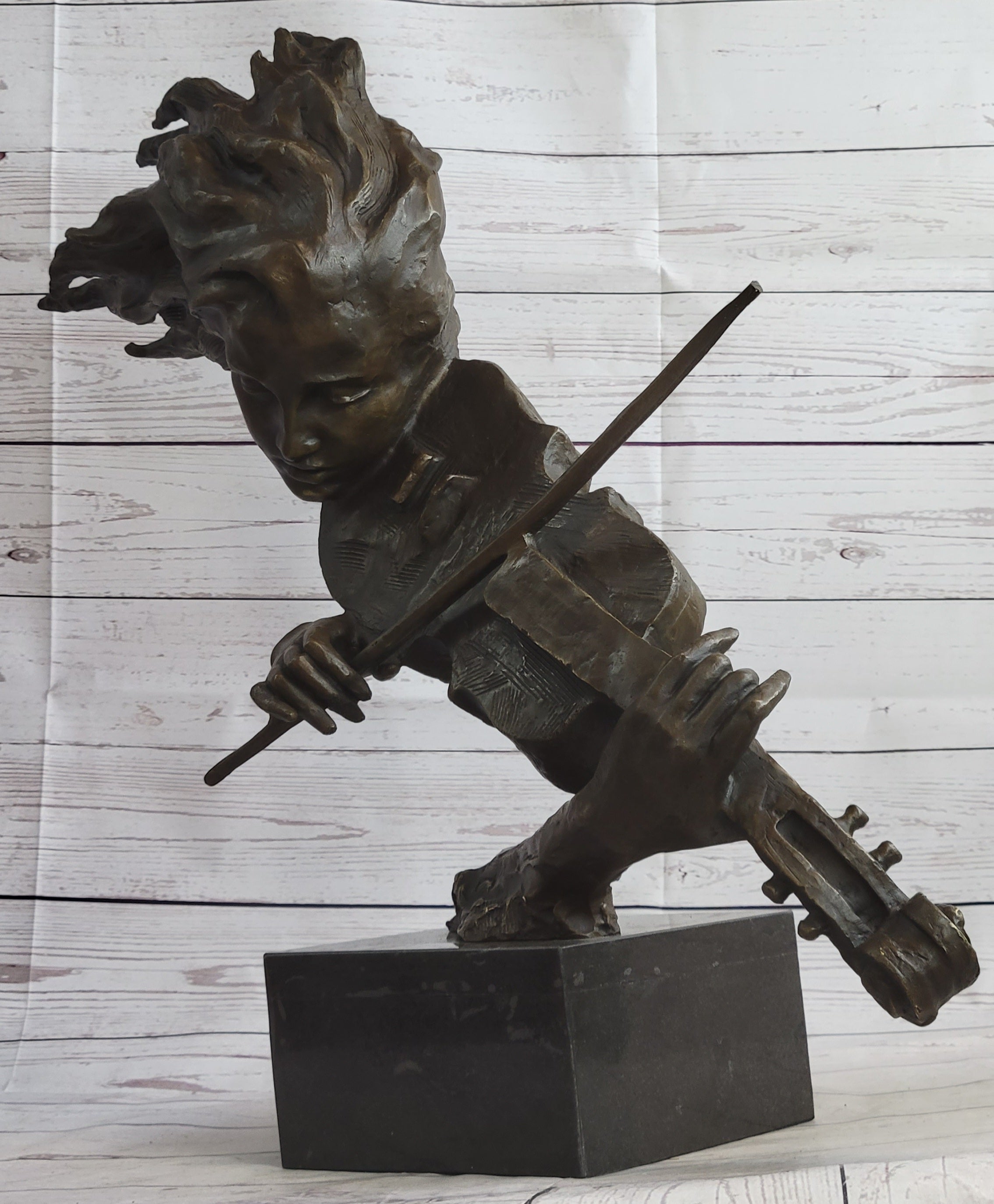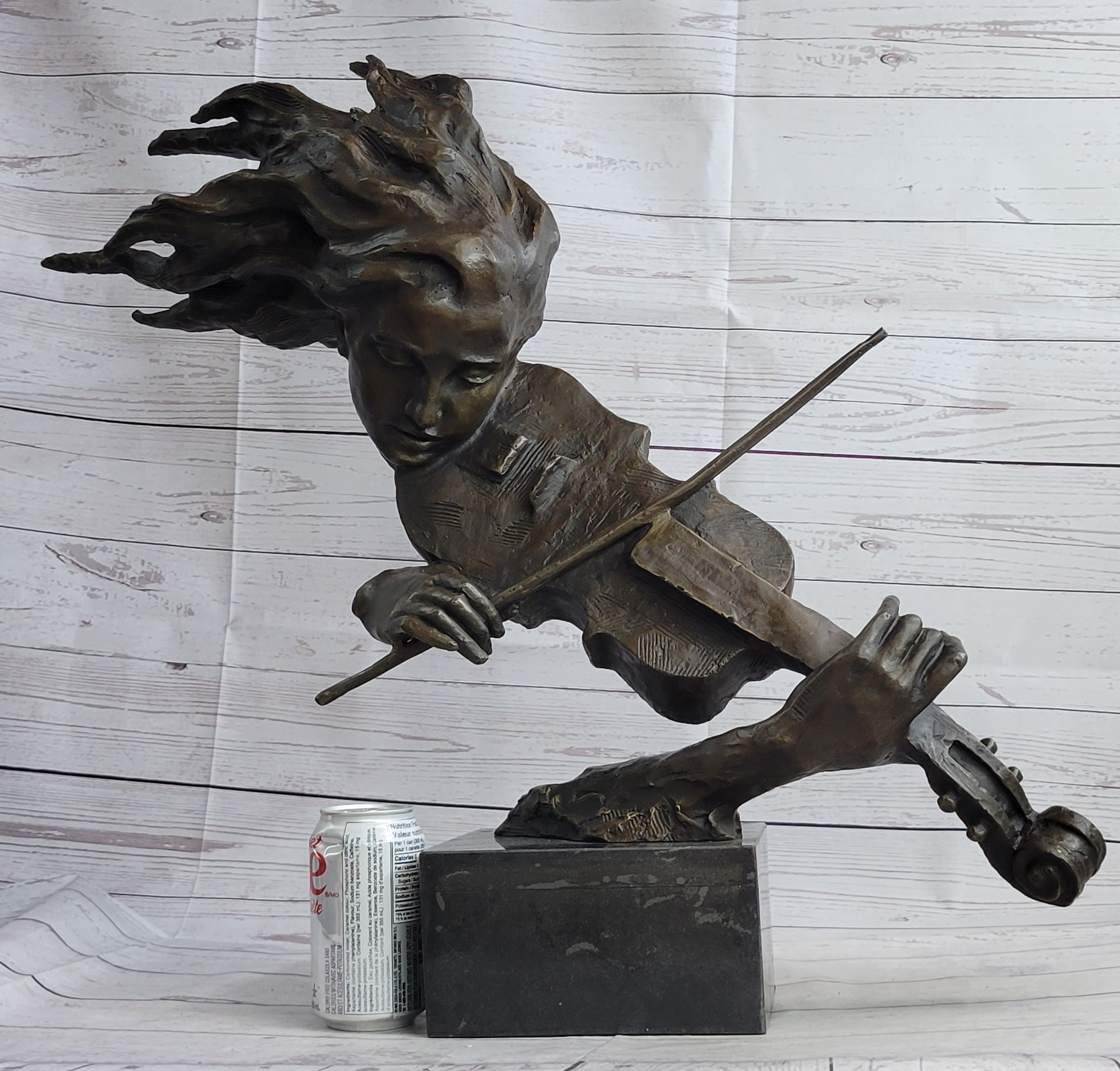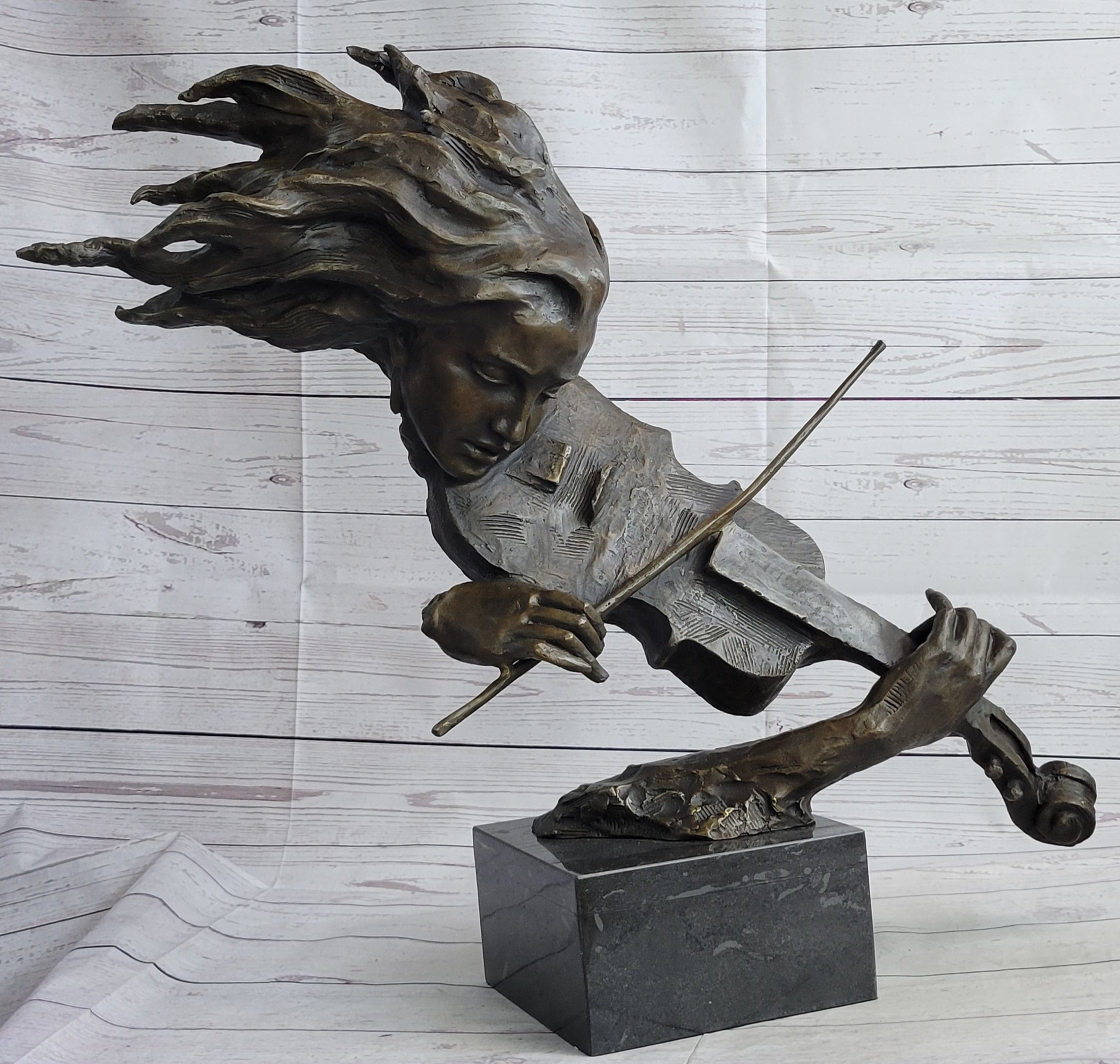 Immerse yourself in the captivating world of music and art with this mesmerizing bronze sculpture. The graceful figure of a woman comes to life as her hair flows in the wind, and she becomes one with the enchanting sound of her violin. With eyes closed and a sense of tranquility, she skillfully draws her bow across the strings, creating sweet melodies that resonate in harmony with her soul.