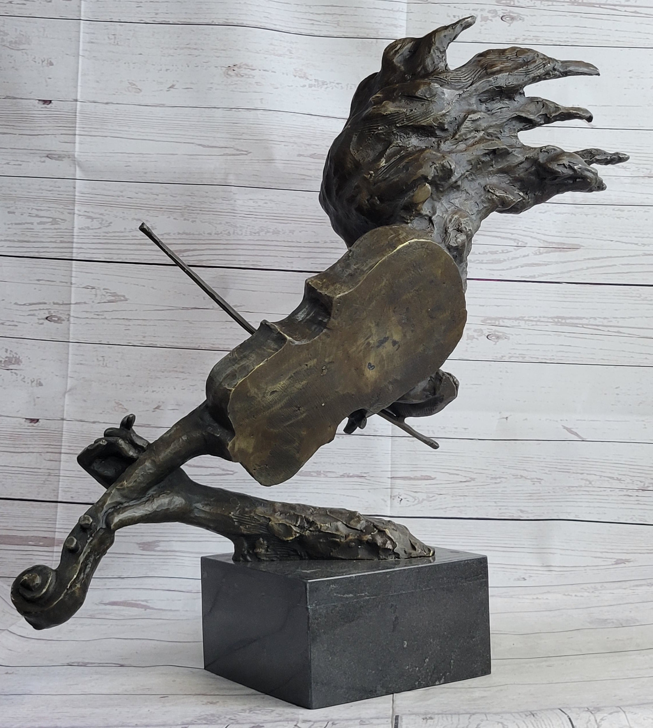 Handmade using the time-honored "Lost Wax Method," this 100% bronze sculpture features a Brown patina finish, lending it a timeless allure. Signed by the renowned artist Milo, this magnificent piece is perfect for both music lovers and art enthusiasts alike. Let the beauty and eccentricity of this sculpture captivate your senses and make it a cherished addition to your collection or an unforgettable gift for someone special.Bronze Dimensions with Marble Base: Height 23" X Width 31"