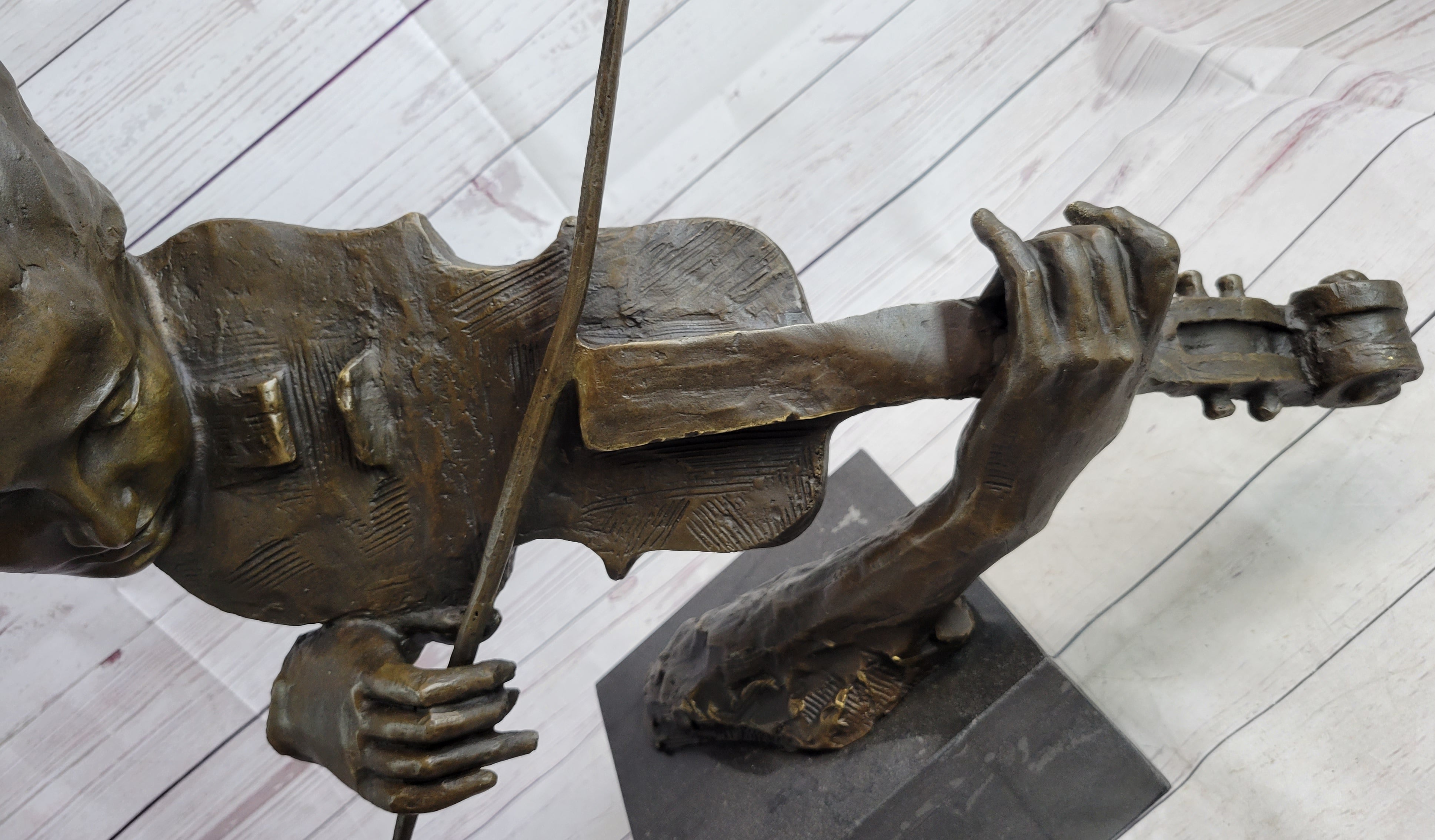 This unique and intricate piece showcases the artist's remarkable craftsmanship. With only one arm mounted to the base, the sculpture is meticulously held together, piece by piece, accentuating the artist's attention to detail. The violin, adorned with marks from the artist's tools, is delicately portrayed, and the woman's fingers gently press down on the strings, bringing the instrument to life. The other hand and bow gracefully complement the composition, while her expressive face and lips add a touch of realism to this masterpiece.