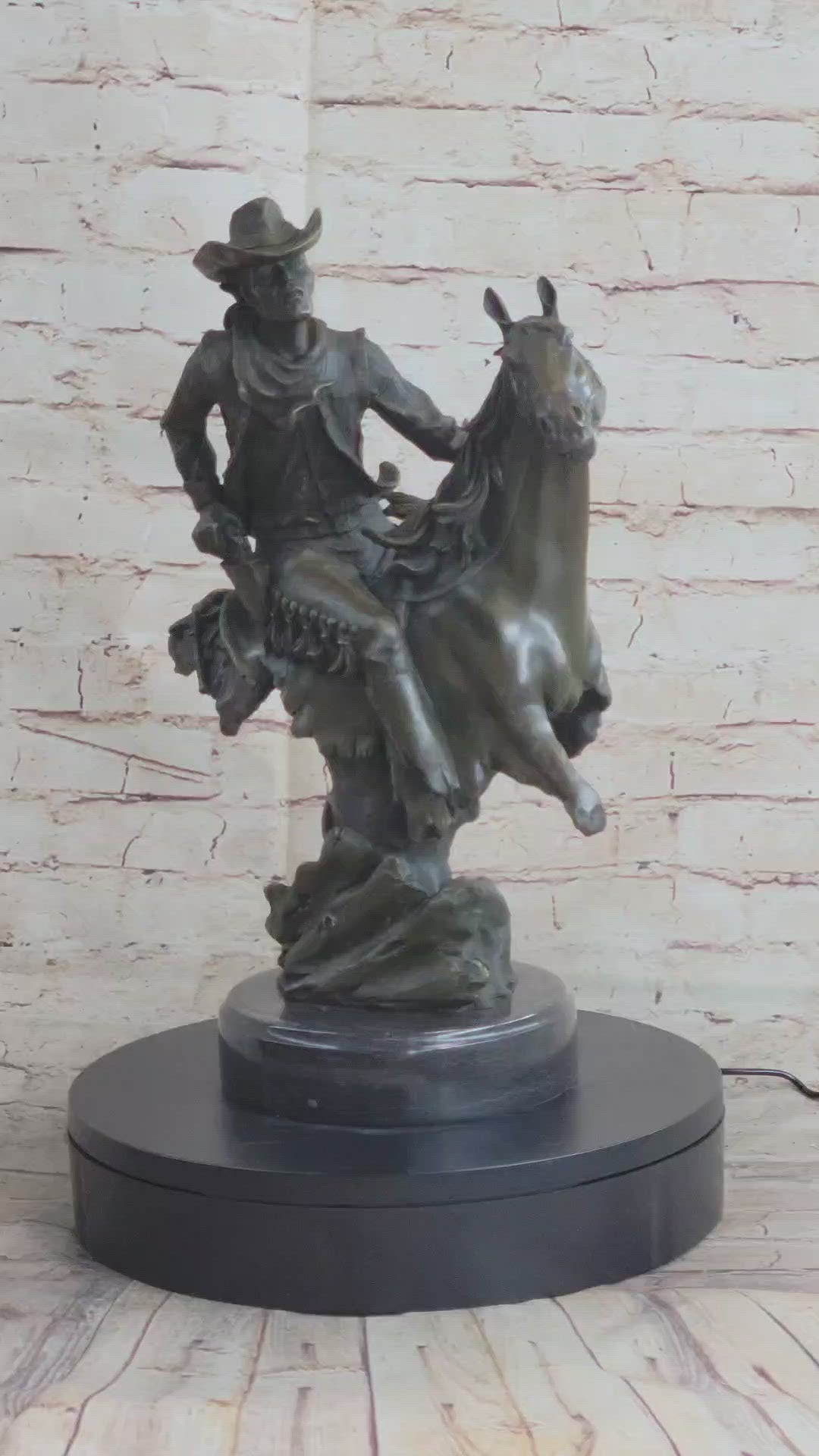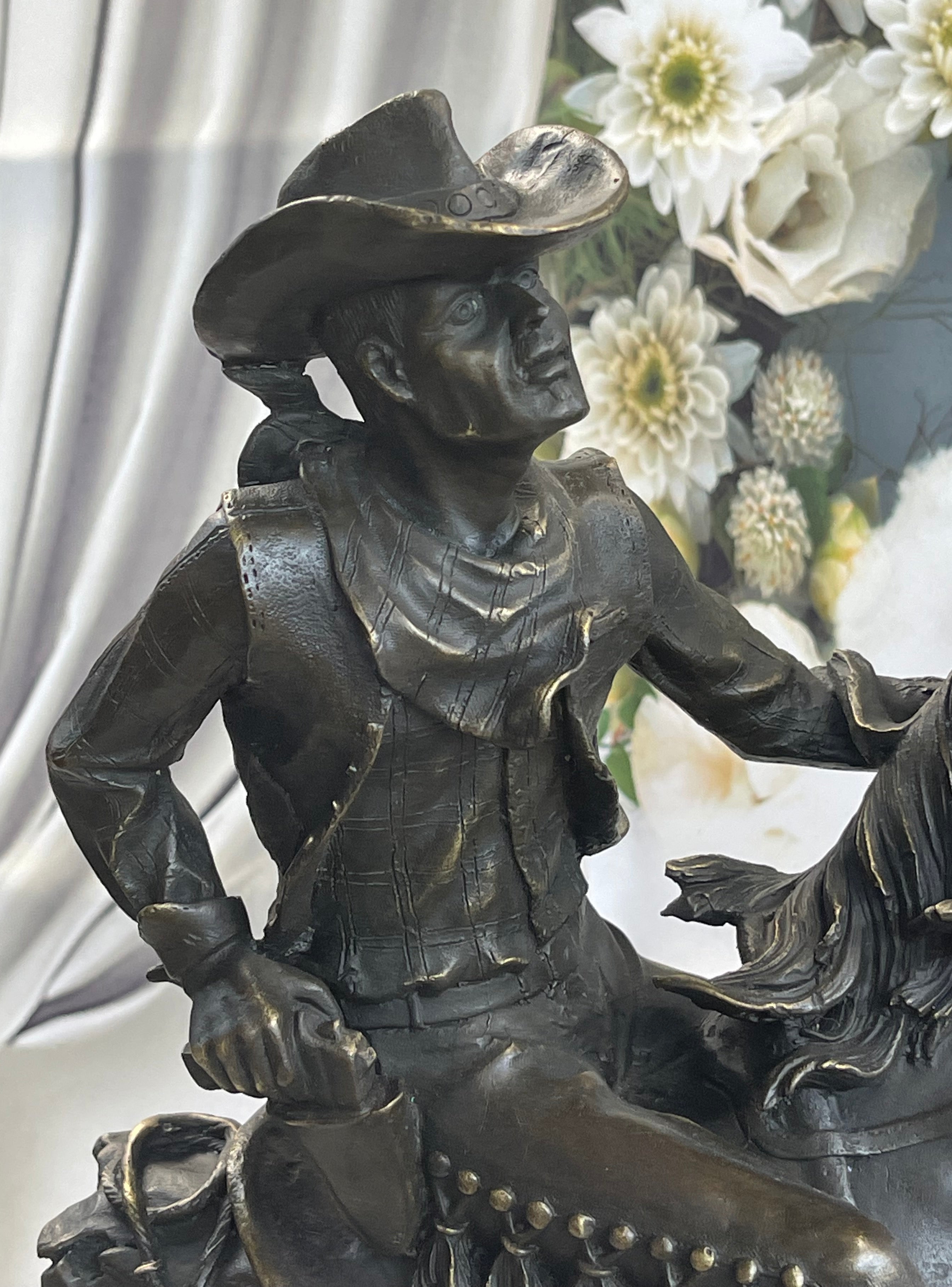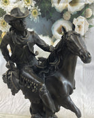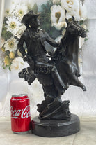 Immerse yourself in the daring narratives of the Old West with "The Outlaw's Standoff," a bronze masterpiece that embodies the essence of frontier life. Crafted with precision using the lost wax method, this sculpture showcases a fearless cowboy skillfully navigating the treacherous Wild West landscape. With reins held tight and a gun blazing, he's no novice but a seasoned rider, embodying the spirit of those who shaped the history of America's frontier. This sculpture is a fitting homage to the magnificent tales of the American cowboy, standing proudly on a sleek black marble base that adds an air of sophistication to any space.