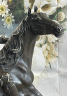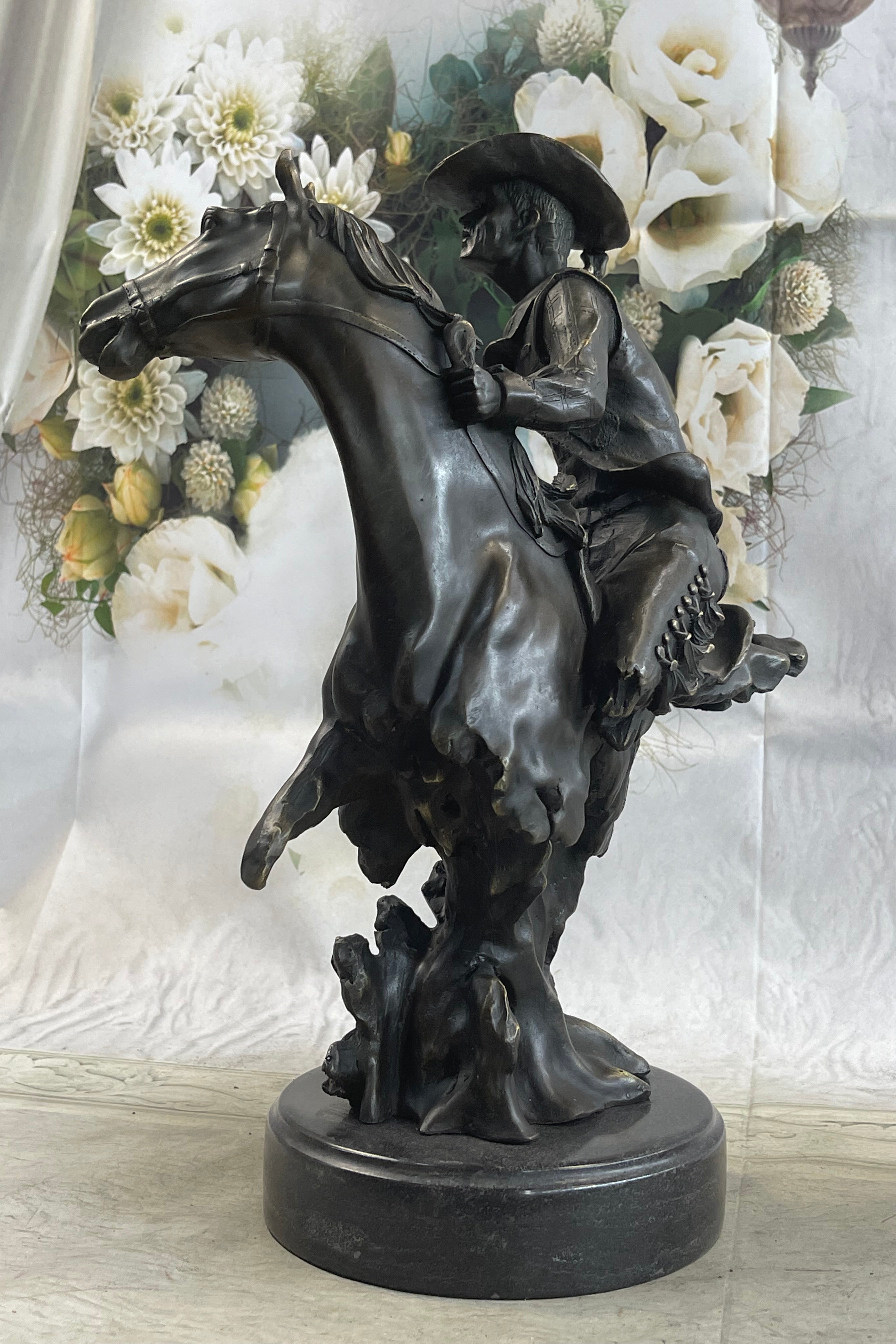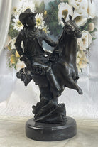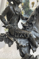 "The Outlaw's Standoff" is more than a bronze sculpture; it's a piece of history that captures the bravery and tenacity of those who carved their names into the annals of the Wild West. The cowboy's determined stance on his fast-moving horse is a testament to the grit and resilience of the pioneers who tamed the frontier. This striking work of art is the perfect addition to any collector's trove, a tangible symbol of the American West's indomitable spirit.Bronze Dimensions With Marble Base: Height 15" X Width 12"