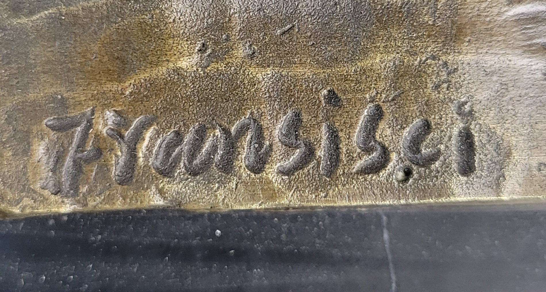 The sculpture features a rich brown patina that accentuates the intricate details and textures of the bronze. Resting on a black marble base, it exudes a sense of stability and sophistication. Adding to its authenticity and value, the sculpture bears the signature of the renowned artist Francisci, a mark of the artist's mastery and dedication to their craft.