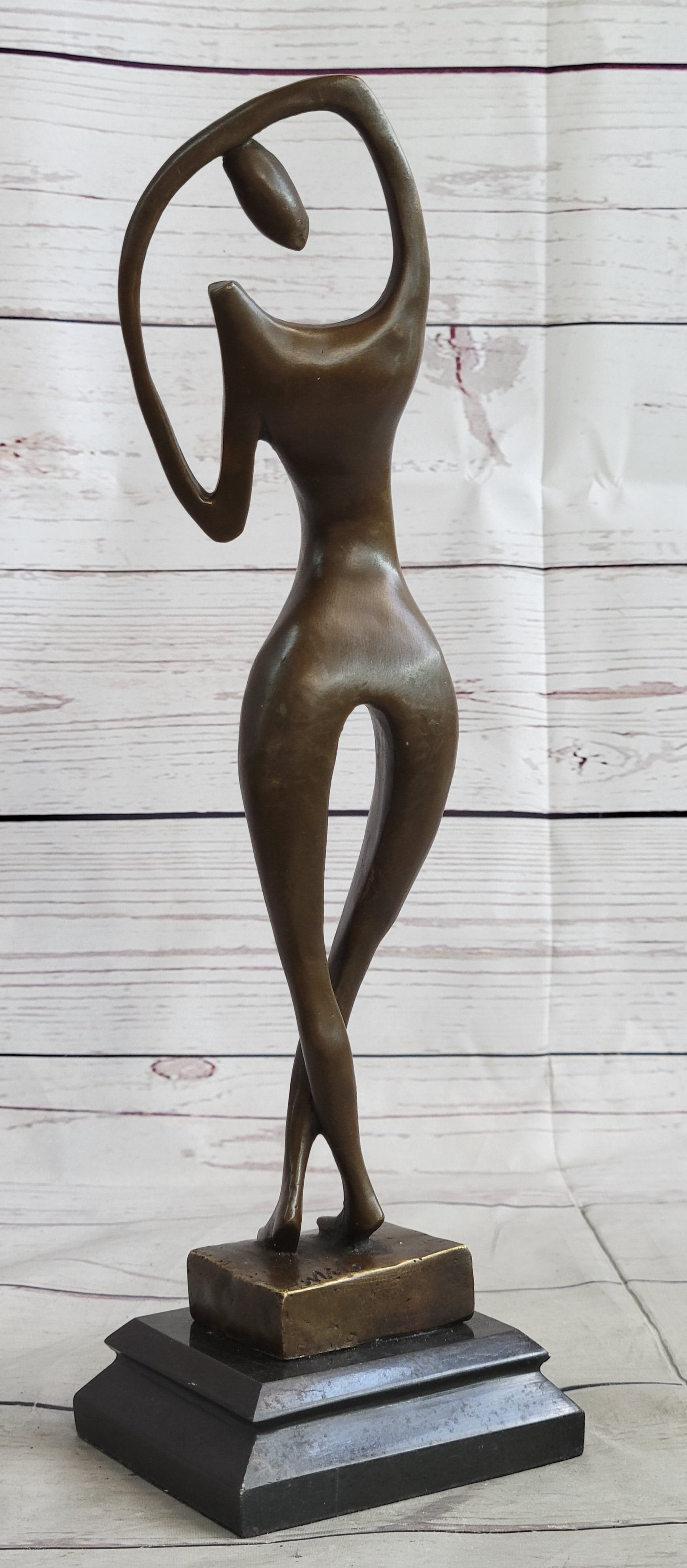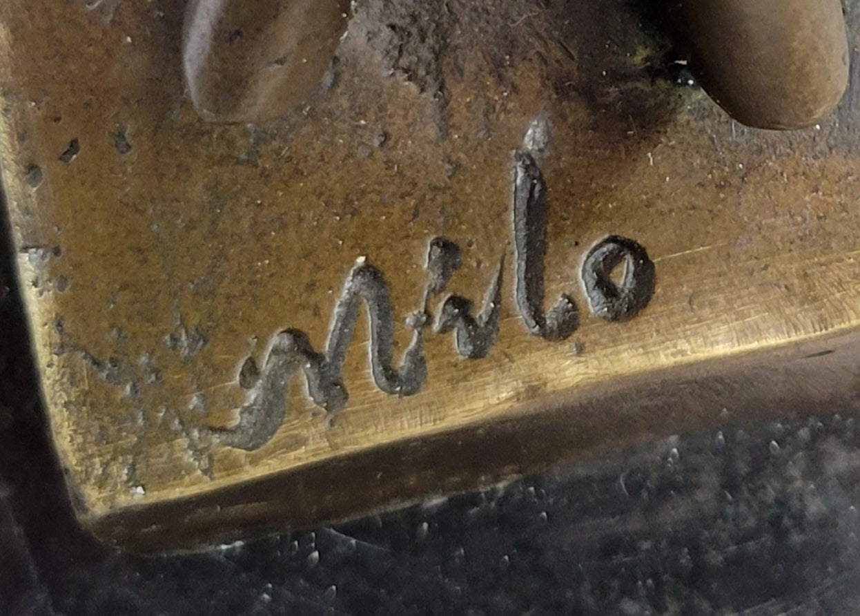 The suggestive female form pulls out of the base from the hem of a fanned skirt that evolves into the definition of her bent leg. Her arms both rest on her head; one in the shape of an angle while the other a circular motion in combination with her long hair. The sculptures creates an essence of spiritual freedom that distorts the distinction of the body`s form. The bronze sculpture was captured using the ancient method of lost-wax casting and stained with a brown patina finish for preservation. It is mounted upon a black marble base with the artist Milo`s signature.Bronze Dimensions with Marble Base: Height 13" x Width 4"