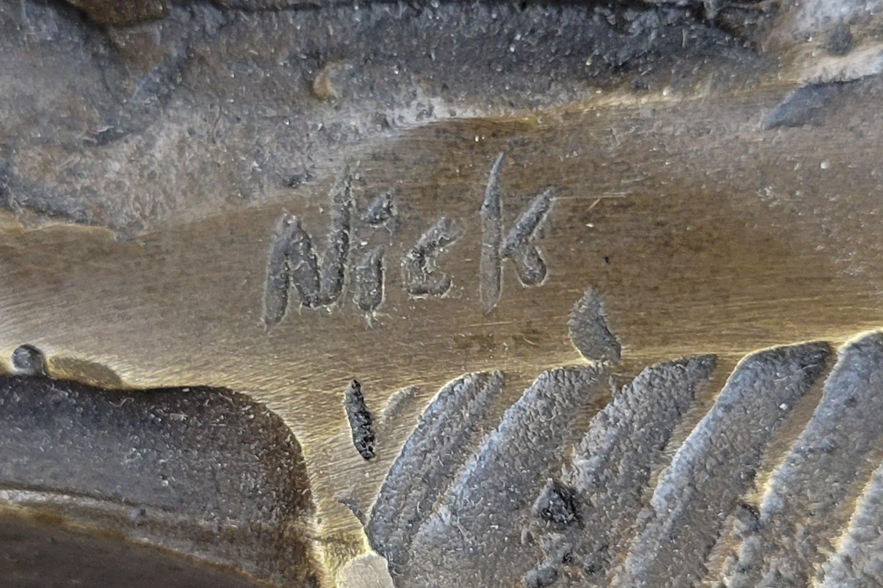 This unique artwork is bound to spark conversations and ignite a multitude of interpretations and ideas. Its thought-provoking design invites viewers to delve into their own perceptions and meanings. Signed by the talented artist Mario Nick, this sculpture embodies his artistic vision and creativity.