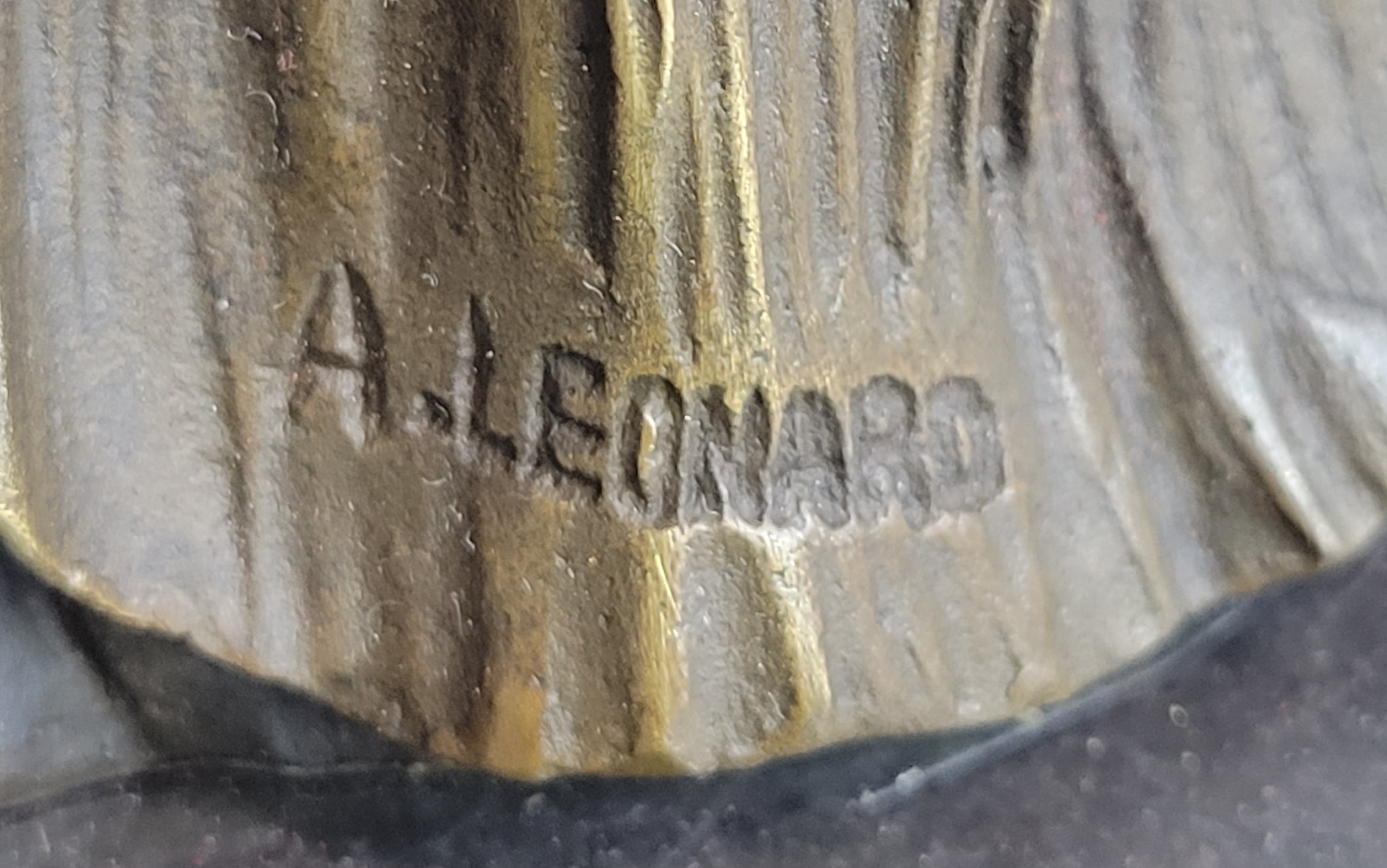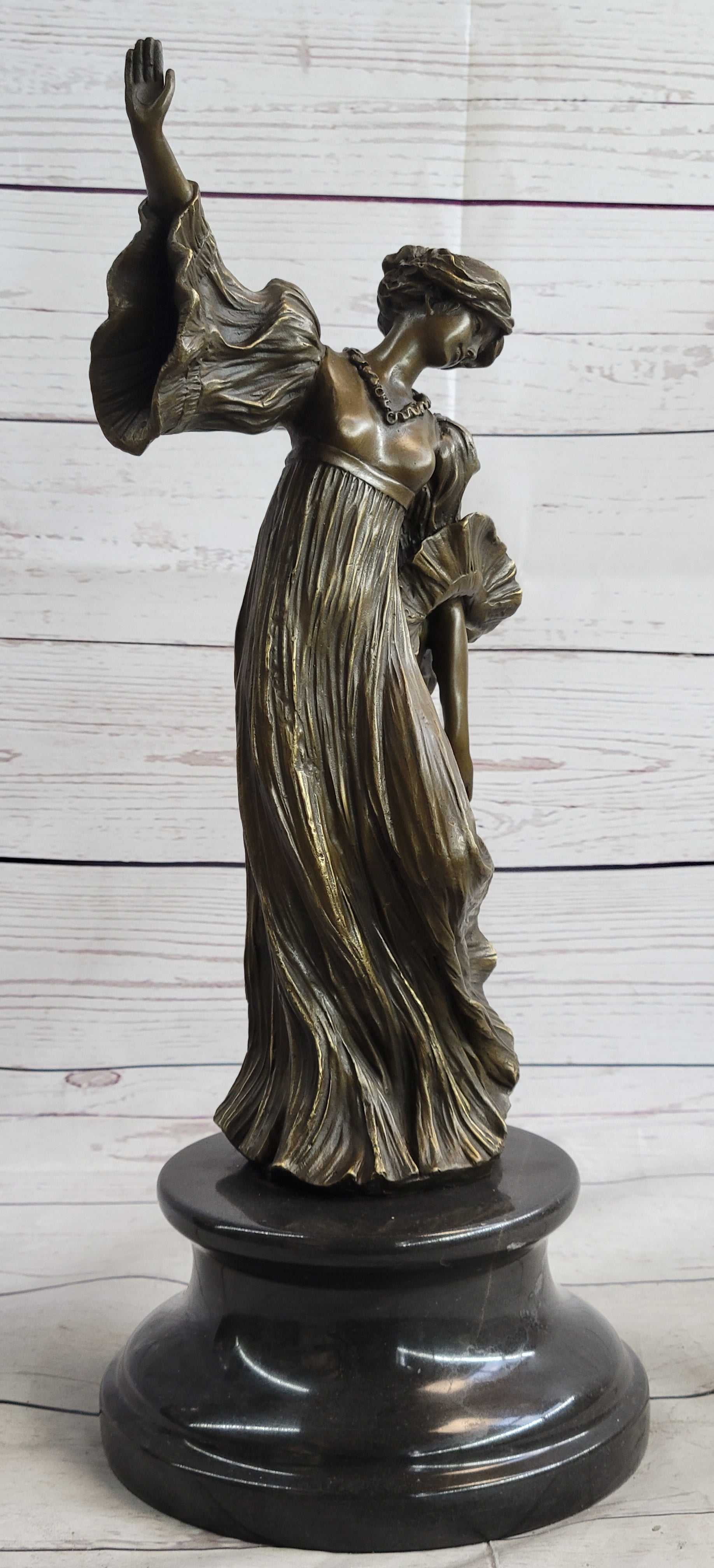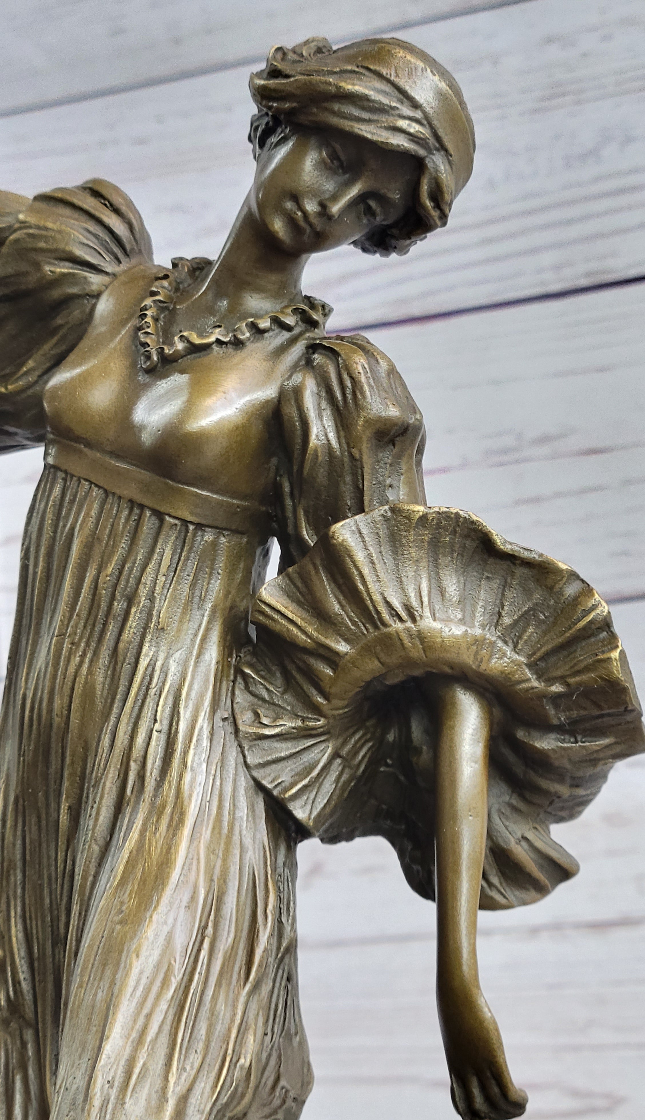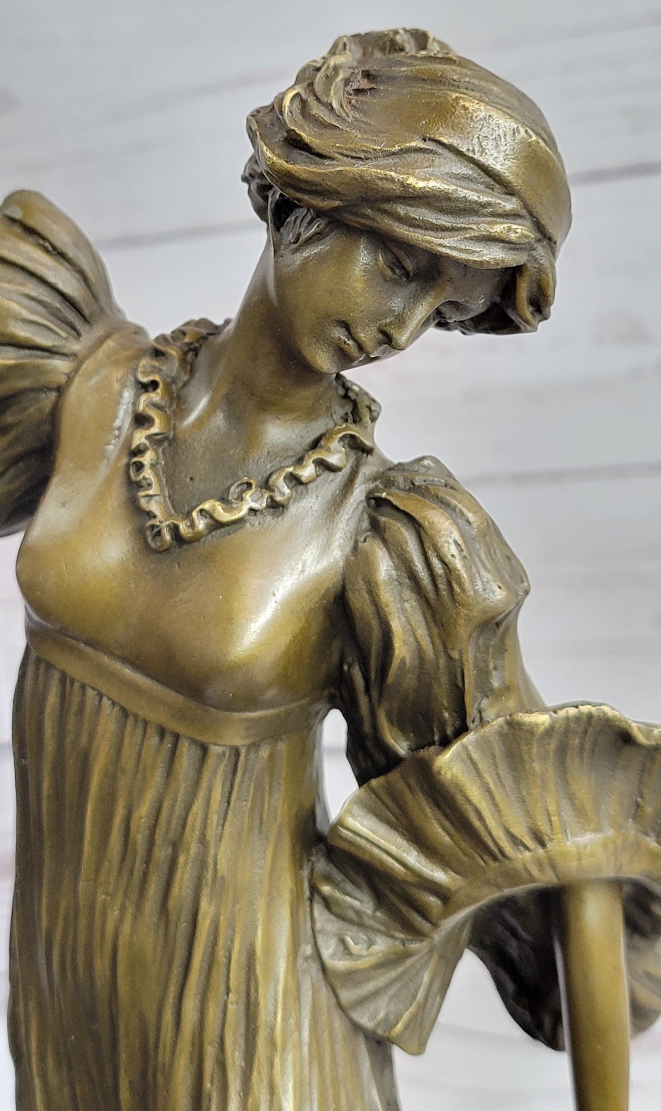 Crafted using the ancient "Lost Wax Method," this sculpture is a testament to the artist's dedication to preserving the fine art tradition. The brown patina finish adds depth and character to the piece, enhancing its overall allure. Standing at 100% handmade bronze, the sculpture is mounted on a triple black marble base, further elevating its aesthetic appeal. This masterpiece is signed by the artist A. Leonard, adding a touch of quality and artistry to this captivating portrayal of timeless beauty. Display this sculpture as a focal point in your space, celebrating the enduring charm of classic artistry.Bronze Dimensions with Marble Base: Height 16" X Width 6.5"