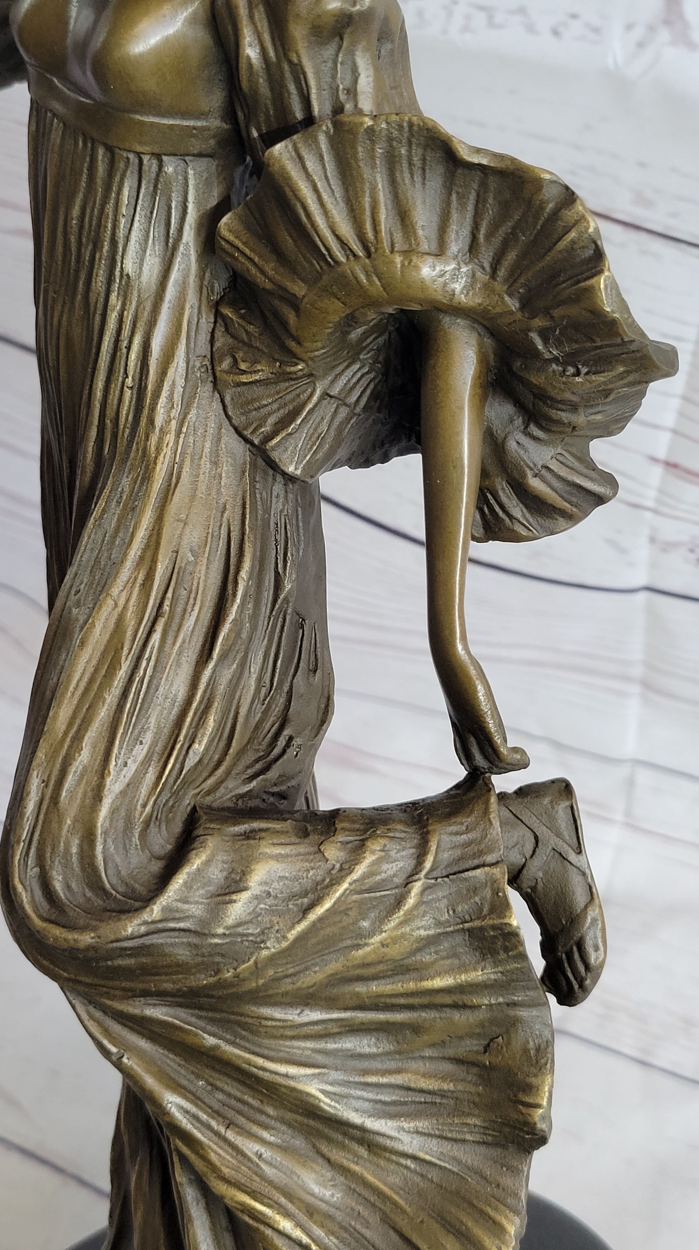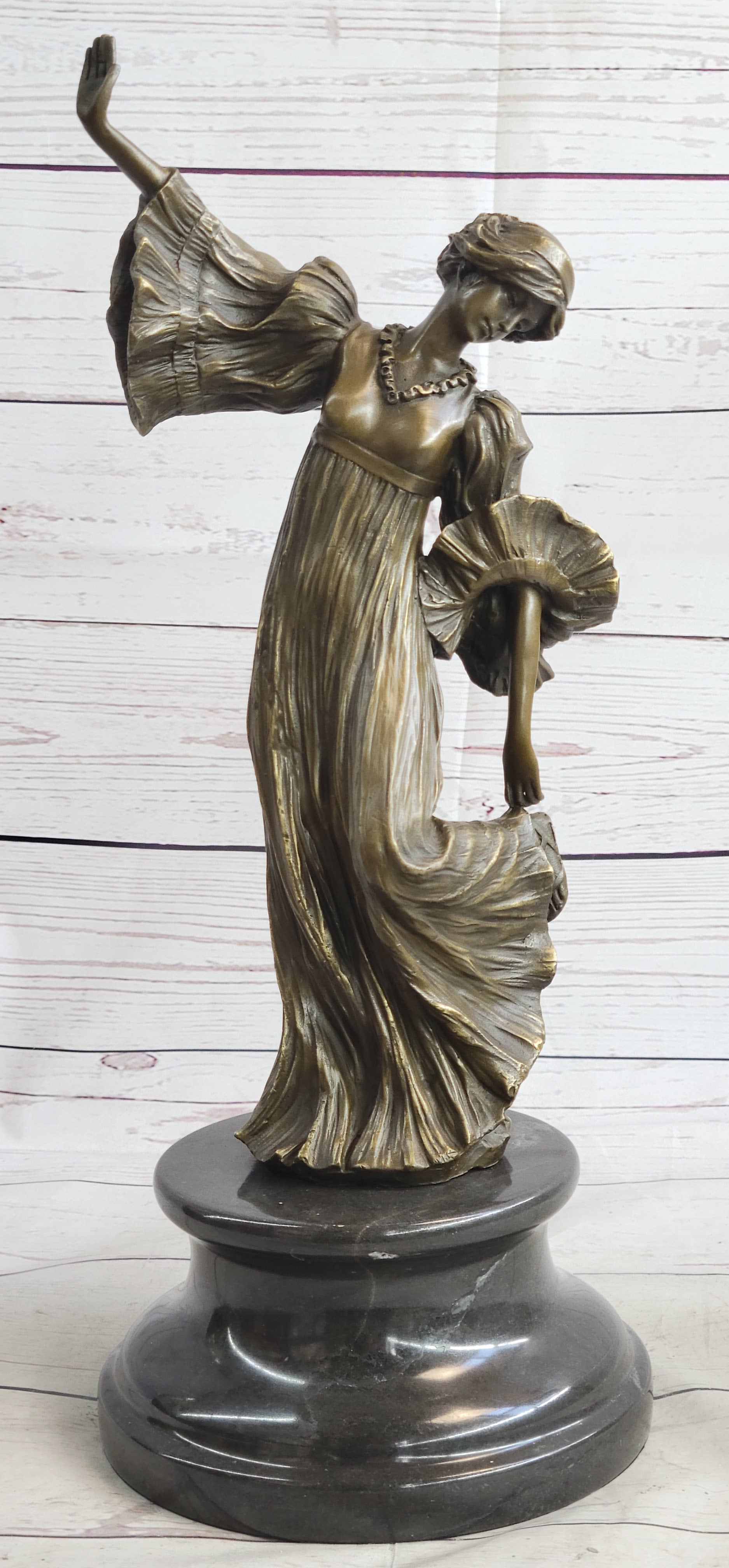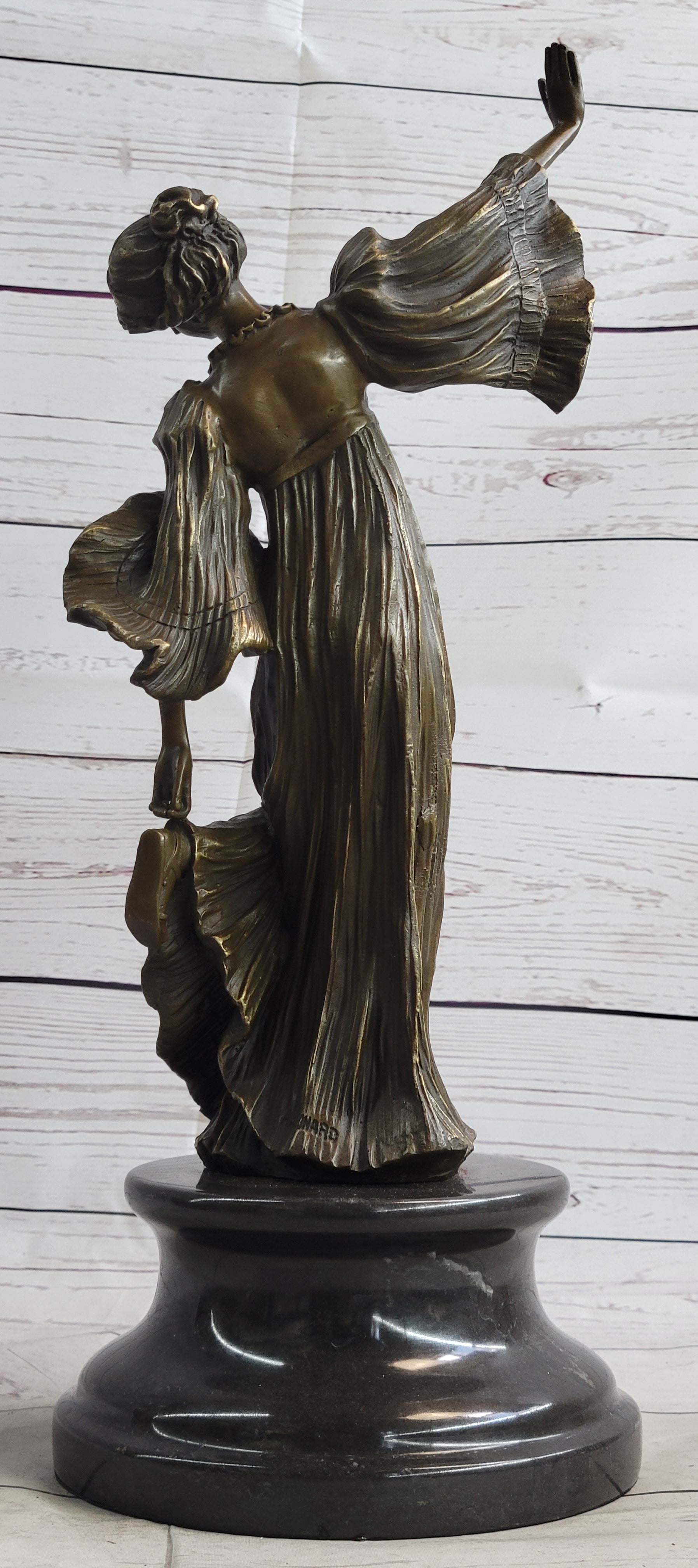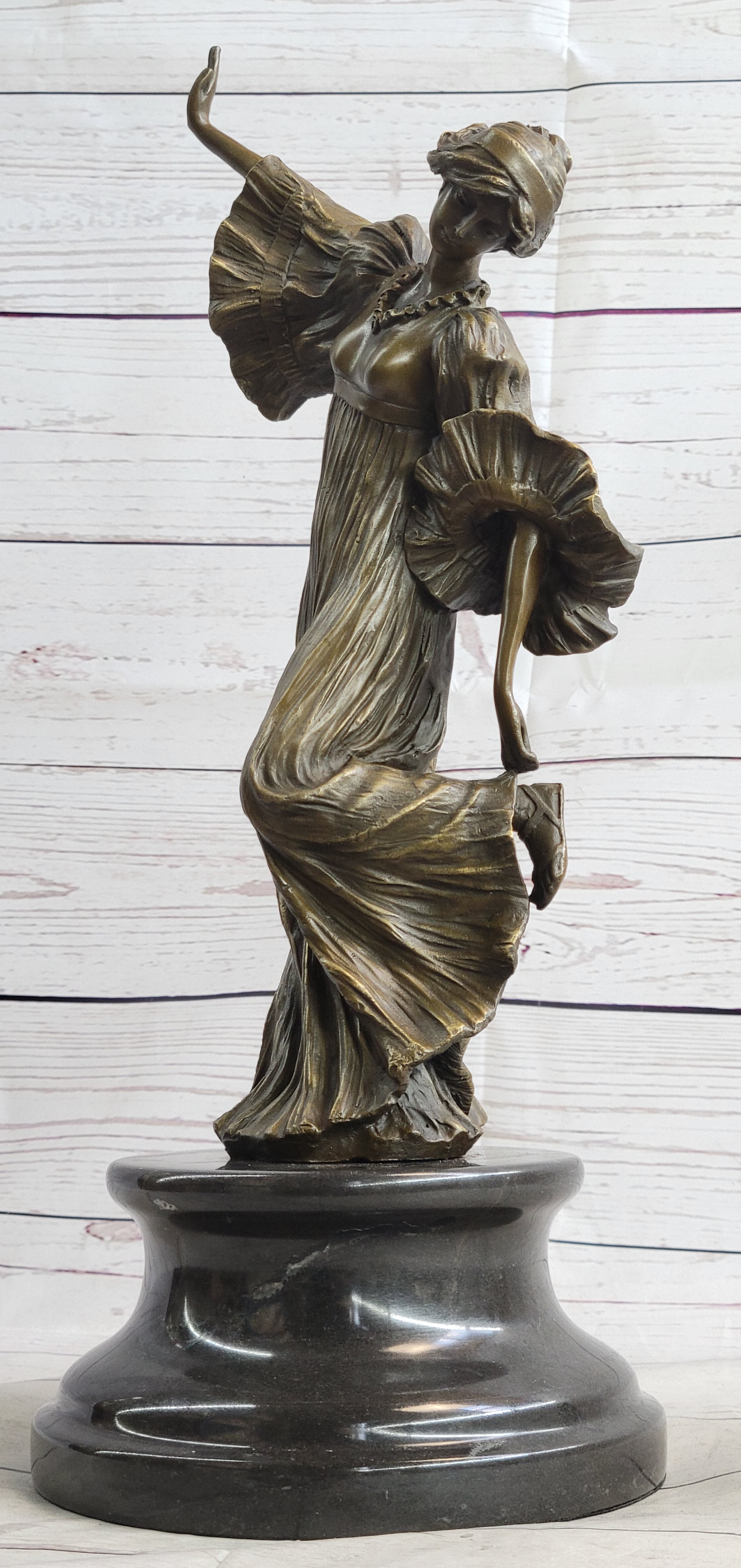 Crafted using the ancient "Lost Wax Method," this sculpture is a testament to the artist's dedication to preserving the fine art tradition. The brown patina finish adds depth and character to the piece, enhancing its overall allure. Standing at 100% handmade bronze, the sculpture is mounted on a triple black marble base, further elevating its aesthetic appeal. This masterpiece is signed by the artist A. Leonard, adding a touch of quality and artistry to this captivating portrayal of timeless beauty. Display this sculpture as a focal point in your space, celebrating the enduring charm of classic artistry.Bronze Dimensions with Marble Base: Height 16" X Width 6.5"