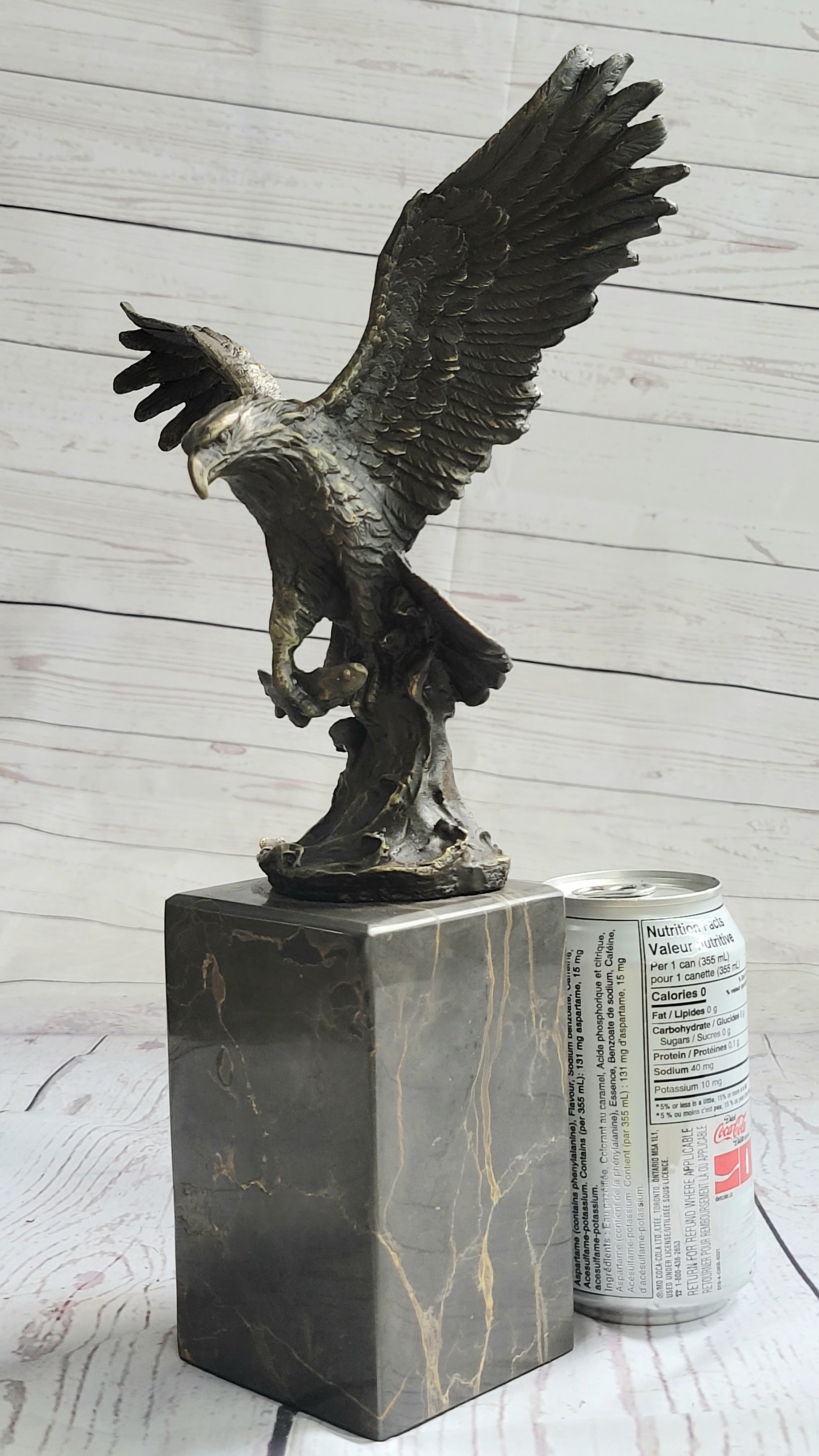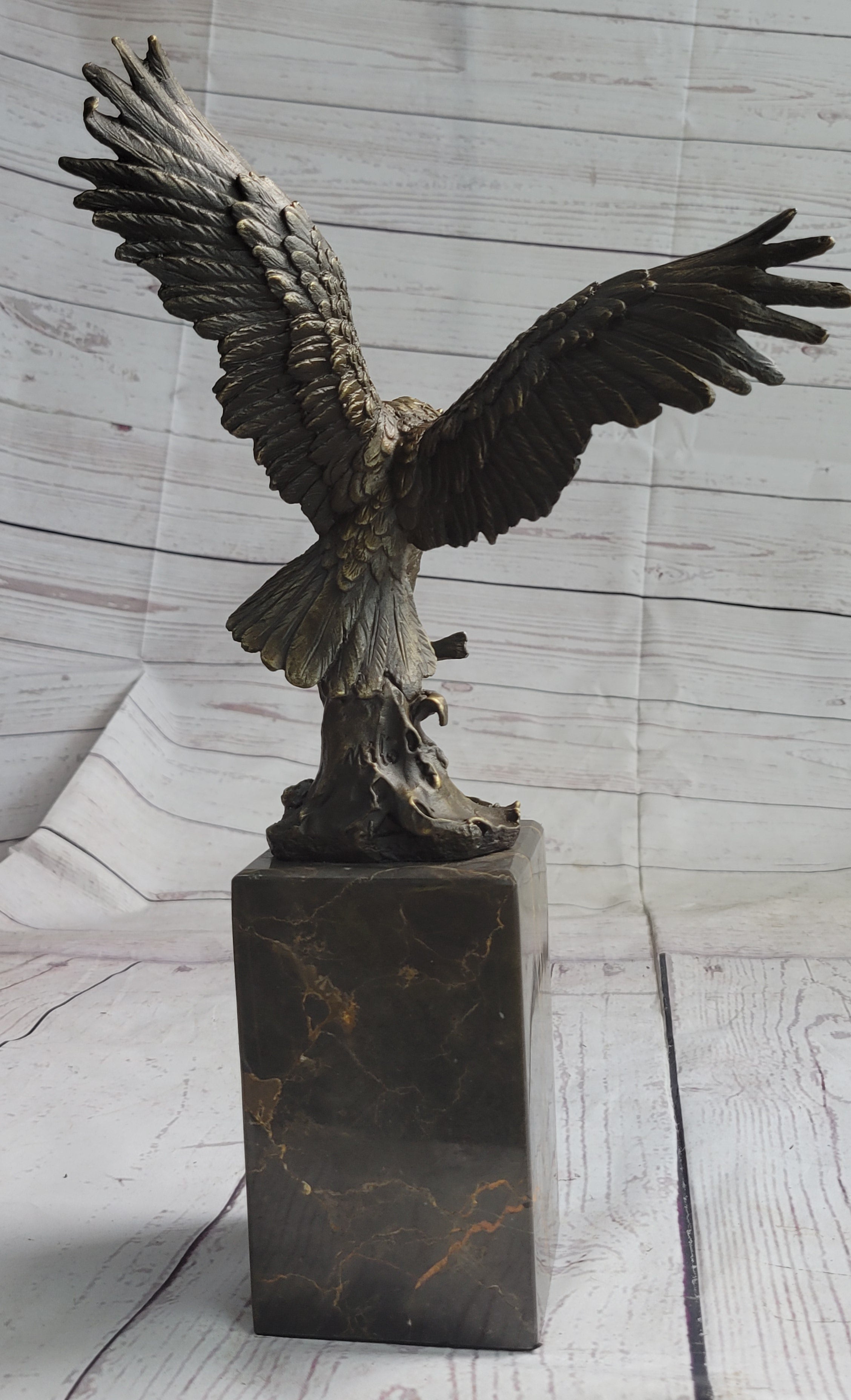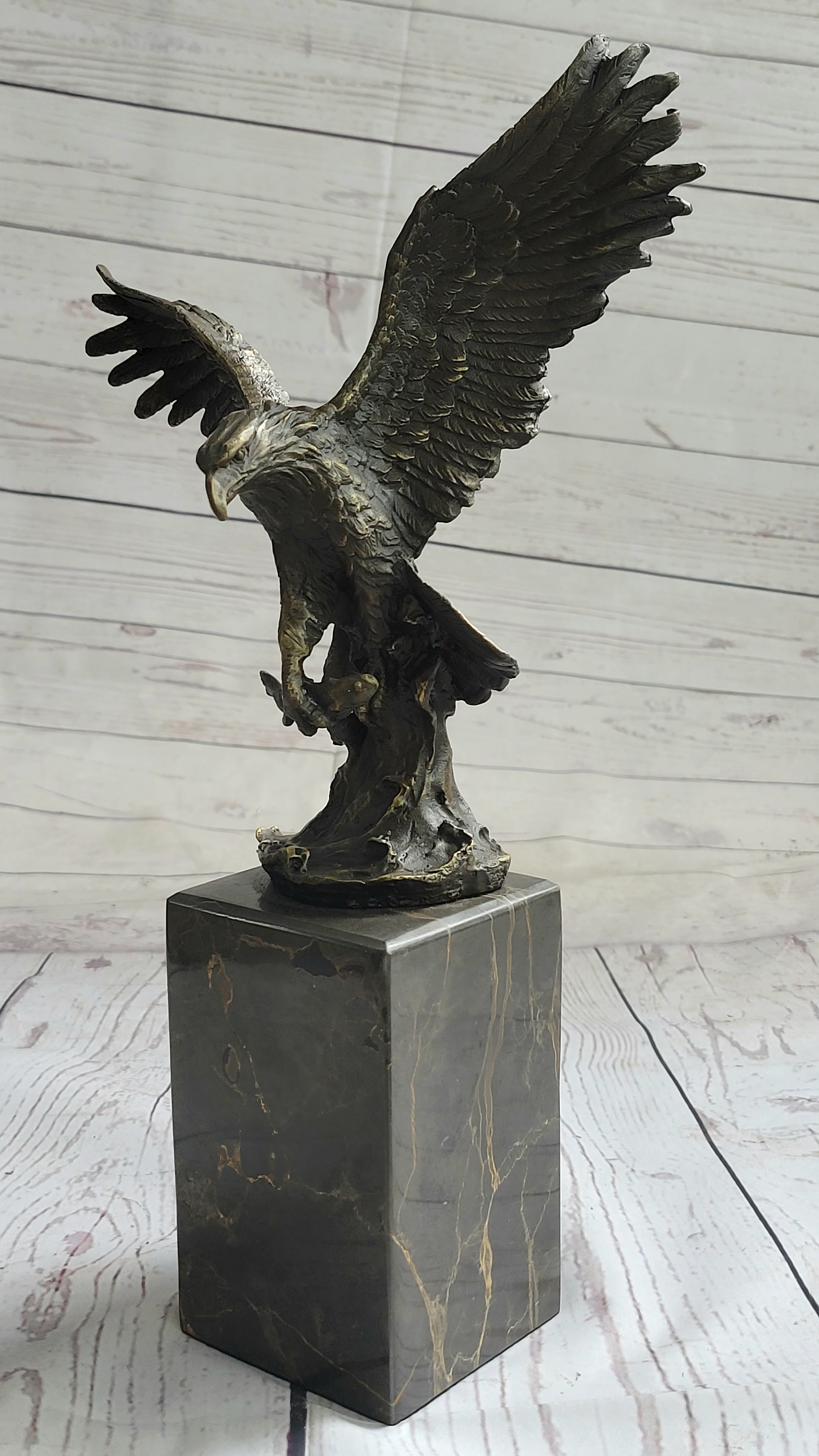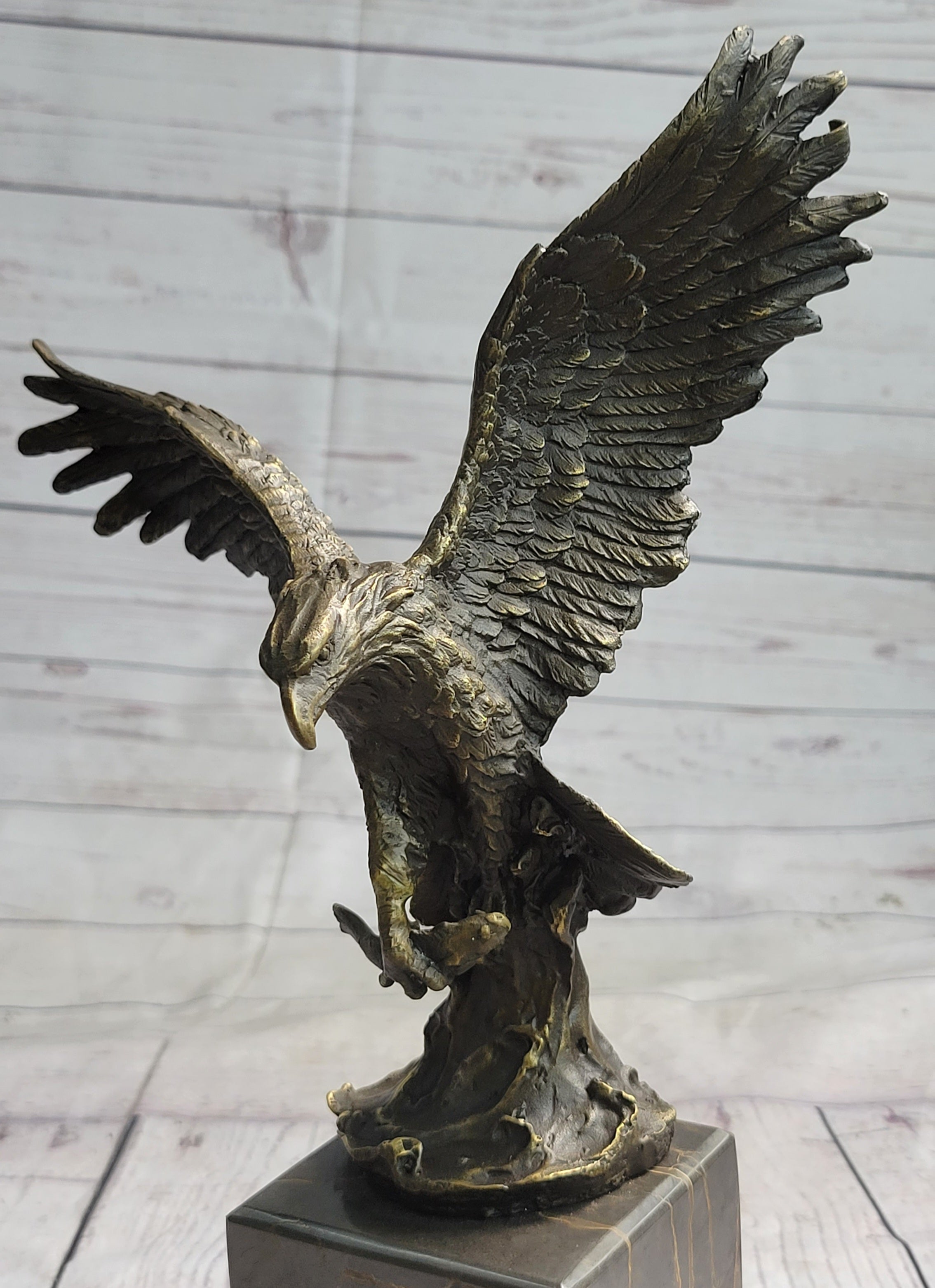Experience the breathtaking prowess of nature's supreme predator with this captivating bronze sculpture. Caught in the dynamic moment of flight, the eagle's wings extend to their fullest span, capturing the essence of its commanding presence. Poised for action, its sharp talons signify both power and precision, while its unyielding gaze fixes on its quarry. The sculpture's intricate details and lifelike form are a testament to the mastery of the "Lost Wax Method," the ancient technique used to cast this bronze masterpiece.