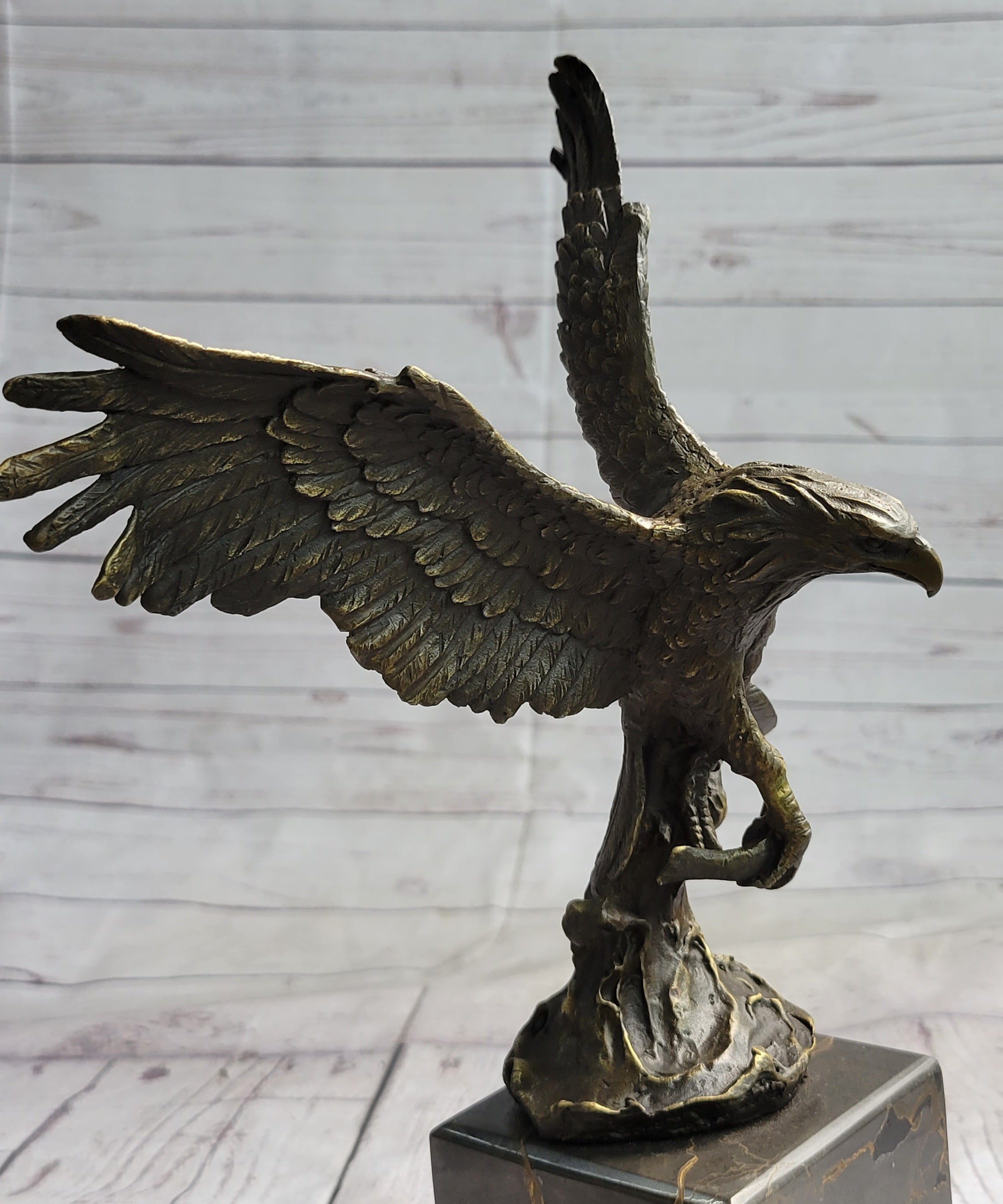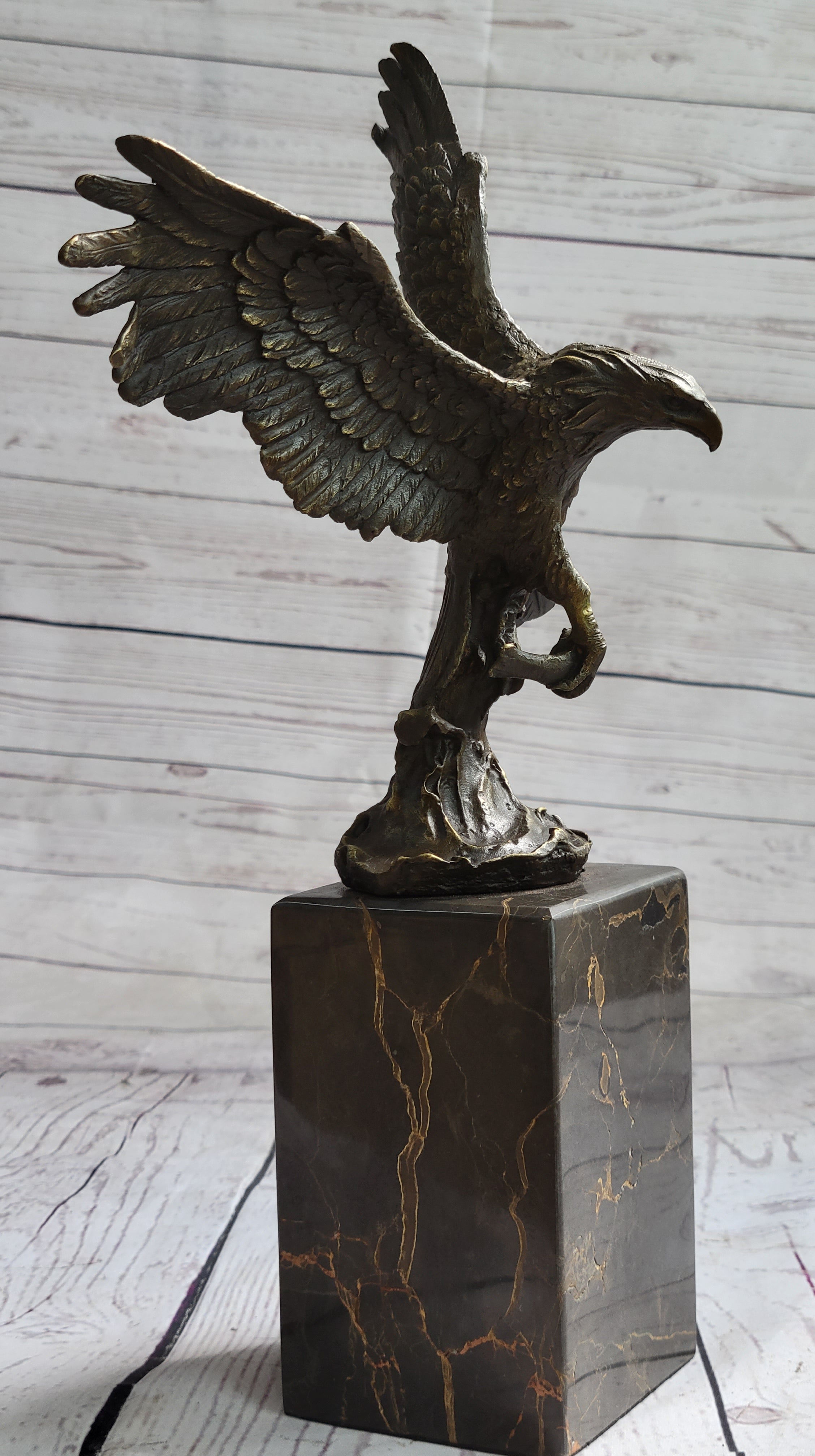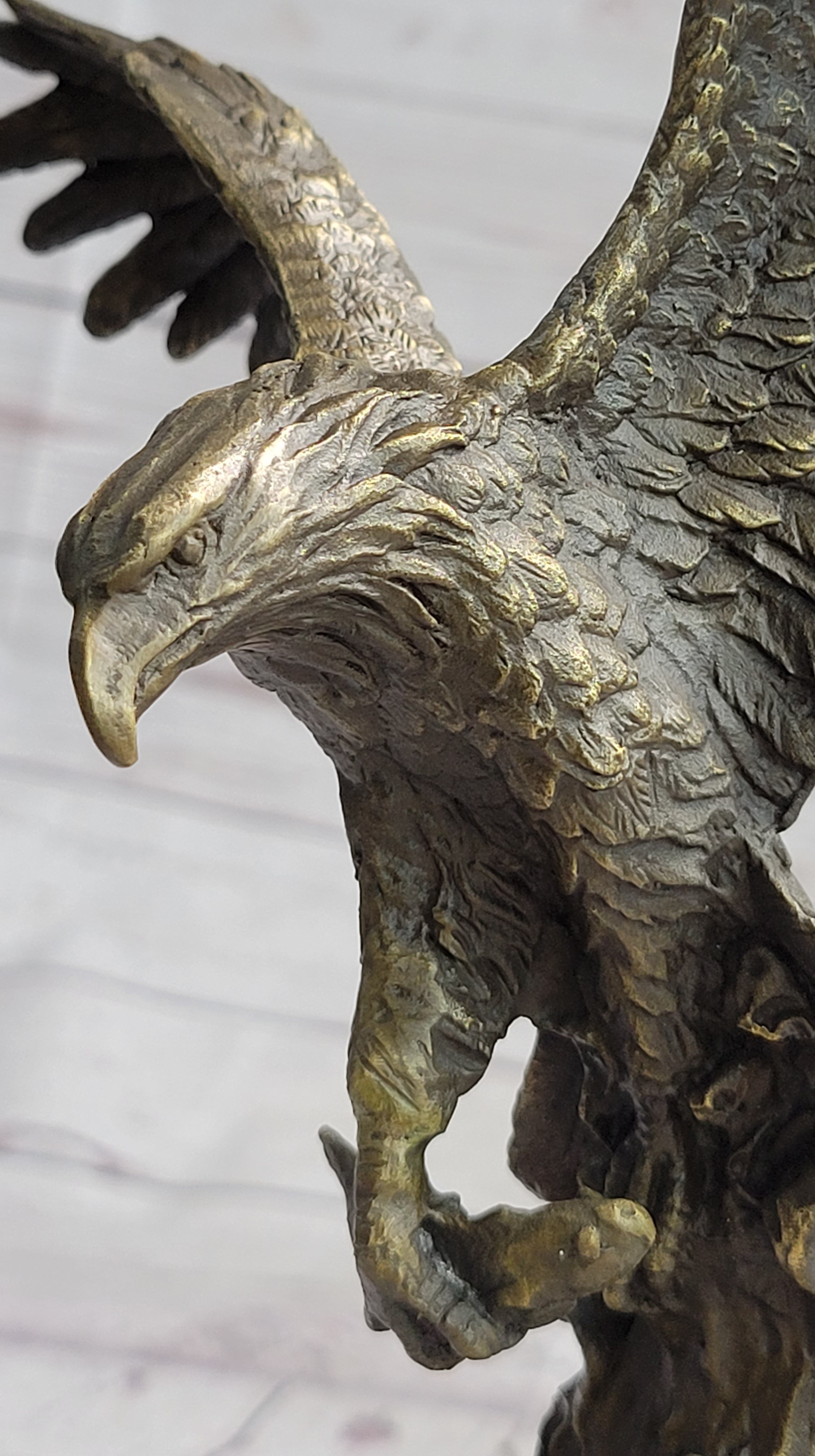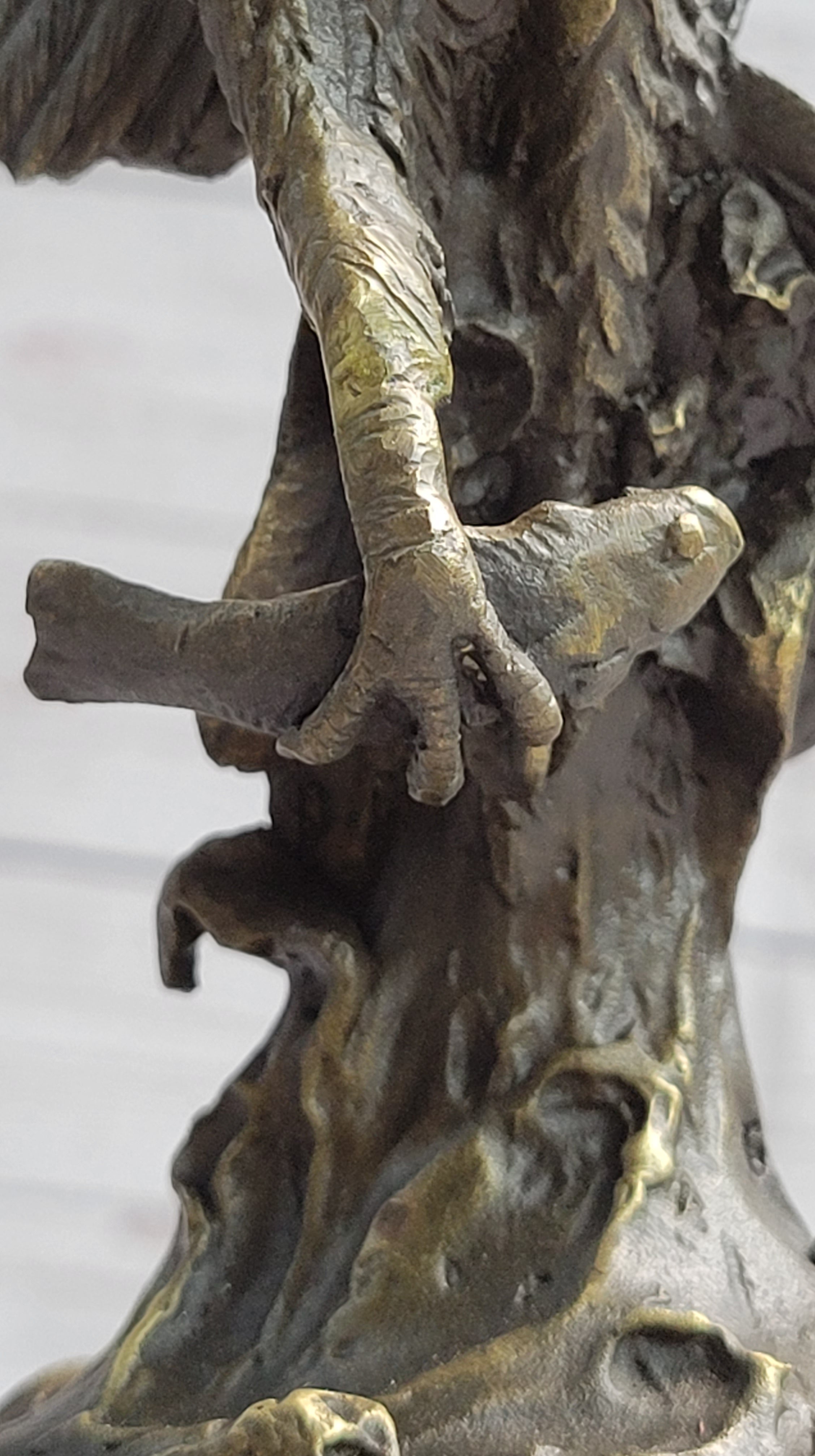 Invoke the spirit of untamed nature and embody the grandeur of the skies with this extraordinary bronze sculpture. Whether gracing a private space or commanding attention in a public setting, its representation of strength, motion, and keen observation makes it a captivating centerpiece for those who appreciate the sublime artistry found in both nature and sculpture.Bronze Dimensions with Marble Base: Height 14" X Width 8"