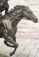 Whether you're a lover of Western art or simply appreciate the craftsmanship and storytelling of this piece, it's a standout addition to any collection or decor. The sculpture bears the signature of the renowned artist Remington, further enhancing its value and quality. Invite the spirit of the Wild West into your home or office with this exceptional bronze sculpture.Bronze Dimensions with Marble Base:14" X 17"