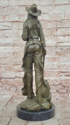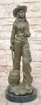 American Western Bronze Cowgirl Sculpture with Rifle and Cowboy Hat