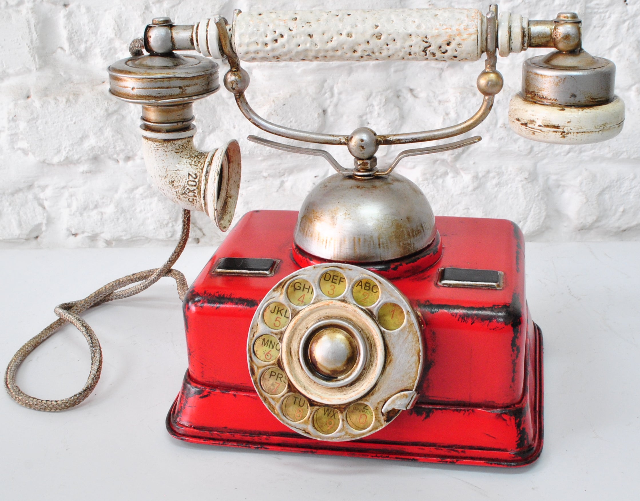 Decorate for any table, desk, or shelf in sporty fashion with Our Rustic Red German Rotary Dial Phone. Featuring a rustic iron frame, this charming vintage Classic Phone includes a fine detail's. The Red and Beige Color metal Exterior are finished in natural colors. For more than 20 years, European Finery has been providing high quality sculpture, accessories, and decor for any room for its customers' homes. Based in New York area, We grown to become one of the largest importers and wholesalers of home decor and hand made sculptures in the country. Whether you're looking for accent Sculpture, wall decor, vintage Toys, or just about any outdoor lifestyle sculpture , We Became a proven and trustworthy name that has become synonymous with superiority