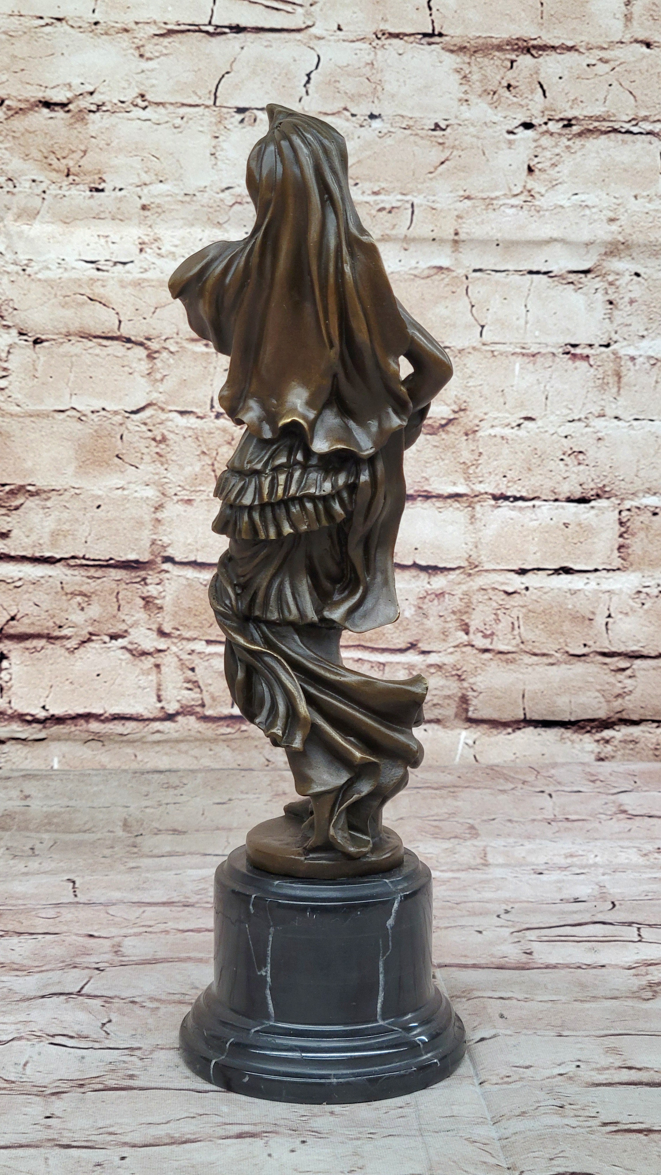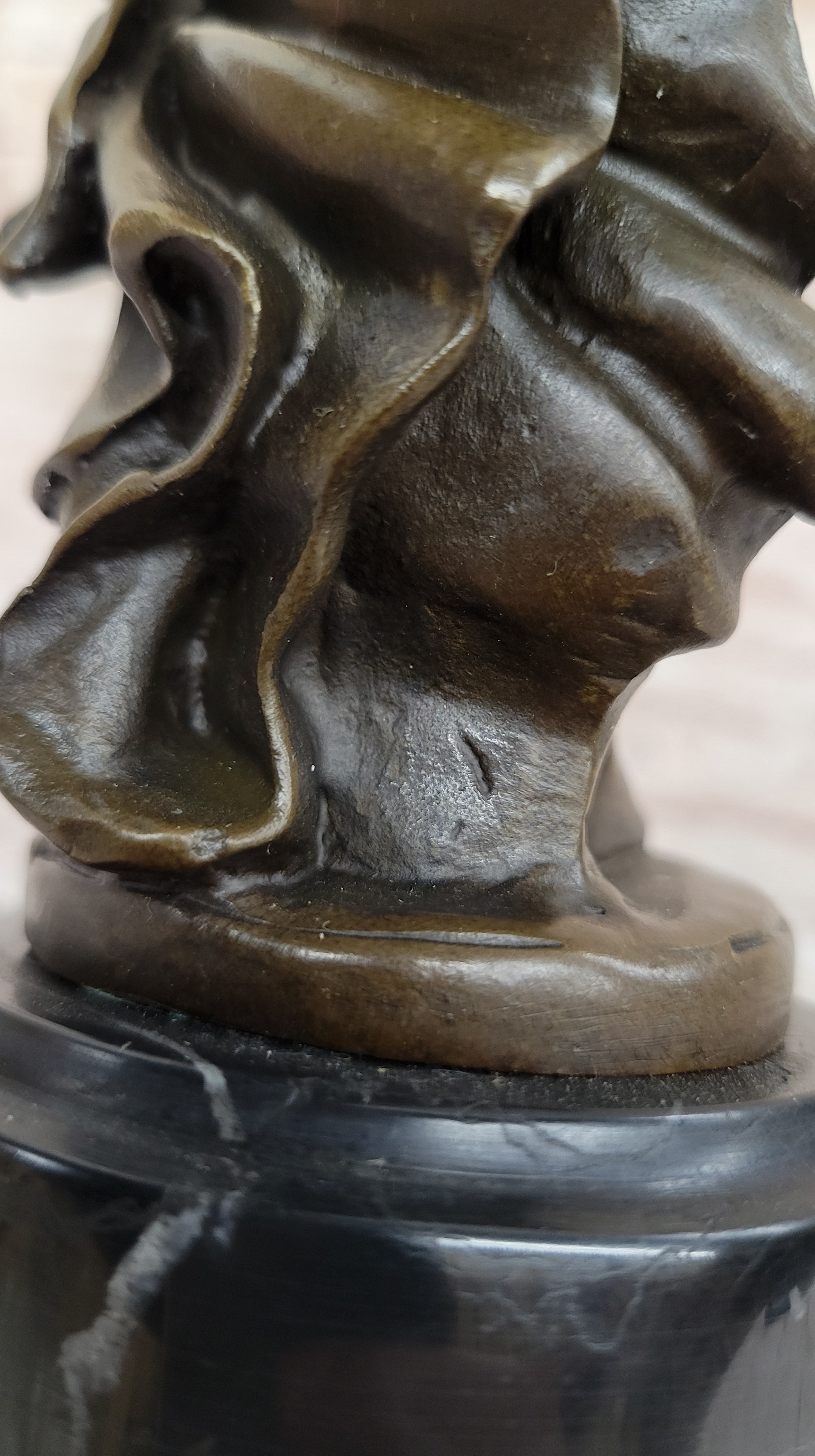 Mounted on a round black marble base, this bronze sculpture becomes a striking centerpiece, blending classical artistry with contemporary elegance. Ideal for art enthusiasts and collectors, this sculpture not only showcases the artist's talent but also invites viewers to appreciate the timeless beauty and craftsmanship embodied in every detail.Bronze Dimensions with Marble Base: Height 13" X Width 4"
