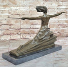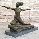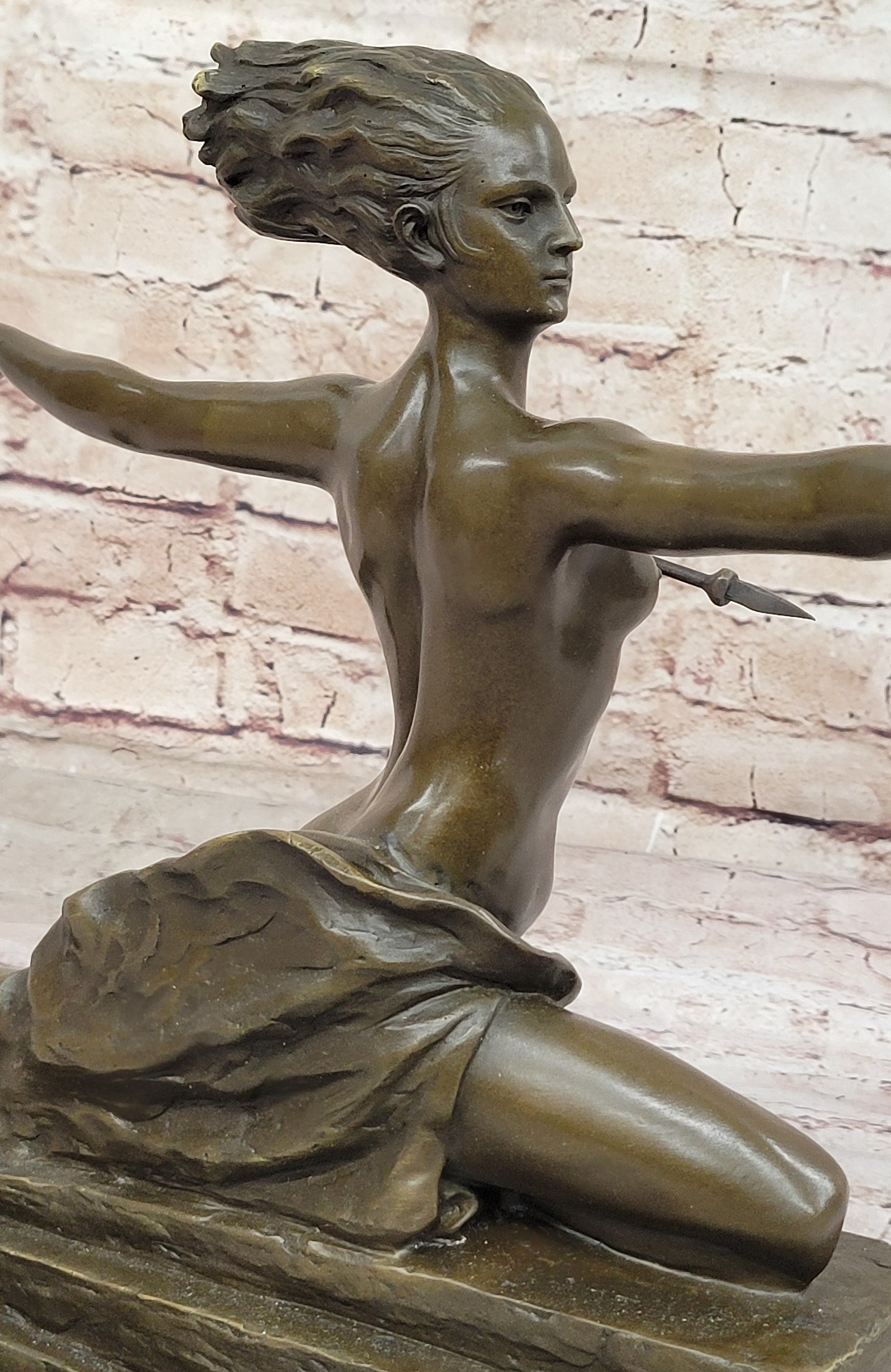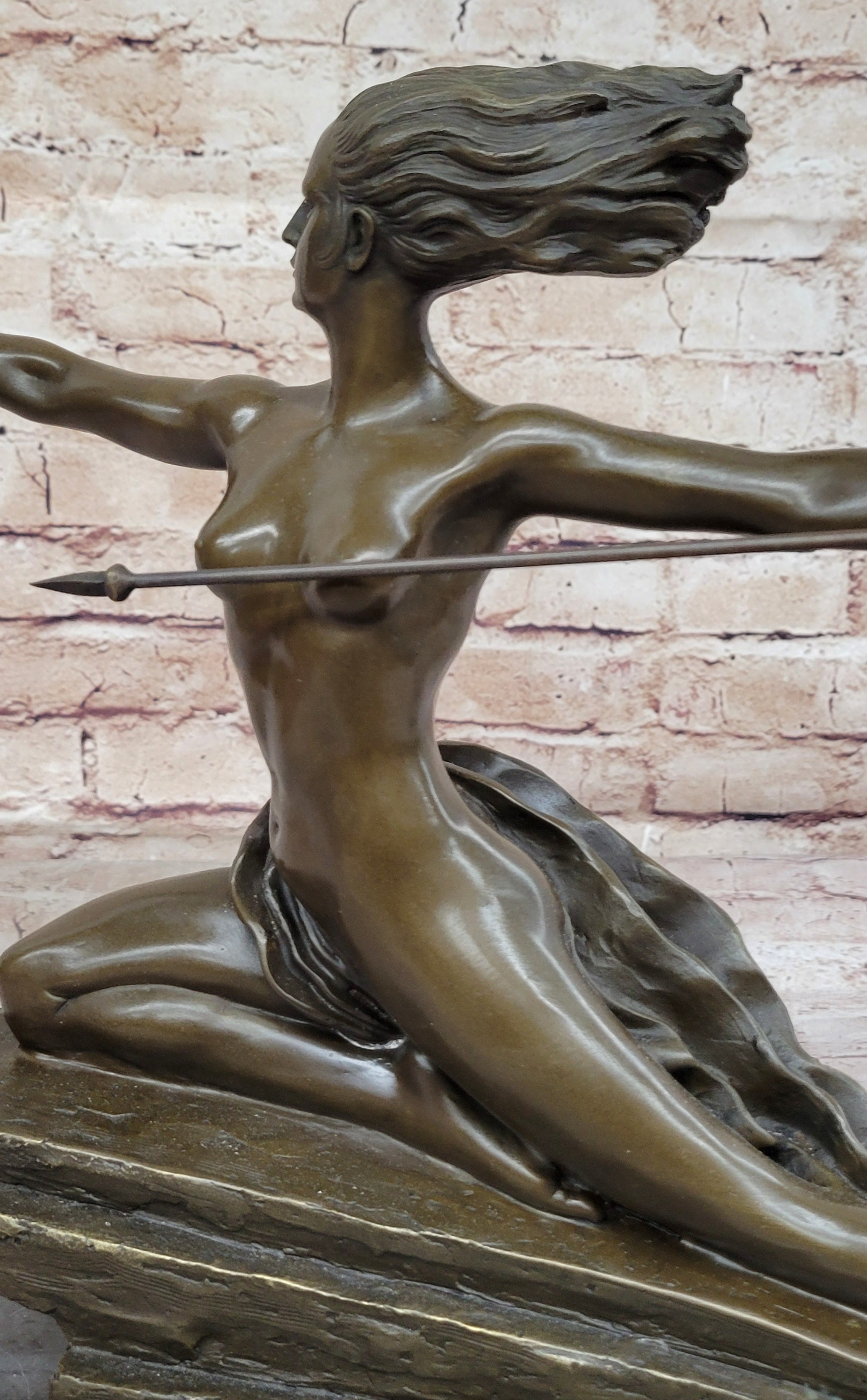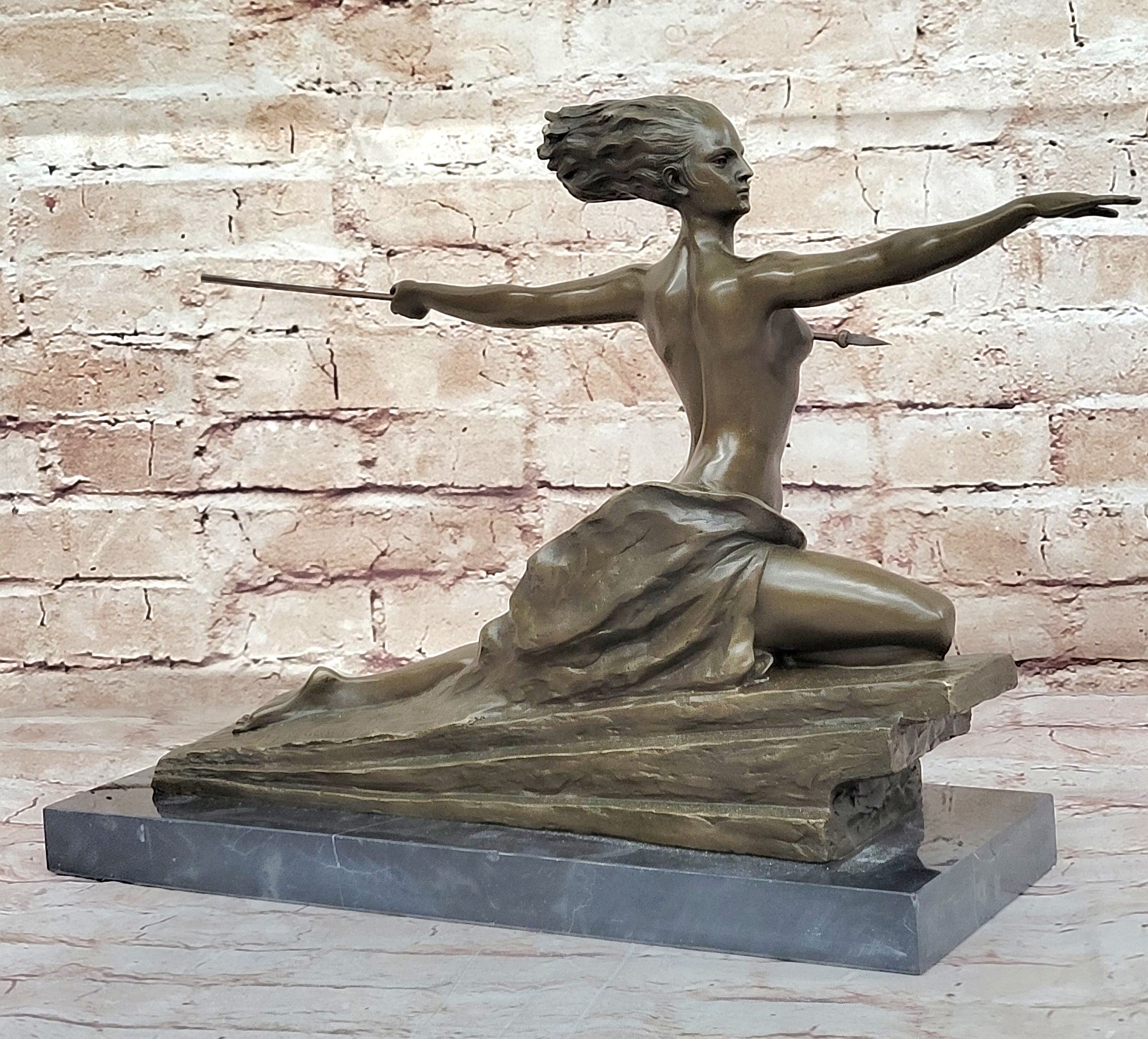The sculpture portrays a scantily clad warrior with windswept hair, wielding a spear, and poised atop a stylized rectangular base. Bouraine's signature is a testament to the authenticity of this exquisite piece, showcasing the artist's mastery in depicting strength and beauty. This Art Deco masterpiece is a stunning representation of Bouraine's contribution to the dynamic and innovative artistic landscape of his time. Height 12 inches, width 15 inches.Bronze Dimensions with Marble Base: Height 12" X Width 20"
