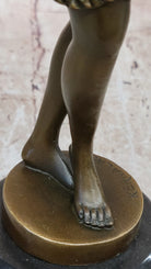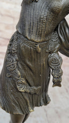 Dressed in a captivating brown patina with a striking green bikini top, matching skirt, and headpiece, the nimble dancer kicks a long, lean leg high in the air. The short mini skirt adds a playful touch, jiggling behind her as she moves to the music. This detailed and expressive sculpture is a testament to the artist's skill, crafted with precision using the traditional "Lost Wax Method."