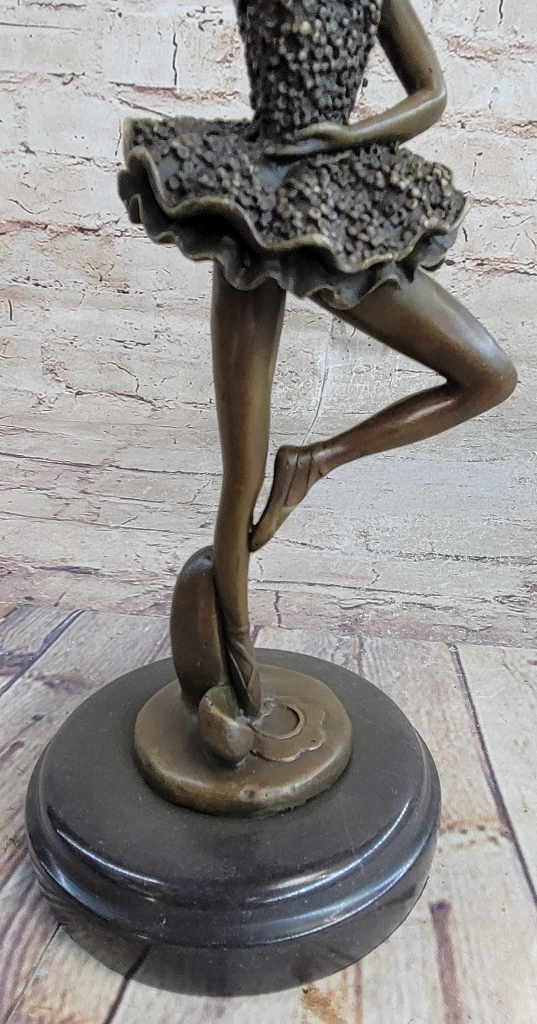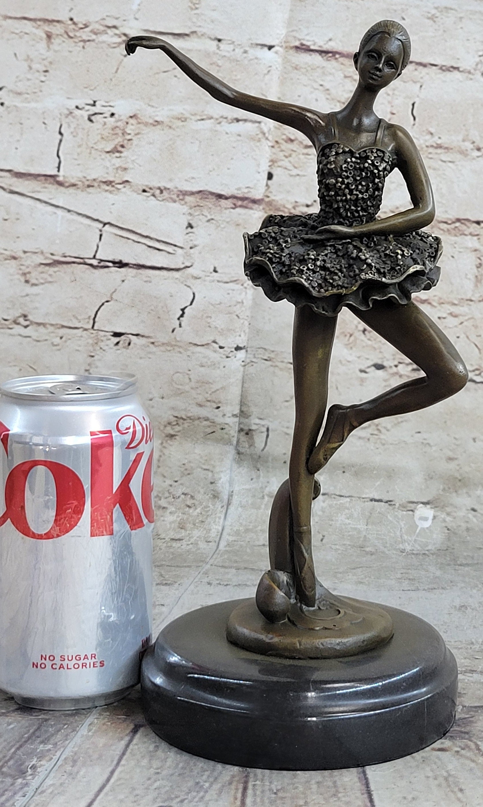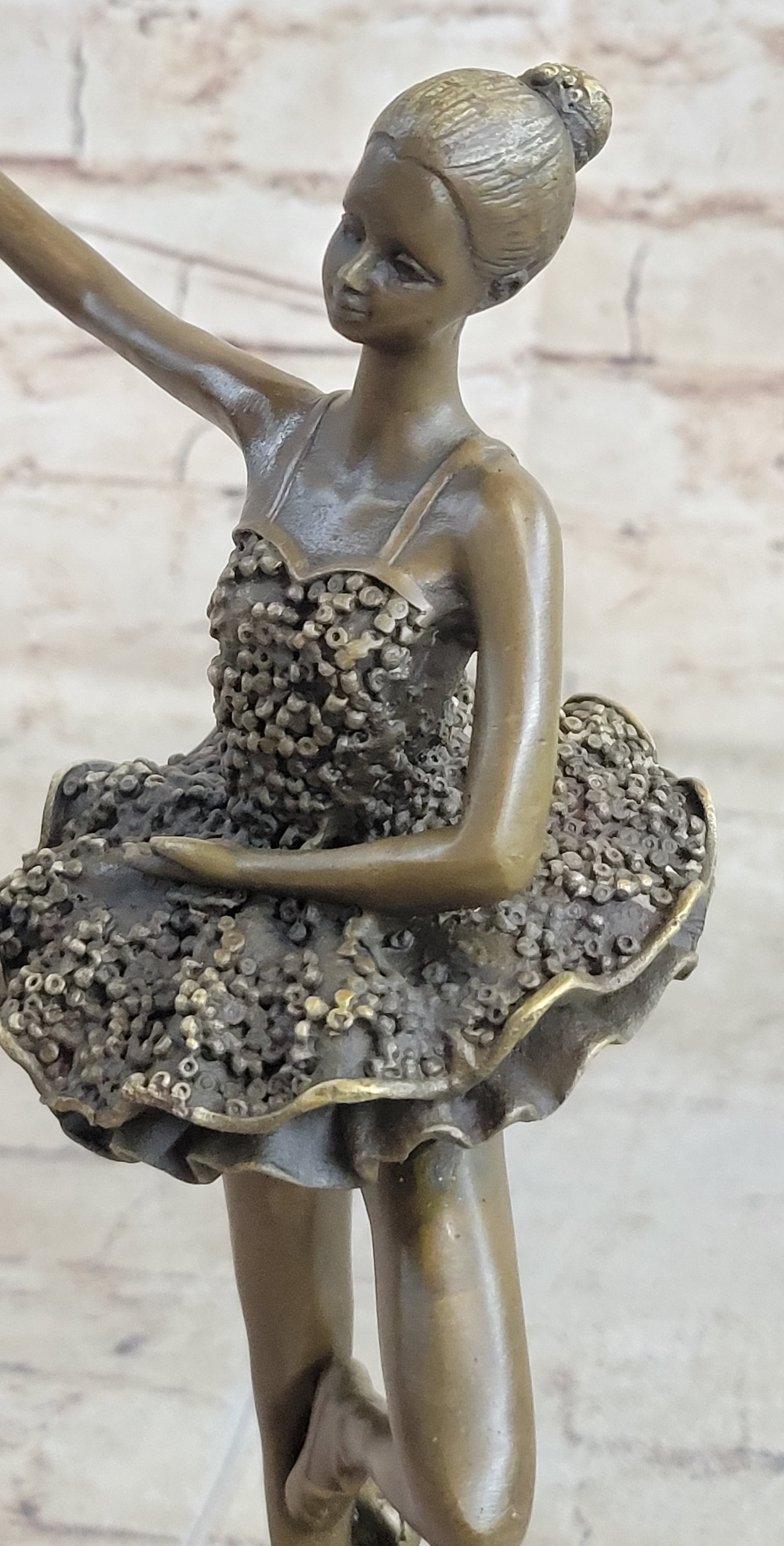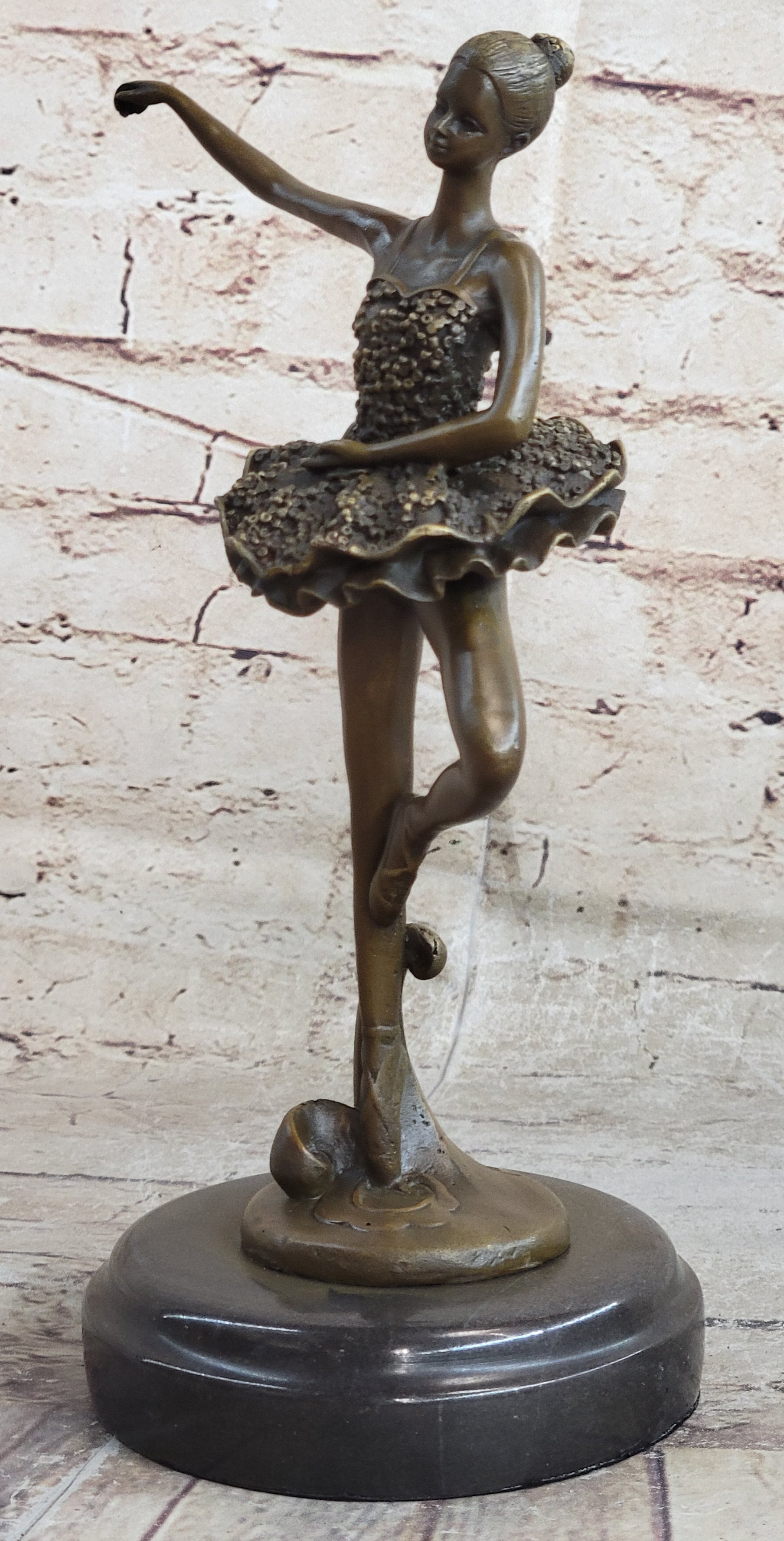 Every movement she makes is deliberate and structured, from the tips of her toes to the tips of her fingers. Her spine curves gracefully, touching her back to her tutu, while her tutu spreads around her hips like a halo, enhancing her ethereal presence. This 100% bronze sculpture, crafted using the revered "Lost Wax Method," captures the essence of the ballerina's performance with authenticity and artistry.