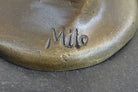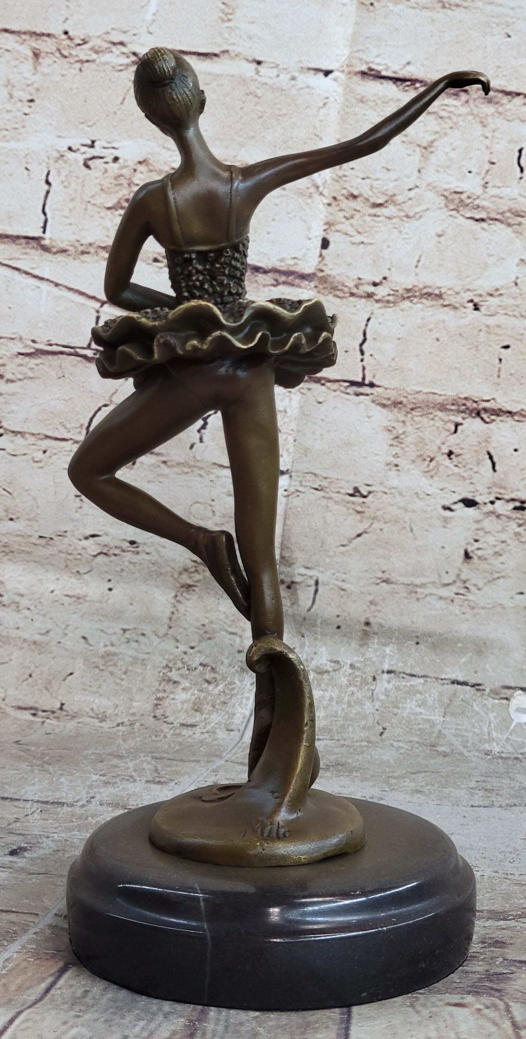 Mounted on a sleek black marble base, this masterpiece bears the signature of the talented artist Milo, a symbol of its genuine craftsmanship and artistry. Whether displayed in an art collection, showcased in a dance enthusiast's space, or as a centerpiece in your home, this prima ballerina bronze sculpture is sure to captivate and inspire all who behold her captivating performance. Celebrate the beauty of dance and the artistry of bronze with this stunning tribute to the world of ballet.Bronze Dimensions with Marble Base: Height 10" X Width 7"