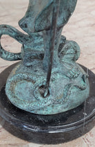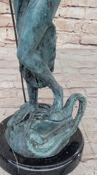 This sculpture was crafted using the age-old method of lost-wax casting and features a Green patina finish, which enhances the statue's overall visual appeal. The sculpture is mounted on a sturdy black marble base, providing it with stability and a visually pleasing display. This stunning piece is a perfect addition to any collection and is sure to inspire and impress all who view it.Bronze Dimensions with Marble Base: Height 19" X Width 12"