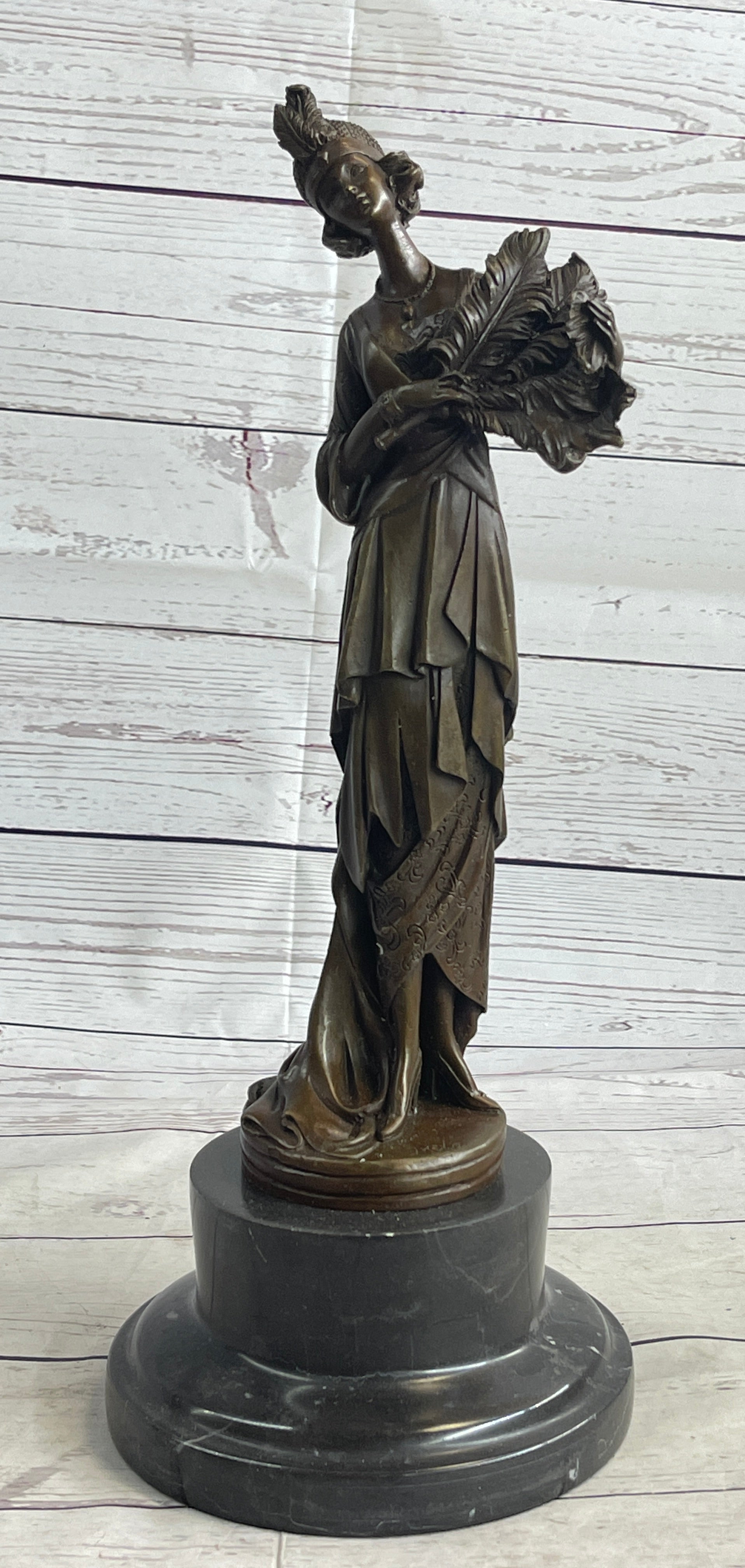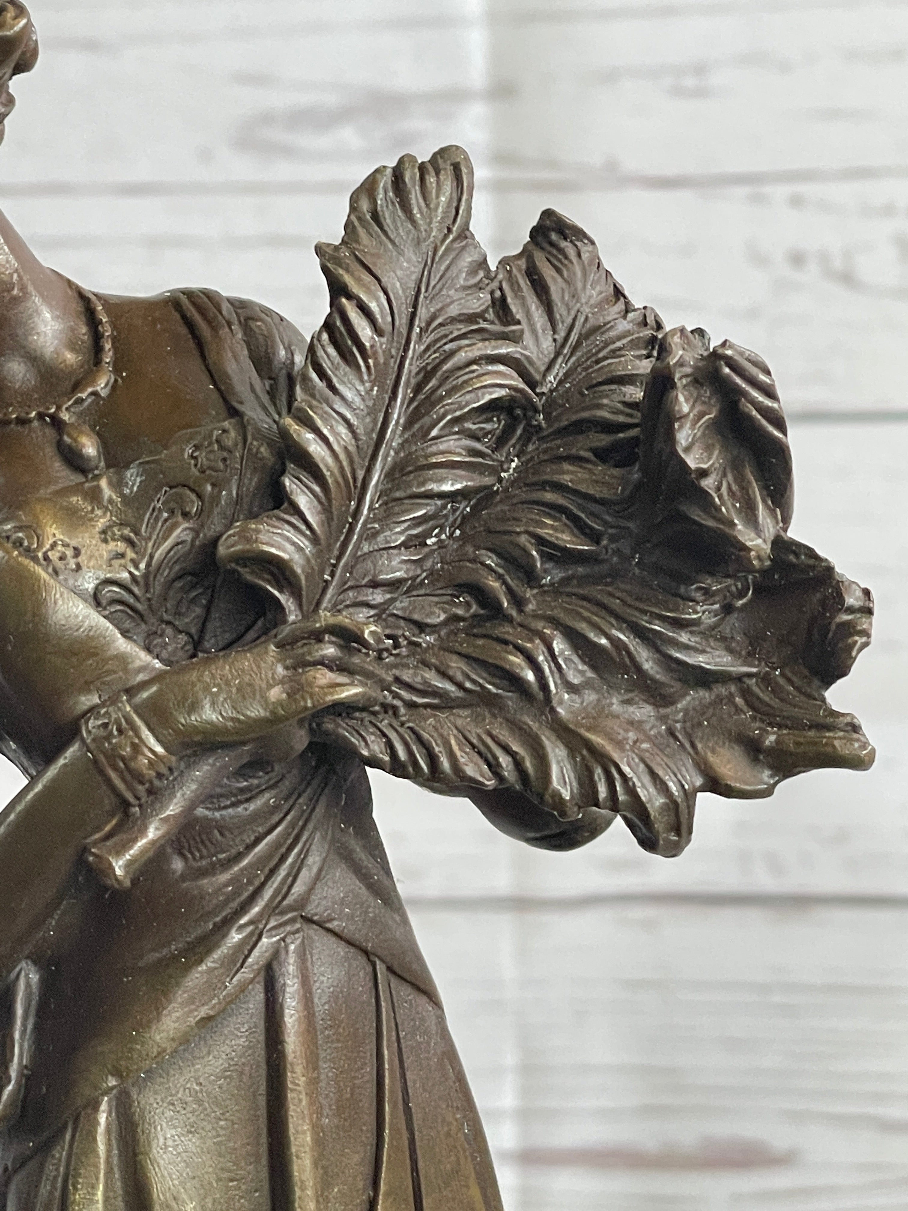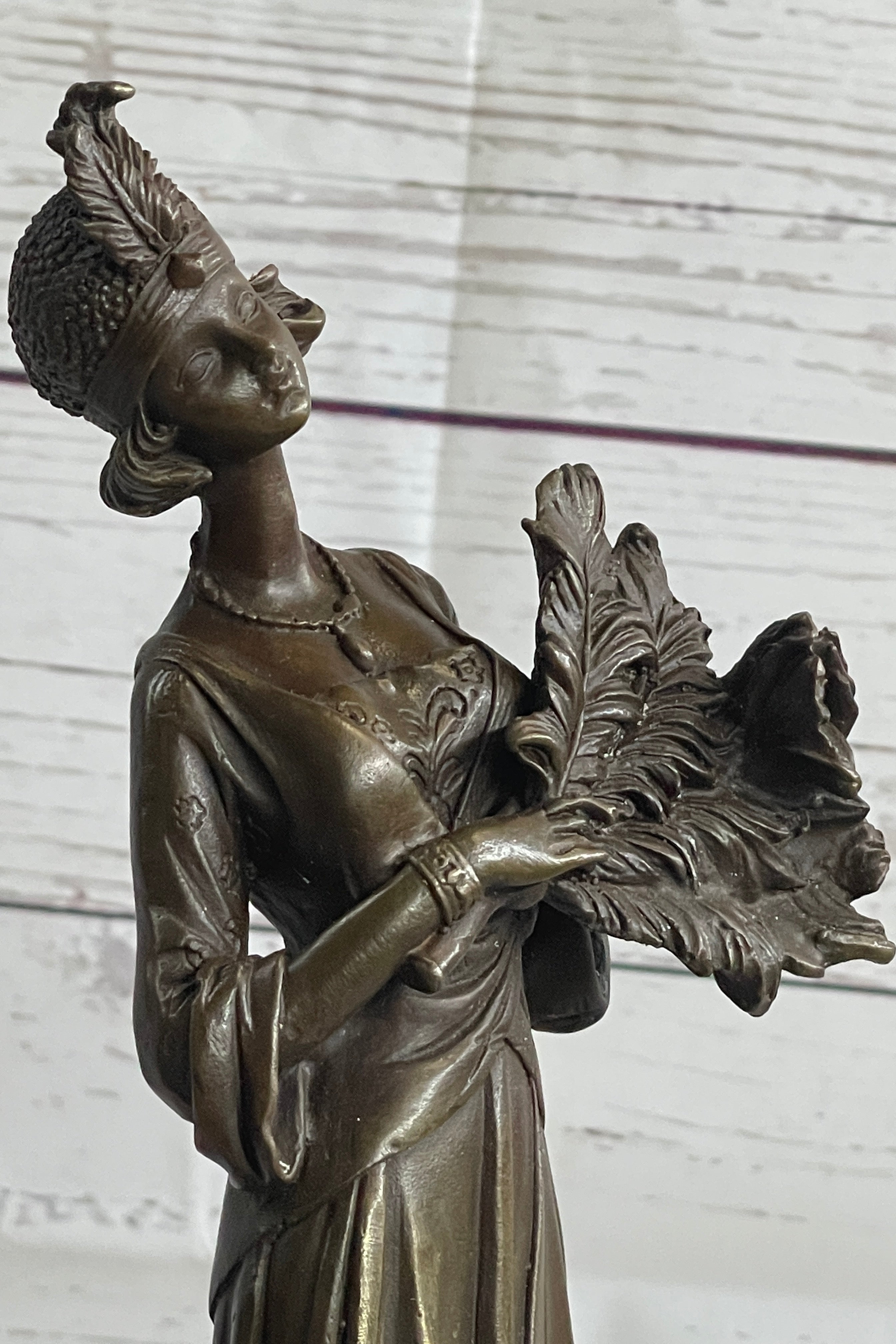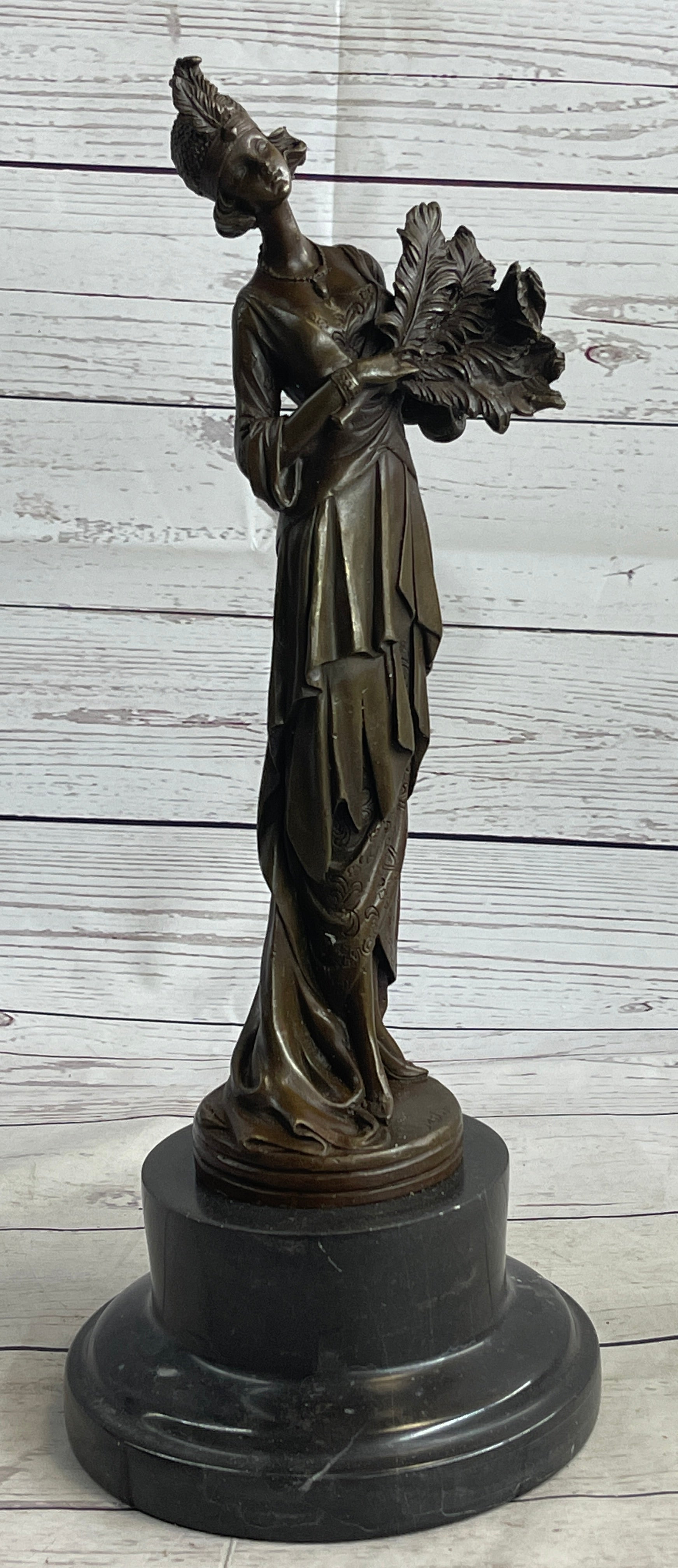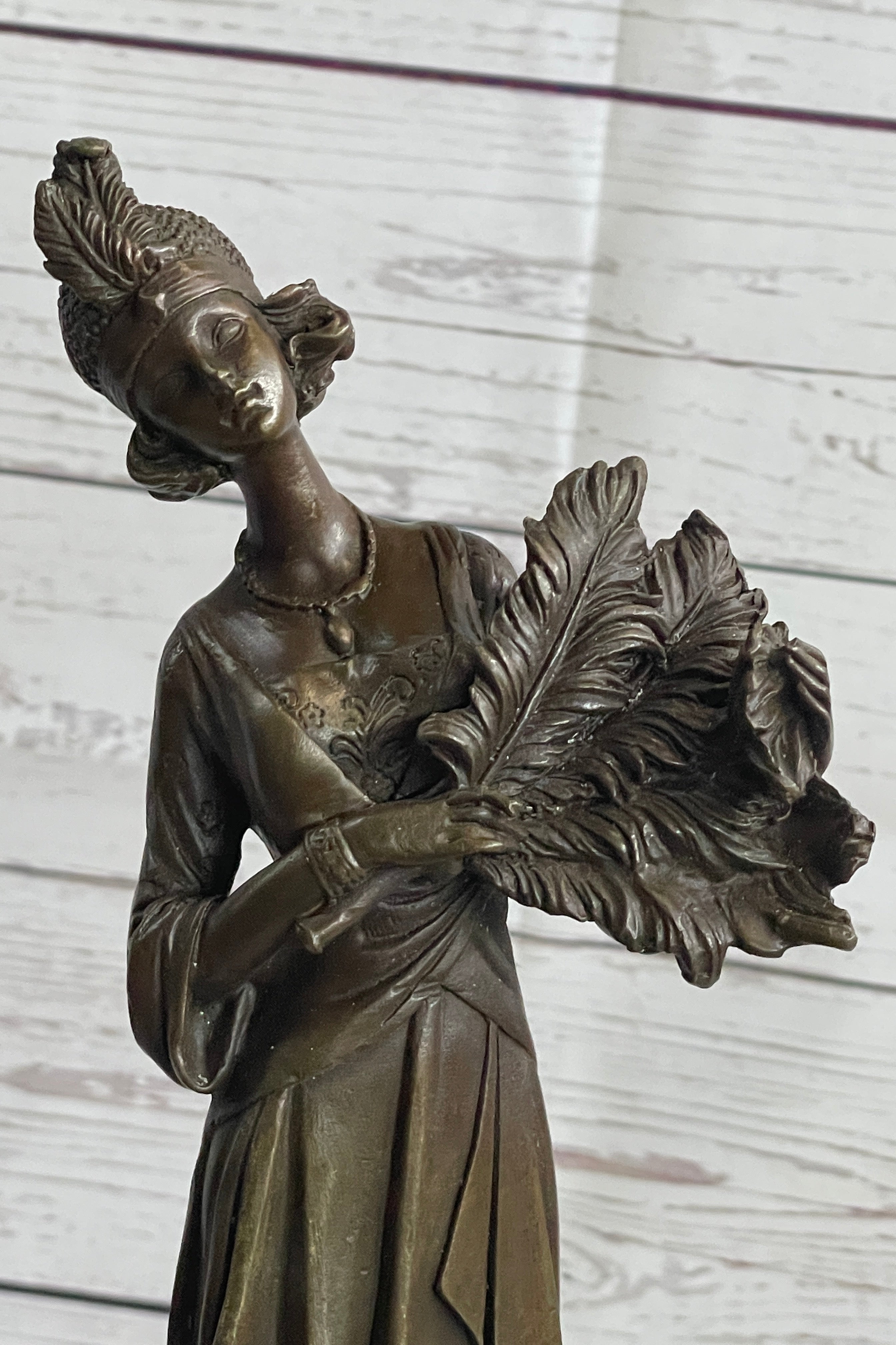 This unique sculpture of a 1920`s woman with four feathers in her right hand standing proudly for the silent era. Her unforgettable dress that drops all the way to the floor from the back, while the front shoes some legs and has so many pretty layer to it. The details on the neck-less, bracelet, and Charleston head band are unbelievably carved perfectly. This is a beautiful bronze sculpture cast using the "Lost Wax Method" and has a gorgeous brown patina. It is mounted on a marble base and is 100% bronze and handmade. This sculpture is signed by the artist Milo.Bronze Dimensions with Marble Base: Height 16" x Width 6"