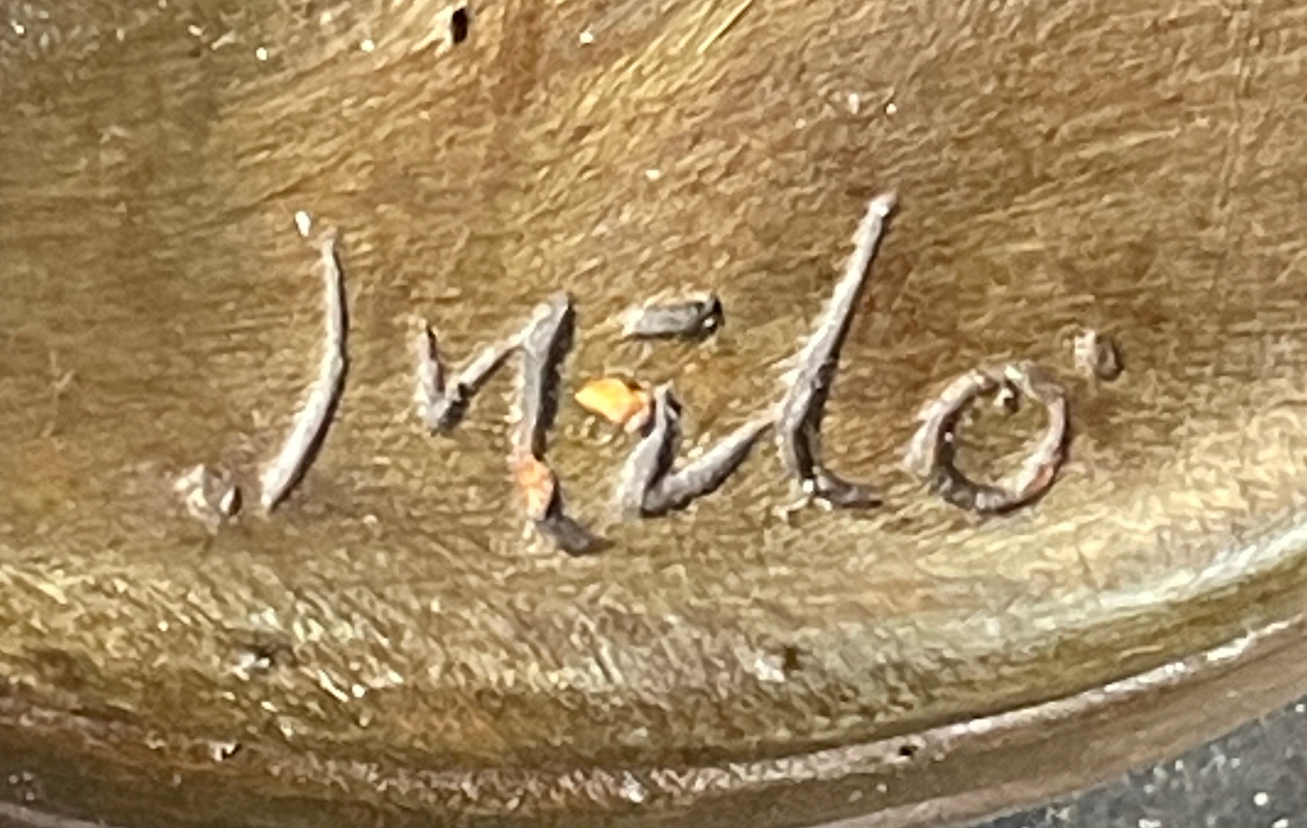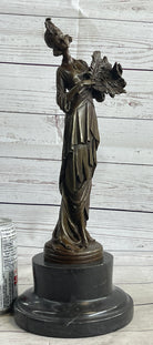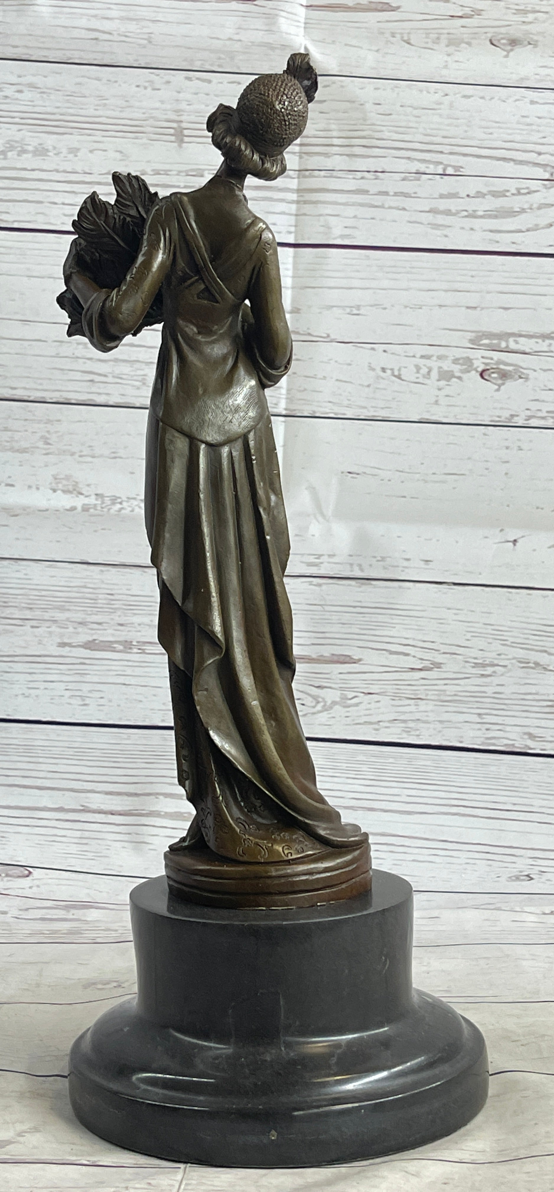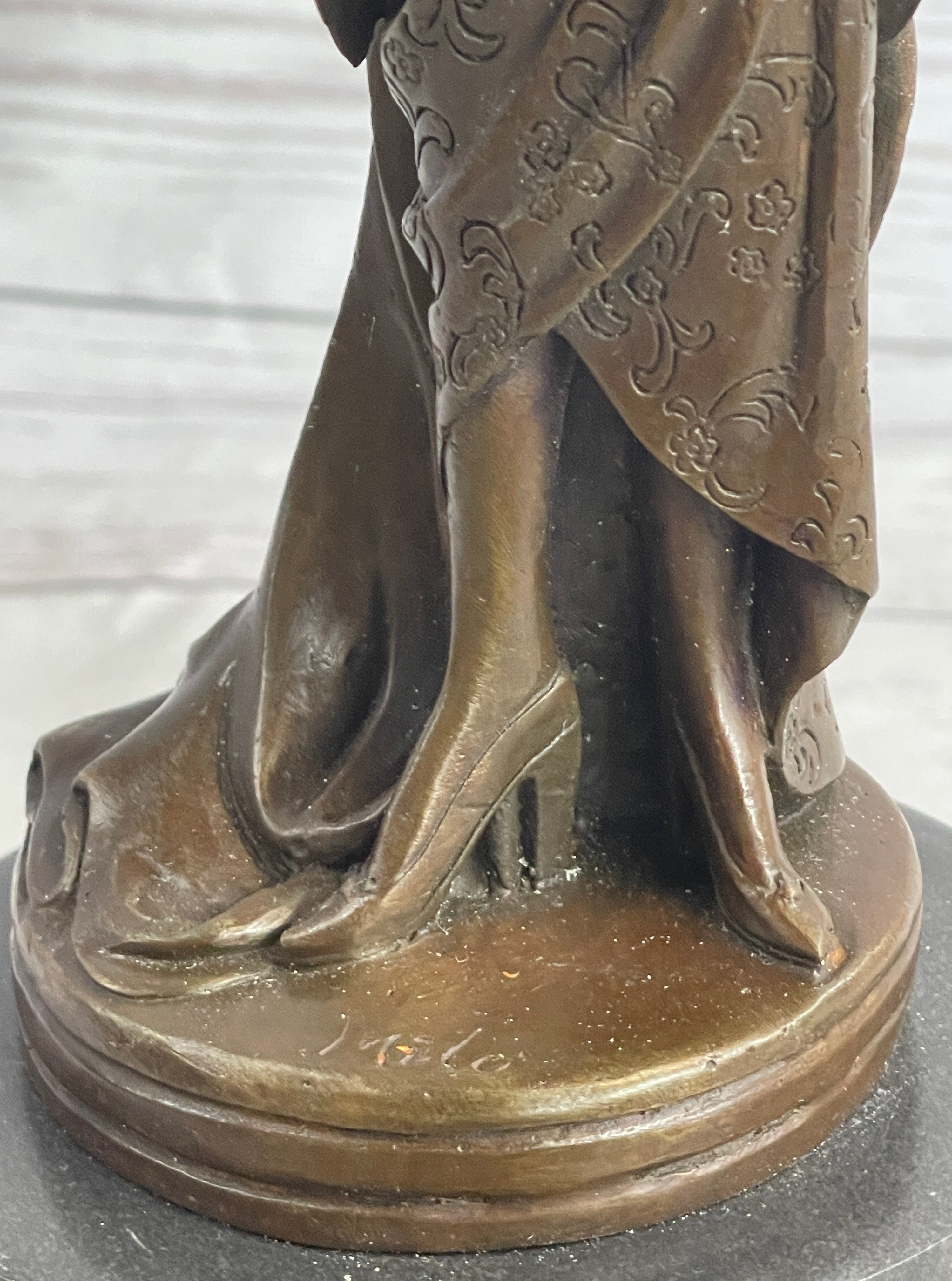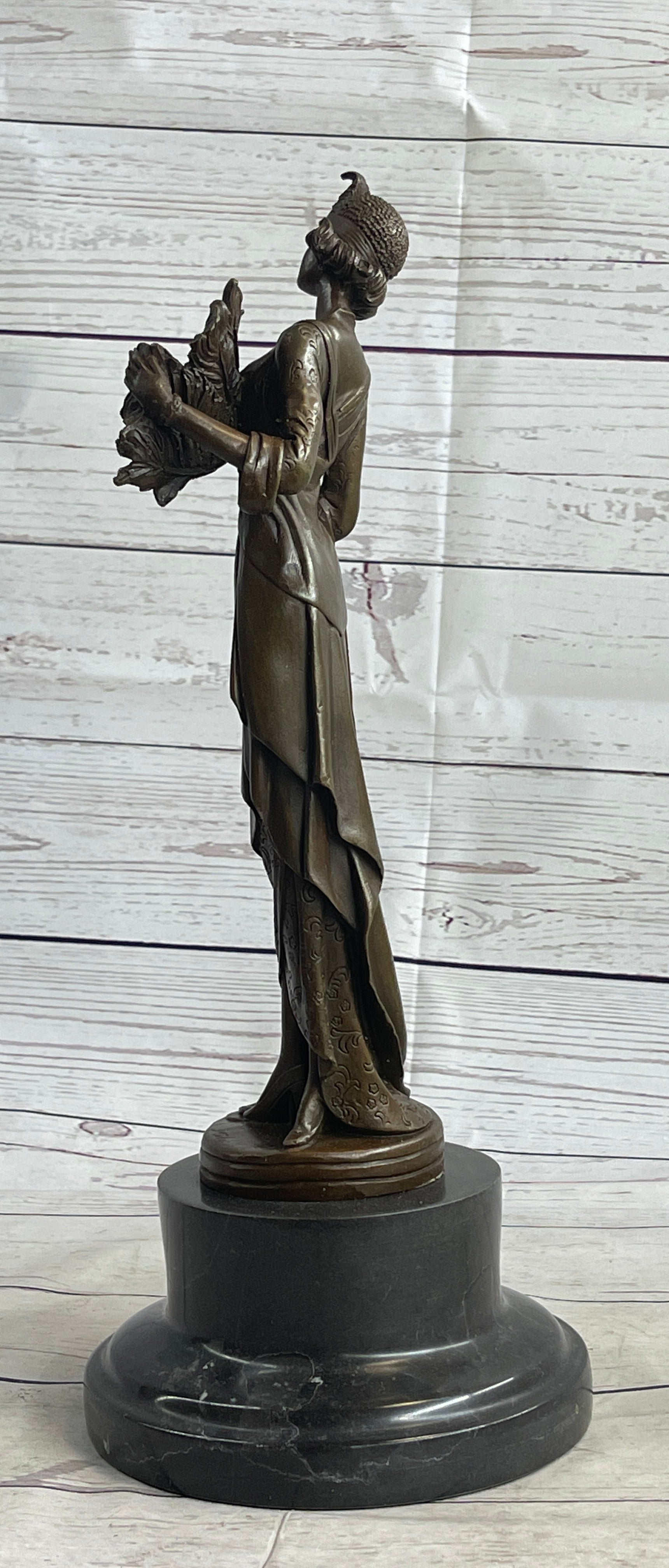 This unique sculpture of a 1920`s woman with four feathers in her right hand standing proudly for the silent era. Her unforgettable dress that drops all the way to the floor from the back, while the front shoes some legs and has so many pretty layer to it. The details on the neck-less, bracelet, and Charleston head band are unbelievably carved perfectly. This is a beautiful bronze sculpture cast using the "Lost Wax Method" and has a gorgeous brown patina. It is mounted on a marble base and is 100% bronze and handmade. This sculpture is signed by the artist Milo.Bronze Dimensions with Marble Base: Height 16" x Width 6"