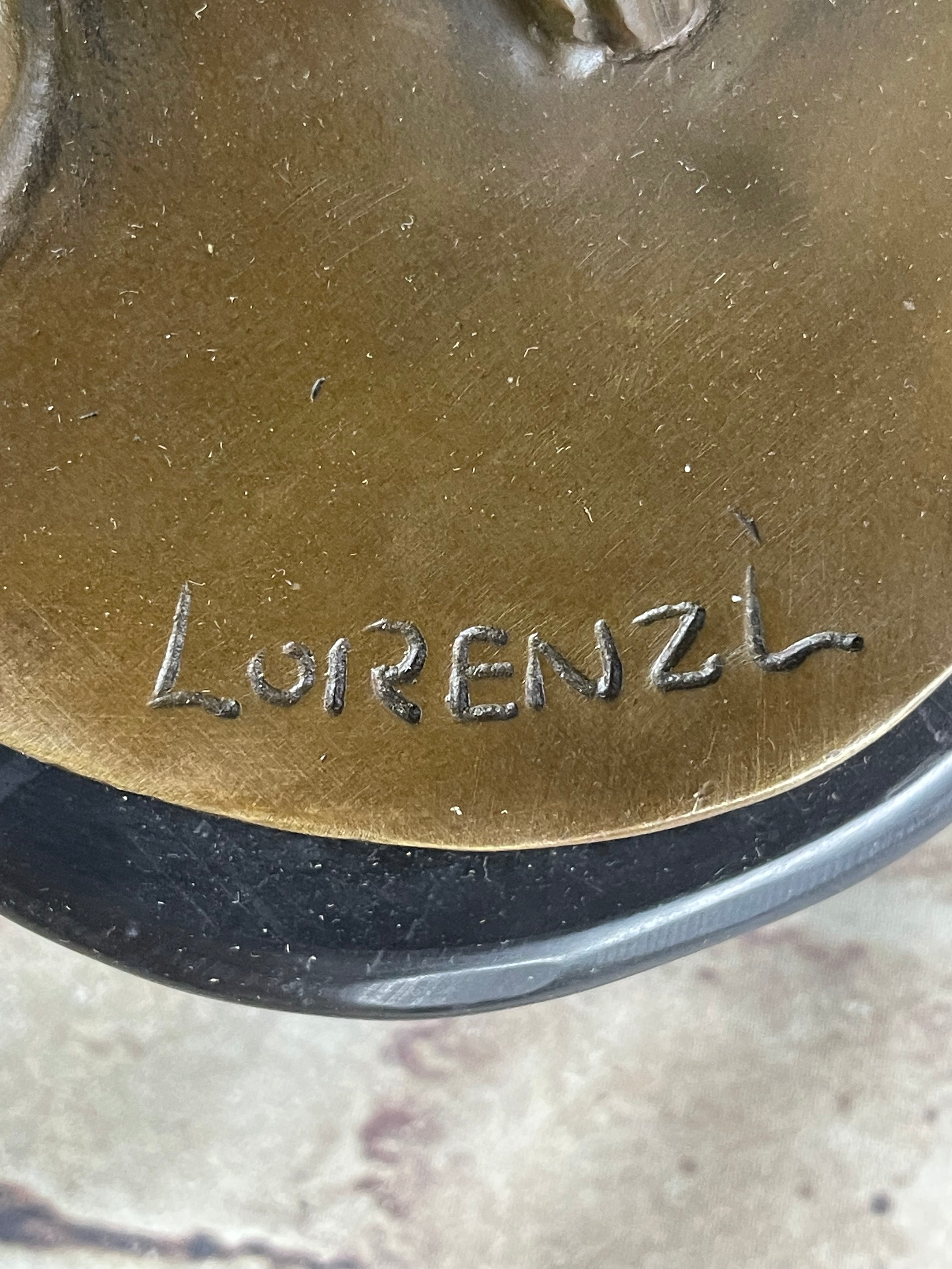 Crafted using the esteemed Lost Wax Method, this handmade bronze sculpture bears the signature of the renowned artist Josef Lorenzl, known for his exceptional Art Deco sculptures. Mounted atop a beautiful black marble base, this sculpture is a testament to Lorenzl's talent and vision, capturing the grace and beauty of the human form with exquisite detail and craftsmanship. It serves as a timeless homage to an era of sophistication and elegance, making it a cherished addition to any art collection or decor.Bronze Dimensions with Marble Base: Height 14.5" X Width 8.5"