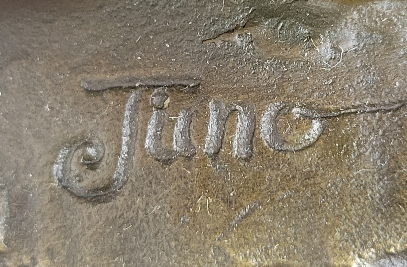 Mounted on a black marble base, the sculpture is elevated to a position of prominence, accentuating its regal presence. The inclusion of the artist Juno's signature adds a personal touch and authenticates the craftsmanship behind this exquisite creation. Whether displayed as a standalone piece or as part of a collection celebrating wildlife art, this lion sculpture invites viewers to marvel at the majestic beauty and primal strength of this iconic jungle predator.Bronze Dimensions with Marble Base: Height 8.5" x Width 13"