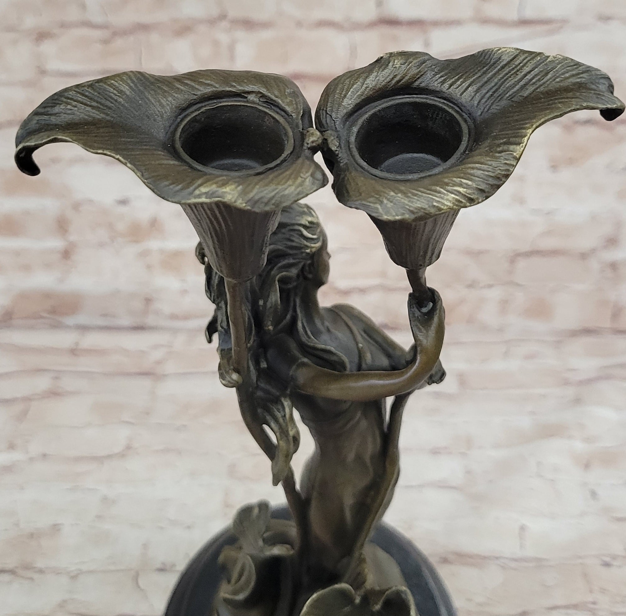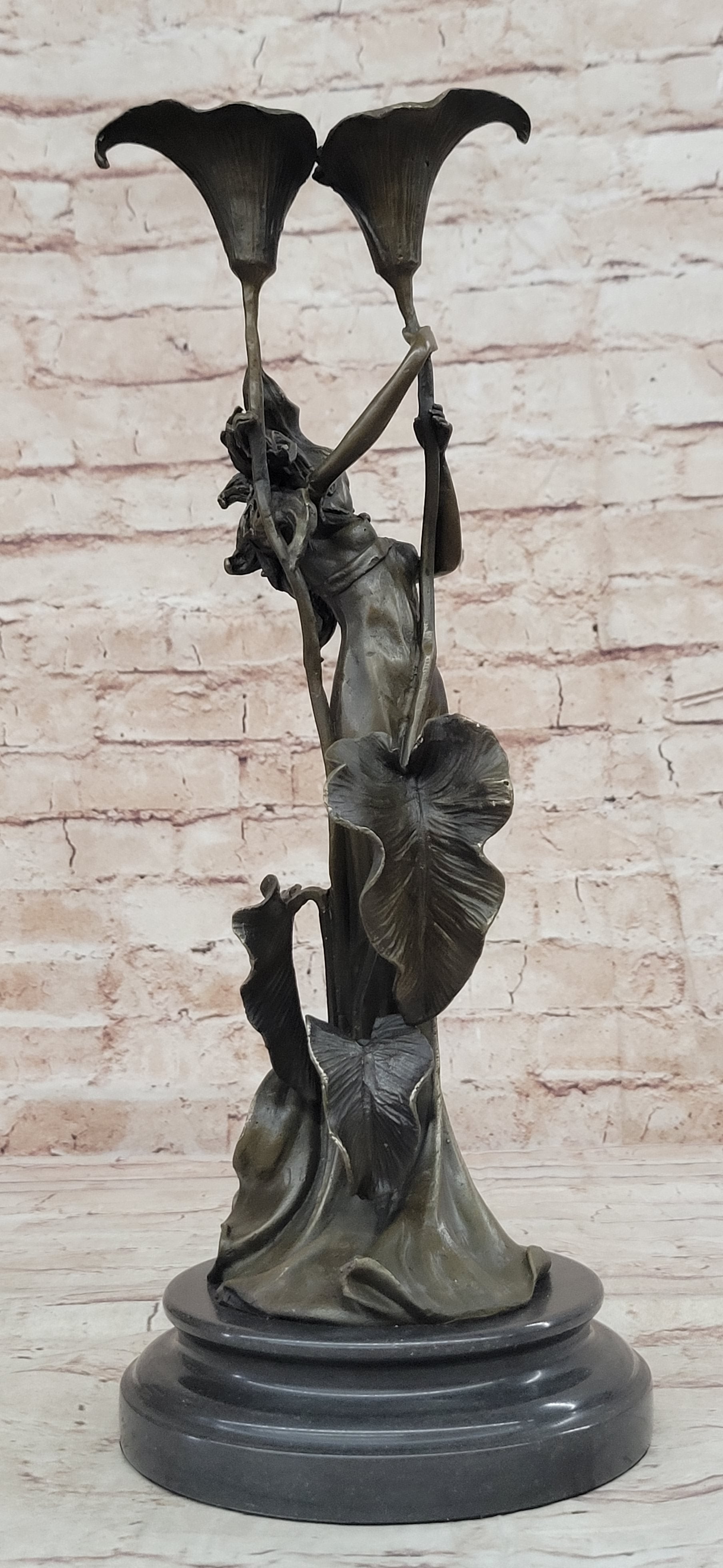 Mounted on a black marble base, this sculpture not only serves as a functional candleholder but also makes a stunning decorative piece. Milo's signature is proudly displayed, attesting to the authenticity of this work of art. Whether displayed in a home, office, or as part of an art collection, the "Tulip Young Girl Candlestick" is sure to captivate and inspire all who behold it.Bronze Dimensions with Marble Base: Height 15" X Width 6"