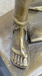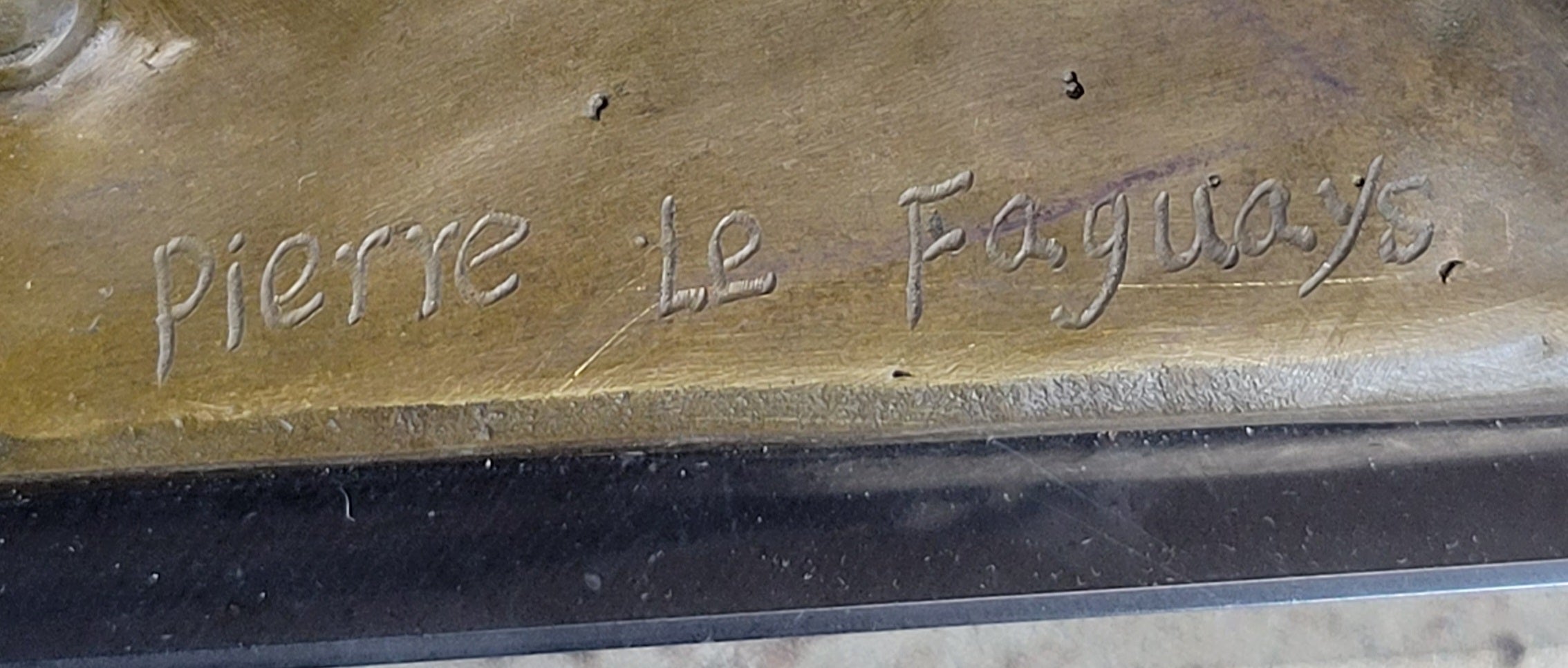 Crafted using the meticulous "Lost Wax Method," this bronze sculpture is a testament to the artist's skill and attention to detail. The brown patina finish enhances the sculpture's depth and adds a sense of timelessness to the artwork. Mounted on a black marble base and signed by Pierre Le Faguays, this piece not only honors the mythological legacy of Diana but also serves as a captivating symbol of feminine power and resilience.Bronze Dimensions with Marble Base: Height 14" X Width 11"